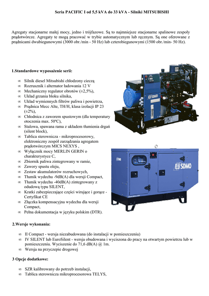 Seria PACIFIC I od 5,5 kVA do 33 kVA - Silniki MITSUBISHI Agregaty stacjonarne małej mocy, jedno i trójfazowe. Są to najmniejsze stacjonarne spalinowe zespoły prądotwórcze. Agregaty te mogą pracować w trybie automatycznym lub ręcznym. Są one oferowane z prądnicami dwubiegunowymi (3000 obr./min - 50 Hz) lub czterobiegunowymi (1500 obr./min- 50 Hz). 1.Standardowe wyposaŜenie serii: • • • • • • • • • • • • • • • • • • Silnik diesel Mitsubishi chłodzony cieczą Rozrusznik i alternator ładowania 12 V Mechaniczny regulator obrotów (±2,5%), Układ grzania bloku silnika, Układ wymiennych filtrów paliwa i powietrza, Prądnica Mecc Alte, TH/H, klasa izolacji IP 23 (±2%), Chłodnica z zaworem spustowym (dla temperatury otoczenia max. 50ºC), Stalowa, spawana rama z układem tłumienia drgań (silent block), Tablica sterownicza - mikroprocesorowy, elektroniczny zespół zarządzania agregatem prądotwórczym MICS NEXYS , Wyłącznik mocy MERLIN GERIN o charakterystyce C, Zbiornik paliwa zintegrowany w ramie, Zawory spustu oleju, Zestaw akumulatorów rozruchowych, Tłumik wydechu -9dB(A) dla wersji Compact, Tłumik wydechu -40dB(A) zintegrowany z odudową typu SILENT, Kratki zabezpieczające części wirujące i gorące Certyfikat CE Złączka kompensacyjna wydechu dla wersji Compact, Pełna dokumentacja w języku polskim (DTR). 2.Wersje wykonania: • • • II Compact - wersja niezabudowana (do instalacji w pomieszczeniu) IV SILENT lub EuroSilent - wersja obudowana i wyciszona do pracy na otwartym powietrzu lub w pomieszczeniu. Wyciszenie do 71,6 dB(A) @ 1m. Wersja na przyczepie drogowej 3 Opcje dodatkowe: • • SZR kalibrowany do potrzeb instalacji, Tablica sterownicza mikroprocesorowa TELYS, • • • • • • • Panele monitorujące stany agregatu i moduł przekaźnikowy umoŜliwiający transmisję danych na zewnątrz, Zabezpieczenia roŜnicowoprądowe (30 lub 300mA), Wanny retencyjne w ramie agregatu, Dodatkowe zbiorniki paliwa na 500, 1000 i 1500 L osadzone na zbiorniku retencyjnym, automatyczne pompy uzupełniające poziom paliwa w zbiorniku agregatu, Tłumiki wydechu 29 dB(A) i 40 dB(A) Gniazda jedno i trójfazowe, Inne opcje : prosimy o konsultacje. PACIFIC I 5,5 - 33 kVA, silnik MITSUBISHI, 400/230V - 50 Hz Obroty 3000 rpm 1500 rpm Symbol Moc agregatu kVA Wymiary(m)/waga Wymiary(m)/waga Zbiornik paliwa(L)/ Typ silnika przy cos φ agregat agregat autonomia pracy MITSUBISHI 0,8 nieobudowany obudowany (75% L/h) P.R.P. E.S.P. T15HK L3E SDH - 15 1,41x0,72x1,03 294 kg 1,75x0,72x1,23 535 kg 50/ 4,2 T20HK S3L2 SDH - 20 1,41x0,72x1,05 386 kg 1,75x0,72x1,23 534 kg 50/ 5,5 T27HK S4L2 SDH - 27 1,41x0,72x1,10 460 kg 2,06x0,9x1,42 780 kg 100/ 6,3 T7,5K L3E SD 6,8 7,5 1,41x0,72x1,03 307 kg 1,75x0,72x1,23 455 kg 50/ 1,7 T11,5K S3L2 SD 10,5 11,5 1,41x0,72x1,05 387 kg 1,75x0,72x1,23 535 kg 50/ 2,5 T16K S4L2 SD 14,5 16 1,41x0,72x1,05 427 kg 1,75x0,72x1,23 575 kg 50/ 3,4 T22K S4Q2 SD 20 22 1,70x0,89x1,12 560 kg 2,06x0,91x1,42 790 kg 100/ 4,7 T33K S4S.SDD 30 33 1,70x0,89x1,14 660 kg 2,08x0,96x0,89 890 kg 100/ 6 PACIFIC I 11,5 - 17 kVA, 230V - 50 Hz L3E SDH - 11,5 1,41x0,72x1,03 318 kg 1,75x0,72x1,23 466 kg 50/ 4,2 T5,5KM L3E SD 5 5,5 1,41x0,72x1,03 307 kg 1,75x0,72x1,23 455 kg 50/ 1,7 T9KM S3L2 SD 7,8 8,6 1,41x0,72x1,05 417 kg 1,75x0,72x1,23 565 kg 50/ 2,5 T12KM S4L2 SD 11 12,1 1,41x0,72x1,06 450 kg 1,75x0,72x1,23 600 kg 50/ 3,4 T17KM S4Q2 SD 15,6 17,2 1,70x0,89x1,12 580 kg 2,06x0,91x1,42 810 kg 100/ 4,7 3000 rpm T11,5HKM 1500 rpm LEGENDA - oznaczenie symboli: T 15 HK 1. T - MITSUBISHI 2. 15 - Moc E.S.P. 3. H - 3000 obr./min. 4. K - Silnik z certyfikatem TA LUFT 5. M - 1 fazowy
