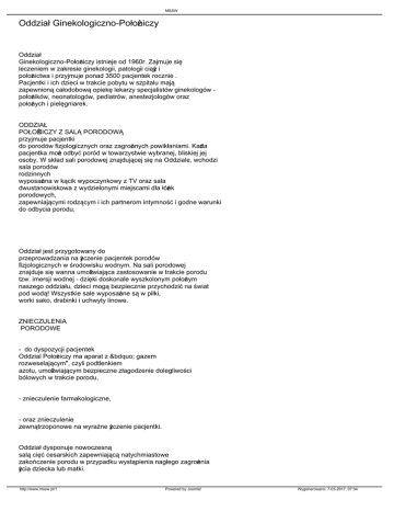 MSSW Oddział Ginekologiczno-Położniczy Oddział Ginekologiczno-Położniczy istnieje od 1960r. Zajmuje się leczeniem w zakresie ginekologii, patologii ciąży i położnictwa i przyjmuje ponad 3500 pacjentek rocznie . Pacjentki i ich dzieci w trakcie pobytu w szpitalu mają zapewnioną całodobową opiekę lekarzy specjalistów ginekologów - położników, neonatologów, pediatrów, anestezjologów oraz położnych i pielęgniarek. ODDZIAŁ POŁOŻNICZY Z SALĄ PORODOWĄ przyjmuje pacjentki do porodów fizjologicznych oraz zagrożonych powikłaniami. Każda pacjentka może odbyć poród w towarzystwie wybranej, bliskiej jej osoby. W skład sali porodowej znajdującej się na Oddziale, wchodzi sala porodów rodzinnych wyposażona w kącik wypoczynkowy z TV oraz sala dwustanowiskowa z wydzielonymi miejscami dla łóżek porodowych, zapewniającymi rodzącym i ich partnerom intymność i godne warunki do odbycia porodu. Oddział jest przygotowany do przeprowadzania na życzenie pacjentek porodów fizjologicznych w środowisku wodnym. Na sali porodowej znajduje się wanna umożliwiająca zastosowanie w trakcie porodu tzw. imersji wodnej - dzięki doskonale wyszkolonym położnym naszego oddziału, dzieci mogą bezpiecznie przychodzić na świat pod wodą! Wszystkie sale wyposażone są w piłki, worki sako, drabinki i uchwyty linowe. ZNIECZULENIA PORODOWE - do dyspozycji pacjentek Oddzial Położniczy ma aparat z „ gazem rozweselającym", czyli podtlenkiem azotu, umożliwiającym bezpieczne złagodzenie dolegliwości bólowych w trakcie porodu, - znieczulenie farmakologiczne, - oraz znieczulenie zewnątrzoponowe na wyraźne życzenie pacjentki. Oddział dysponuje nowoczesną salą cięć cesarskich zapewniającą natychmiastowe zakończenie porodu w przypadku wystąpienia nagłego zagrożenia życia dziecka lub matki. http://www.mssw.pl/1 Powered by Joomla! Wygenerowano: 7-03-2017, 07:34 MSSW Wszystkie usługi w Oddziale, takie jak poród rodzinny, sala indywidualna czy znieczulenie podczas porodu, są bezpłatne. UWAGA! Wcześniejsza rejestracja w Oddziale Położniczym nie jest konieczna, Oddział nie odsyła rodzących pacjentek. Zapisy prowadzone są jedynie w przypadku skierowania na planowe cięcie cesarskie, po uprzedniej konsultacji u kierownika Oddziału. Po porodzie Pacjentki mają do dyspozycji jedną salę jednoosobową typu apartament, dwie sale dwuosobowe (z możliwością konwersji do sal jednoosobowych) oraz jedną salę dla trzech osób. We wszystkich salach pacjentki mają możliwość ciągłego przebywania z dziećmi, zgodnie z zasadami „rooming in". Czytaj więcej: Oddział Neonatologiczny W czasie porodu istnieje możliwość pobrania krwi pępowinowej. Szpital współpracuje z wszystkimi największymi w Polsce firmami zajmującymi się przechowywaniem krwi pępowinowej. ODDZIAŁ PATOLOGII CIĄŻY jest jednostką 2° referencyjności. Dzięki usytuowaniu oddziału w wieloprofilowym, specjalistycznym szpitalu, mamy możliwość zapewnienia fachowej, specjalistycznej opieki kobietom ciężarnym w szerokim zakresie powikłań i chorób współistniejących z ciążą. Możliwość natychmiastowego skorzystania z konsultacji lekarzy innych specjalności (takich jak chirurg, urolog, kardiolog, internista, neurolog, ortopeda, okulista) oraz dostępność wysokospecjalistycznego zaplecza diagnostycznego (badania RTG, USG, TK, MR) stwarzają warunki dla zapewnienia pacjentkom maksymalnego bezpieczeństwa pobytu i leczenia. Oddział zajmuje się m.in. leczeniem patologii wczesnej ciąży (poronienia, krwawienia z dróg rodnych), porodów przedwczesnych (zakładanie szwów okrężnych na szyjkę macicy, pessariów położniczych), chorób układu krążenia, moczowego, pokarmowego, nerwowego wikłających ciążę. ODDZIAŁ GINEKOLOGII prowadzi leczenie zachowawcze oraz operacyjne chorób narządu rodnego. Jest jedną z wiodących http://www.mssw.pl/1 Powered by Joomla! Wygenerowano: 7-03-2017, 07:34 MSSW jednostek w Warszawie, zajmujących się leczeniem zaburzeń statyki narządu rodnego i nietrzymania moczu. W Oddziale ginekologii wykonywane są m.in.: - „małe" zabiegi diagnostyczno - lecznicze, takie jak: • wyłyżeczkowanie kanału szyjki macicy, • pobranie wycinków z szyjki macicy pod kontrolą kolposkopu, • pobranie wycinków ze sromu, • usunięcie polipa szyjki macicy, • histeroskopia diagnostyczna, •laparoskopia diagnostyczna (diagnostyka niepłodności, diagnostyka zespołów bólowych miednicy mniejszej), • leczenie nadżerek szyjki macicy (krioterapia, laser). - zabiegi operacyjne: • histeroskopia zabiegowa (usunięcie polipa endometrium, zniszczenie zrostów wewnątrzmacicznych, usunięcie wkładki wewnątrzmacicznej), • laparoskopowe operacje narządu rodnego (usunięcie torbieli jajników, mięśniaków macicy, ciąży pozamacicznej), • całkowite usunięcie narządu rodnego drogą brzuszną i pochwową (np. z powodu mięśniaków macicy czy złośliwych chorób nowotworowych), • amputacja trzonu macicy bez przydatków, • usunięcie jajników, http://www.mssw.pl/1 Powered by Joomla! Wygenerowano: 7-03-2017, 07:34 MSSW • operacje szyjki macicy, • operacje ciąży pozamacicznej, • operacje w leczeniu nietrzymania moczu z zastosowaniem taśm polipropylenowych, • peracje w leczeniu obniżenia i wypadania narządu rodnego z zastosowaniem nowoczesnych siatek i taśm polipropylenowych. Ponadto zajmujemy się leczeniem zachowawczym schorzeń narządu rodnego, takich m.in. jak: • zapalenie narządu rodnego, • zespół bólowy miednicy mniejszej, • nowotwory narządu rodnego. UWAGA! Konsultacje przedoperacyjne i zapisy na operację odbywają się w każdą środę w Specjalistycznej Przychodni Przyszpitalnej w godzinach od 8.00 do 12.00. Właściwa organizacja pracy umożliwia nam zagwarantowanie pacjentkom krótkich terminów zapisów na zabiegi operacyjne. PRACOWNIE ODDZIAŁU Pracownia cytologiczno - kolposkopowa - zajmuje