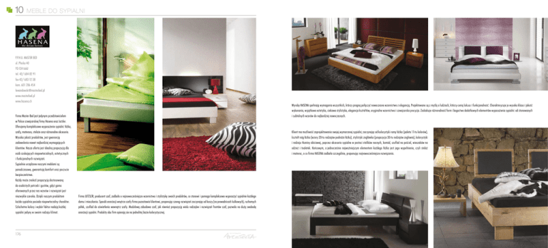10 meble do sypialni P.P.H.U. MASTER BED ul. Płocka 40 93-134 Łódź tel. 42/ 684 82 91 fax 42/ 683 12 38 kom. 601 286 454 [email protected] www.masterbed.pl www.hasena.ch Firma Master Bed jest jedynym przedstawicielem w Polsce szwajcarskiej firmy Hasena oraz Jutzler. Oferujemy kompleksowe wyposażenie sypialni: łóżka, szafy, materace, stelaże oraz różnorodne akcesoria. Wysoka jakość produktów, jest gwarancją zadowolenia nawet najbardziej wymagających klientów. Nasza oferta jest idealną propozycją dla osób szukających niepowtarzalnych, estetycznych i funkcjonalnych rozwiązań. Sypialnie urządzone naszymi meblami są ponadczasowe, gwarantują komfort oraz poczucie bezpieczeństwa. Każdy może znaleźć propozycję dostosowaną do osobistych potrzeb i gustów, gdyż gama oferowanych przez nas wzorów i rozwiązań jest niezwykle szeroka. Dzięki naszym produktom każda sypialnia posiada niepowtarzalny charakter. Szlachetne kolory i wybór faktur nadają każdej sypialni jedyny w swoim rodzaju klimat. 176 176 Wyroby HASENA spełniają wymagania wszystkich, którzy pragną połączyć nowoczesne wzornictwo z elegancją. Projektowane są z myślą o ludziach, którzy cenią luksus i funkcjonalność. Charakteryzuje je wysoka klasa i jakość wykonania, wyjątkowa estetyka, ciekawa stylistyka, elegancja kształtów, oryginalne wzornictwo i szwajcarska precyzja. Zaskakuje różnorodność form i bogactwo dodatkowych elementów wyposażenia sypialni: od stonowanych i subtelnych wzorów do najbardziej nowoczesnych. Klient ma możliwość zaprojektowania swojej wymarzonej sypialni; zaczynając od kolorystyki ramy łóżka (paleta 11-tu kolorów), kształt nóg łóżka (wzory 20-tu rodzajów podnóża łóżka), stylistyki zagłówka (propozycja 30-tu rodzajów zagłowia), kolorystyki i rodzaju tkaniny obiciowej, poprzez akcesoria sypialne w postaci stolików nocnych, komód, szuflad na pościel, wieszaków na odzież i toaletek. Końcowym, a jednocześnie najważniejszym elementem każdego łóżka jest jego wypełnienie, czyli stelaż i materac, o co firma HASENA zadbała szczególnie, proponując najnowocześniejsze rozwiązania. Firma JUTZLER; producent szaf, zadbała o najnowocześniejsze wzornictwo i stylistykę swoich produktów, co stanowi i pomaga kompleksowo wyposażyć sypialnie każdego domu i mieszkania. Sposób aranżacji wnętrza szafy firma pozostawia klientowi, proponując szereg rozwiązań zaczynając od koszy (na prowadnicach kulkowych), ruchomych półek, szuflad do oświetlenia wewnątrz szafy. Modułową zabudowa szaf, jak również propozycją wielu rodzajów i rozwiązań frontów szaf, pozwala na dużą swobodę aranżacji sypialni. Produkty obu firm opierają sie na jednolitej bazie kolorystycznej.