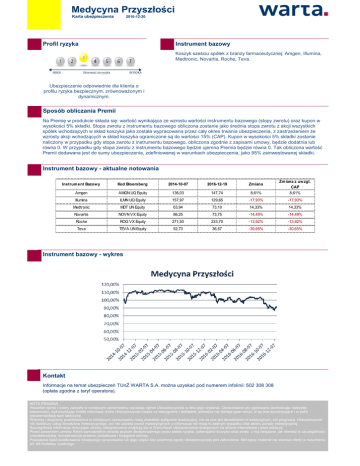 Medycyna Przyszłości Karta ubezpieczenia 2016-12-20 Profil ryzyka Instrument bazowy Koszyk sześciu spółek z branży farmaceutycznej: Amgen, Illumina, Medtronic, Novartis, Roche, Teva. Ubezpieczenie odpowiednie dla klienta o profilu ryzyka bezpiecznym, zrównoważonym i dynamicznym. Sposób obliczania Premii Na Premię w produkcie składa się: wartość wynikająca ze wzrostu wartości instrumentu bazowego (stopy zwrotu) oraz kupon w wysokości 5% składki. Stopa zwrotu z instrumentu bazowego obliczona zostanie jako średnia stopa zwrotu z akcji wszystkich spółek wchodzących w skład koszyka jaka została wypracowana przez cały okres trwania ubezpieczenia, z zastrzeżeniem że wzrosty akcji wchodzących w skład koszyka ograniczone są do wartości 15% (CAP). Kupon w wysokości 5% składki zostanie naliczony w przypadku gdy stopa zwrotu z instrumentu bazowego, obliczona zgodnie z zapisami umowy, będzie dodatnia lub równa 0. W przypadku gdy stopa zwrotu z instrumentu bazowego będzie ujemna Premia będzie równa 0. Tak obliczona wartość Premii dodawana jest do sumy ubezpieczenia, zdefiniowanej w warunkach ubezpieczenia, jako 95% zainwestowanej składki. Instrument bazowy - aktualne notowania Instrument Bazow y Kod Bloomberg 2014-10-07 2016-12-19 Zmiana Zmiana z uw zgl. CAP Amgen AMGN UQ Equity 136,03 147,74 8,61% 8,61% -17,93% Illumina ILMN UQ Equity 157,97 129,65 -17,93% Medtronic MDT UN Equity 63,94 73,10 14,33% 14,33% Novartis NOVN VX Equity 86,25 73,75 -14,49% -14,49% Roche ROG VX Equity 271,50 233,70 -13,92% -13,92% Teva TEVA UN Equity 52,73 36,57 -30,65% -30,65% Instrument bazowy - wykres Kontakt Informacje na temat ubezpieczeń TUnŻ WARTA S.A. można uzyskać pod numerem infolinii: 502 308 308 (opłata zgodna z taryf operatora). NOTA PRAWNA Wszelkie opinie i oceny zawarte w niniejszym opracowaniu wyrażają opinie Ubezpieczyciela w dniu jego wydania. Opracowanie prz ygotowano dochowując należytej staranności, wykorzystując źródła informacji, które Ubezpieczyciel uważa za wiarygodne i dokładne, jednakże nie istnieje gwar ancja, iż są one wyczerpujące i w pełni odzwierciedlają stan faktyczny. Wykresy i diagramy przedstawione w niniejszym opracowaniu mają charakter wyłącznie ilustracyjny, nie są one ani doradztwem in westycyjnym, ani prognozą. Ubezpieczyciel nie świadczy usług doradztwa inwestycyjnego, ani nie udziela porad inwestycyjnych a informacje nie mają w żadnym wypadku char akteru porady inwestycyjnej. Szczegółowe informacje dotyczące umowy ubezpieczenia znajdują się w Warunkach Ubezpieczenia dostępnych na stronie internetowe j www.warta.pl. Przed zawarciem umowy Klient samodzielnie określa poziom akceptowalnego przez siebie ryzyka, potencjalne korzyści oraz straty z nią związane, jak również w szczególności charakterystykę, konsekwencje prawne, podatkowe i księgowe umowy. Powielanie bądź publikowanie niniejszego opracowania lub jego części bez pisemnej zgody Ubezpieczyciela jest zabronione. Nini ejszy materiał nie stanowi oferty w rozumieniu art. 66 Kodeksu cywilnego.