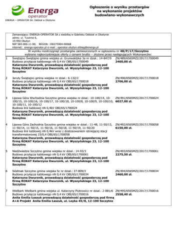 Ogłoszenie o wyniku przetargów na wykonanie projektów budowlano-wykonawczych ENERGA – OPERATOR SA. Oddział w Olsztynie Zamawiający: ENERGA-OPERATOR SA z siedzibą w Gdańsku Oddział w Olsztynie adres: ul. Tuwima 6, 10-950 Olsztyn NIP 583-000-11-90; REGON: 190275904-00068 internet: energa-operator.pl e-mail : [email protected] 1 W wyniku rozstrzygnięć przetargów zamieszczonych w ogłoszeniu nr 48/P/17/Szczytno wybrano najkorzystniejsze oferty z cenami brutto – złożone przez następujących Wykonawców: Świętajno Świętajno gmina wiejska ul. Grunwaldzka 3a nr dział.: 14-847/9 ZN/489/6565MZI/2017/1700049 Budowa przyłącza kablowego nN 0,4 kV OBI/65/1700049 2460,00 zł. Katarzyna Dwurznik, prowadzącą działalność gospodarczą pod firmą ROKAT Katarzyna Dwurznik, ul. Wyszyńskiego 23, 12-100 Szczytno 2 Jeruty Świętajno gmina wiejska nr dział.: 6-132/2 Budowa przyłącza kablowego nN 0,4 kV OBI/65/1700018 Katarzyna Dwurznik, prowadzącą działalność gospodarczą pod firmą ROKAT Katarzyna Dwurznik, ul. Wyszyńskiego 23, 12-100 Szczytno ZN/490/6565MZI/2017/1700018 2706,00 zł. 3 Lipowa Góra Wschodnia Szczytno gmina wiejska nr dział.: 10-100/14, 10ZN/491/6565MZI/2017/1700024 100/15, 10-100/16, 10-100/17, 10-100/18, 10-100/8, 10-100/9, 10-100/10, 6027,00 zł. 10-100/11, 10-100/12 Budowa linii kablowej nN 0,4kV OBI/65/1700024 Katarzyna Dwurznik, prowadzącą działalność gospodarczą pod firmą ROKAT Katarzyna Dwurznik, ul. Wyszyńskiego 23, 12-100 Szczytno 4 Lipowa Góra Zachodnia Szczytno gmina wiejska nr dział.: 11-48, 11-50/13, 11-50/14, 11-50/15, 11-50/16, 11-50/18, 11-50/19, 11-50/20 Budowa linii kablowej nN 0,4kV wraz z dostosowaniem istniejącej stacji transformatorowej 15/0,4 OBI/65/1700058 Katarzyna Dwurznik, prowadzącą działalność gospodarczą pod firmą ROKAT Katarzyna Dwurznik, ul. Wyszyńskiego 23, 12-100 Szczytno ZN/492/6565MZI/2017/1700058 6150,00 zł. 5 Niedźwiedzie Szczytno gmina wiejska nr dział.: 14-93/3 Budowa przyłącza kablowego nN 0,4 kV OBI/65/1700061 Katarzyna Dwurznik, prowadzącą działalność gospodarczą pod firmą ROKAT Katarzyna Dwurznik, ul. Wyszyńskiego 23, 12-100 Szczytno ZN/493/6565MZI/2017/1700061 2275,50 zł. 6 Siódmak Szczytno gmina wiejska 5c nr dział.: 27-809/3 Budowa przyłącza kablowego nN 0,4 kV OBI/65/1700034 Katarzyna Dwurznik, prowadzącą działalność gospodarczą pod firmą ROKAT Katarzyna Dwurznik, ul. Wyszyńskiego 23, 12-100 Szczytno ZN/494/6565MZI/2017/1700034 2460,00 zł. 7 Wielbark Wielbark gmina wiejska ul. Katarzyny Piotrowicz nr dział.: 2-881/6 ZN/495/6565MZI/2017/1700016 Budowa przyłącza kablowego nN 0,4 kV OBI/65/1700016 2558,40 zł. Anita Emilia Łaszuk prowadzącą działalność gospodarczą pod firmą A+A Projekt Anita Emilia Łaszuk, ul. Leyka 45/8, 12-100 Szczytno Ogłoszenie o wyniku przetargów na wykonanie projektów budowlano-wykonawczych ENERGA – OPERATOR SA. Oddział w Olsztynie 8 Przeździęk Wielki Wielbark gmina wiejska 47A nr dział.: 14-104/4 ZN/496/6565MZI/2017/1700033 Dostosowanie linii napowietrznej nN 0,4 kV wraz z dostosowaniem istniejącej 8487,00 zł. stacji transformatorowej 15/0,4 kV OBI/65/1700033 Przedsiębiorstwo Usług Inżynieryjnych SIECIOPROJEKT Sp. z o.o., Rolna 241, 10-802 Olsztyn 9 Wesołowo Wielbark gmina wiejska nr dział.: 19-116/4 ZN/497/6565MZI/2017/1700013 Dostosowanie linii napowietrznej nN 0,4 kV OBI/65/1700013 5412,00 zł. Przedsiębiorstwo Usług Inżynieryjnych SIECIOPROJEKT Sp. z o.o., Rolna 241, 10-802 Olsztyn 10 Tatary Nidzica obszar wiejski nr dział.: 22-110/11 ZN/498/6565MZI/2017/1700052 Budowa linii kablowej nN 0,4kV OBI/65/1700052 3997,50 zł. Grzegorz Sędłak prowadzącym działalność gospodarczą pod firmą Projektowanie i Nadzór Elektryczny Grzegorz Sędłak, ul. Krucza 1, 13-100 Nidzica 11 Zaborowo Kozłowo gmina wiejska 33A nr dział.: 29-100 ZN/499/6565MZI/2017/1700064 Budowa przyłącza kablowego nN 0,4 kV OBI/65/1700064 2988,90 zł. Grzegorz Sędłak prowadzącym działalność gospodarczą pod firmą Projektowanie i Nadzór Elektryczny Grzegorz Sędłak, ul. Krucza 1, 13-100 Nidzica Sporządził(a): Krzysztof Grohs Olsztyn, dnia 07-02-2017 .............................................................. /podpis/