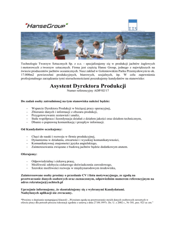 Technologie Tworzyw Sztucznych Sp. z o.o. - specjalizujemy się w produkcji jachtów żaglowych i motorowych z tworzyw sztucznych. Firma jest częścią Hanse Group, jednego z największych na świecie producentów jachtów oceanicznych. Nasz zakład w Goleniowskim Parku Przemysłowym to ok. 17.000m2 powierzchni produkcyjnych, biurowych, socjalnych, itp. W celu zapewnienia profesjonalnego zarządzania tymi nieruchomościami poszukujemy kandydatów na stanowisko: Asystent Dyrektora Produkcji Numer referencyjny ADP/02/17 Do zadań osoby zatrudnionej na tym stanowisku należeć będzie: Wsparcie Dyrektora Produkcji w bieżącej pracy operacyjnej, Zbieranie danych i informacji z obszaru produkcji, Przygotowywanie zestawień i analiz, Stała współpraca i koordynacja działań z działem jakości oraz działem technicznym, Dbanie o poprawną komunikację i przepływ informacji. Od Kandydatów oczekujemy: Chęci do nauki i rozwoju w firmie produkcyjnej, Dynamizmu w działaniu, otwartości i wysokiej komunikatywności, Komunikatywnej znajomości języka angielskiego, Zainteresowania związane z budową jachtów będzie dodatkowym atutem. Oferujemy: Odpowiedzialną i ciekawą pracę, Możliwość zdobycia ciekawego doświadczenia zawodowego, Szerokie możliwości rozwoju w międzynarodowym środowisku, Zainteresowane osoby prosimy o przesłanie CV i listu motywacyjnego, ze zgodą na przetwarzanie danych osobowych oraz zaznaczonym, odpowiednim numerem referencyjnym na adres [email protected] Uprzejmie informujemy, że skontaktujemy się z wybranymi Kandydatami. Nadsyłanych aplikacji nie zwracamy. *Prosimy o dopisanie następującej klauzuli: „Wyrażam zgodę na przetwarzanie moich danych osobowych zawartych w ofercie pracy dla potrzeb procesu rekrutacji zgodnie z ustawą z dnia 27.08.1997r. Dz. U. z 2002 r., Nr 101, poz. 923 ze zm.”