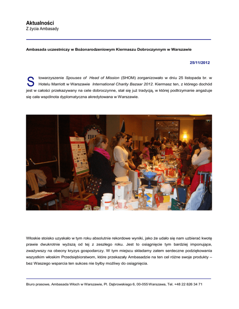 Aktualności Z życia Ambasady Ambasada uczestniczy w Bożonarodzeniowym Kiermaszu Dobroczynnym w Warszawie 25/11/2012 S towarzyszenie Spouses of Head of Mission (SHOM) zorganizowało w dniu 25 listopada br. w Hotelu Marriott w Warszawie International Charity Bazaar 2012. Kiermasz ten, z którego dochód jest w całości przekazywany na cele dobroczynne, stał się już tradycją, w której podtrzymanie angażuje się cała wspólnota dyplomatyczna akredytowana w Warszawie. Włoskie stoisko uzyskało w tym roku absolutnie rekordowe wyniki, jako że udało się nam uzbierać kwotę prawie dwukrotnie wyższą od tej z zeszłego roku. Jest to osiągnięcie tym bardziej imponujące, zważywszy na obecny kryzys gospodarczy. W tym miejscu składamy zatem serdeczne podziękowania wszystkim włoskim Przedsiębiorstwom, które przekazały Ambasadzie na ten cel różne swoje produkty – bez Waszego wsparcia ten sukces nie byłby możliwy do osiągnięcia. Biuro prasowe, Ambasada Włoch w Warszawie, Pl. Dąbrowskiego 6, 00-055 Warszawa, Tel. +48 22 826 34 71 Dochód z całej imprezy zostanie przekazany Fundacjom SOS Villages, AMICUS i Centrum Praw Kobiet (Women’s Right Center) – stowarzyszeń i organizacji pozarządowych wspierających kobiety, dzieci i osoby starsze. Dziekujemy tez Pani Tessa Capponi, Maison du vin i Winkolekcja. Ufficio Stampa, Ambasciata d’Italia a Varsavia, Pl. Dąbrowskiego 6, 00-055 Warszawa, Tel. +48 22 826 34 71 Ufficio Stampa, Ambasciata d’Italia a Varsavia, Pl. Dąbrowskiego 6, 00-055 Warszawa, Tel. +48 22 826 34 71