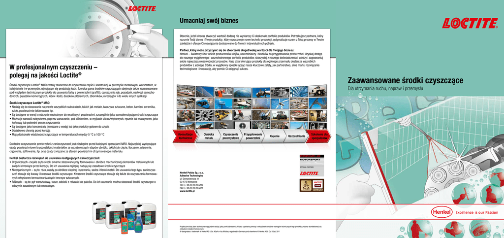 Umacniaj swój biznes Obecnie, jeżeli chcesz stworzyć wartość dodaną nie wystarczy Ci doskonałe portfolio produktów. Potrzebujesz partnera, który rozumie Twój biznes i Twoje produkty, który opracowuje nowe techniki produkcji, optymalizuje razem z Tobą procesy w Twoim zakładzie i oferuje Ci rozwiązania dostosowane do Twoich indywidualnych potrzeb. W profesjonalnym czyszczeniu – polegaj na jakości Loctite® Partner, który może przyczynić się do stworzenia długotrwałej wartości dla Twojego biznesu: Henkel – światowy lider wśród producentów klejów, uszczelniaczy i środków do przygotowania powierzchni. Uzyskaj dostęp do naszego wyjątkowego i wszechstronnego portfolio produktów, skorzystaj z naszego doświadczenia i wiedzy i z agwarantuj sobie najwyższą niezawodność procesów. Nasz dział oferujący produkty dla ogólnego przemysłu dostarcza wszystkich produktów z jednego źródła, w wyjątkowy sposób łącząc nasze kluczowe zalety, jak partnerstwo, silne marki, rozwiązania technologiczne i innowację, aby pomóc Ci osiągnąć sukces. Zaawansowane środki czyszczące Środki czyszczące Loctite® MRO zostały stworzone do czyszczenia części i konstrukcji w przemyśle metalowym, warsztatach, w kolejnictwie i w przemyśle zajmującym się produkcją łodzi. Szeroka gama środków czyszczących obejmuje także zaawansowane pod względem technicznym produkty do usuwania farby z powierzchni (graffiti), czyszczenia rąk, posadzek, nadwozi samochodowych, pojazdów komercyjnych, łódek i łodzi, daszków płóciennych, zbiorników, rurociągów i do wielu innych aplikacji. Środki czyszczące Loctite® MRO: •Nadają się do stosowania na prawie wszystkich substratach, takich jak metale, tworzywa sztuczne, beton, kamień, ceramika, szkło, powierzchnie lakierowane itp. •Są dostępne w wersji o odczynie neutralnym do wrażliwych powierzchni, szczególnie jako samodemulgujące środki czyszczące •Można je nanosić natryskowo, poprzez zanurzanie, pod ciśnieniem, w myjkach ultradźwiękowych, ręcznie lub maszynowo, jako końcowy lub pośredni proces czyszczenia •Są dostępne jako koncentraty (mieszane z wodą) lub jako produkty gotowe do użycia •Dodatkowo chronią przed korozją •Mają doskonałe właściwości czyszczące w temperaturach między 5 °C a 100 °C Dla utrzymania ruchu, napraw i przemysłu Konsultacje techniczne Obróbka metalu Czyszczenie przemysłowe Przygotowanie powerzchni Klejenie Uszczelnianie Szkolenie dla specjalistów Dokładne oczyszczenie powierzchni z zanieczyszczeń jest niezbędne przed kolejnymi operacjami MRO. Najczęściej występujące osady powierzchniowe to pozostałości materiałów ze wcześniejszych etapów obróbki, takich jak cięcie, tłoczenie, wiercenie, ciągnienie, szlifowanie, itp. oraz osady związane ze stanem powierzchni otrzymywanego materiału. Henkel dostarcza rozwiązań do usuwania następujących zanieczyszczeń: •Organicznych -zwykle są to środki smarne stosowane przy formowaniu i obróbce mechanicznej elementów metalowych lub związki chroniące przed korozją. Do ich usuwania najlepiej nadają się zasadowe środki czyszczące •Nieorganicznych – są to: rdza, osady po obróbce cieplnej i spawaniu, sadza i tlenki metali. Do usuwania tego typu zanieczyszczeń stosuje się kwasy i kwasowe środki czyszczące. Kwasowe środki czyszczące stosuje się także do oczyszczania formowanych wtryskowo termoutwardzalnych tworzyw sztucznych. •Różnych – są to: pył warsztatowy, tusze, odciski z rekawic lub palców. Do ich usuwania można stosować środki czyszczące o odczynie zasadowym lub neutralnym. Henkel Polska Sp. z o.o. Adhesive Technologies ul. Domaniewska 41 02-672 Warszawa Tel.: (+48 22) 56 56 200 Fax: (+48 22) 56 56 222 www.loctite.pl Przytoczone tutaj dane techniczne mają jedynie służyć jako punkt odniesienia. W celu uzyskania pomocy i wskazówek odnośnie wymogów technicznych tego produktu, prosimy skontaktować się z lokalnym działem technicznym. ® designates a trademark of Henkel AG & Co. KGaA or its affiliates, registered in Germany and elsewhere © Henkel AG & Co. KGaA, 2011 Właściwe rozwiązanie Do każdej aplikacji Czyszczenie części mechanicznych w warsztatach naprawczych Loctite® 7012 Czyszczenie podłóg Loctite® 7860 Środek czyszczący do aplikacji zanurzeniowych • Środek czyszczący i odtłuszczający ogólnego zastosowania do usuwania silnych zanieczyszczeń • Do czyszczenia wszystkich mechanicznych części z użyciem sprzętu wysokociśnieniowego lub bez niego • Zalecany także do tworzyw sztucznych, gum i powierzchni lakierowanych • Doskonała penetracja zanieczyszczeń i łatwe rozpuszczanie smarów • Może być nanoszony poprzez rozpylanie, zanurzanie lub ręcznie • Nie zawiera rozpuszczalników Temperatura pracy: Temperatura pokojowa do 50 °C Stężenie podczas aplikacji: 10 do 500 g/l Może być nakładany przy pomocy ściereczki lub szczotki, metodą natryskową przy użyciu generatora piany lub poprzez zanurzanie w temperaturze pokojowej. Stężenie: metoda ręczna 2 do 10%), przy użyciu szczotki (2 do 5%), przy użyciu sprzętu wysokociśnieniowego (1 do 2% W dyszy), przy użyciu generatora piany (20 do 50%), metodą zanurzeniową (10 do 20%), przy użyciu stołu do mycia (10 do 30%). Loctite® 7861 Loctite® 7013 stosuje się w formie nierozcieńczonej. Należy nakładać wystarczającą ilość produktu przy pomocy szczotki lub prysznica ręcznego. Może być nakładany przy użyciu sprzętu wysokociśnieniowego w temp. do 100 °C. Może być dozowany jako koncentrat lub jako 10% roztwór wstępny. Stężenie robocze: 5 do 20%. Temperatura pracy: Temperatura pokojowa Stężenie podczas aplikacji: gotowy do użycia Można nakładać przy pomocy urządzeń natryskujących. Stężenie robocze: 2 do 6%. Czas aplikacji zależy od celu użycia: 1 do 5 min w przypadku odtłuszczania i 10 do 15 min w przypadku odnawiania.