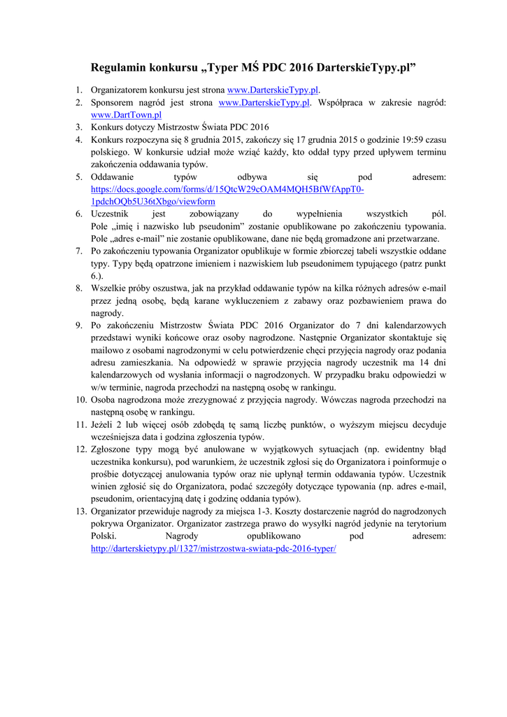 Regulamin konkursu „Typer MŚ PDC 2016 DarterskieTypy.pl”
