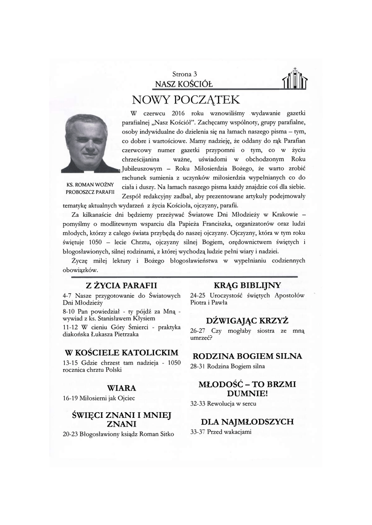 ii Strona 3 NASZ KOŚCIÓŁ NOWY POCZĄTEK W czerwcu 2016 roku wznowiliśmy wydawanie gazetki parafialnej „Nasz Kościół". Zachęcamy wspólnoty, grupy parafialne, osoby indywidualne do dzielenia się na łamach naszego pisma - tym, co dobre i wartościowe. Mamy nadzieję, że oddany do rąk Parafian czerwcowy numer gazetki przypomni o tym, co w życiu chrześcijanina ważne, uświadomi w obchodzonym Roku .Jubileuszowym — Roku Miłosierdzia Bożego, że warto zrobić rachunek sumienia z uczynków miłosierdzia wypełnianych co do KS. ROMAN W O Ź N Y ciała i duszy. Na łamach naszego pisma każdy znajdzie coś dla siebie. PROBOSZCZ PARAFII Zespół redakcyjny zadbał, aby prezentowane artykuły podejmowały tematykę aktualnych wydarzeń z życia Kościoła, ojczyzny, parafii. Za kilkanaście dni będziemy przeżywać Światowe Dni Młodzieży w Krakowie — pomyślmy o modlitewnym wsparciu dla Papieża Franciszka, organizatorów oraz ludzi młodych, którzy z całego świata przybędą do naszej ojczyzny. Ojczyzny, która w tym roku świętuje 1050 - lecie Chrztu, ojczyzny silnej Bogiem, orędownictwem świętych i błogosławionych, silnej rodzinami, z której wychodzą ludzie pełni wiary i nadziei. Życzę miłej lektury i Bożego błogosławieństwa w wypełnianiu codziennych obowiązków. Z ŻYCIA PARAFII KRĄG BIBLIJNY 4-7 Nasze przygotowanie do Światowych Dni Młodzieży 8-10 Pan powiedział - ty pójdź za Mną wywiad z ks. Stanisławem Kłysiem 11-12 W cieniu Góry Śmierci - praktyka diakońska Łukasza Pietrzaka 24-25 Uroczystość świętych Apostołów Piotra i Pawła W KOŚCIELE KATOLICKIM 13-15 Gdzie chrzest tam nadzieja - 1050 rocznica chrztu Polski WIARA 16-19 Miłosierni jak Ojciec ŚWIĘCI ZNANI I MNIEJ ZNANI 20-23 Błogosławiony ksiądz Roman Sitko DŹWIGAJĄC KRZYŻ 26-27 Czy umrzeć? mogłaby siostra ze mną RODZINA BOGIEM SILNA 28-31 Rodzina Bogiem silna MŁODOŚĆ - TO BRZMI DUMNIE! 32-33 Rewolucja w sercu DLA NAJMŁODSZYCH 33-37 Przed wakacjami