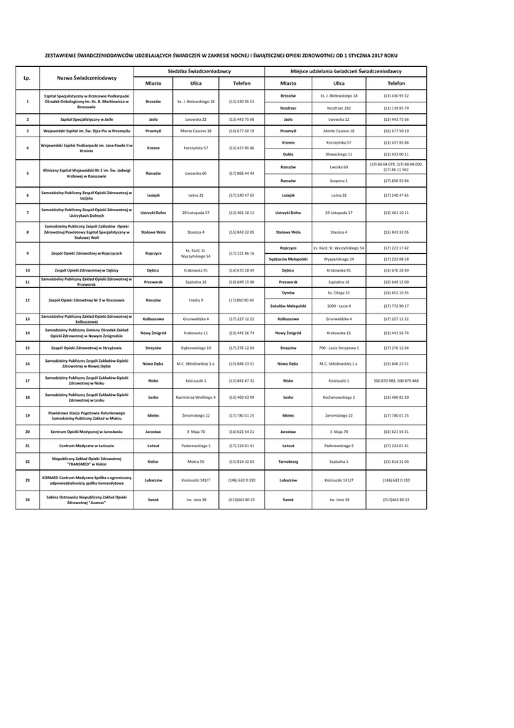 ZESTAWIENIE ŚWIADCZENIODAWCÓW UDZIELAJĄCYCH ŚWIADCZEŃ W ZAKRESIE NOCNEJ I ŚWIĄTECZNEJ OPIEKI ZDROWOTNEJ OD 1 STYCZNIA 2017 ROKU Siedziba Świadczeniodawcy Lp. Nazwa Świadczeniodawcy 1 Szpital Specjalistyczny w Brzozowie Podkarpacki Ośrodek Onkologiczny im. Ks. B. Markiewicza w Brzozowie Miejsce udzielania świadczeń Świadczeniodawcy Miasto Ulica Telefon Brzozów ks. J. Bielewskiego 18 (13) 430 95 52 Miasto Ulica Telefon Brzozów ks. J. Bielewskiego 18 (13) 430 95 52 Nozdrzec Nozdrzec 242 (13) 139 85 79 2 Szpital Specjalistyczny w Jaśle Jasło Lwowska 22 (13) 443 75 66 Jasło Lwowska 22 (13) 443 75 66 3 Wojewódzki Szpital im. Św. Ojca Pio w Przemyślu Przemyśl Monte Cassino 18 (16) 677 50 19 Przemyśl Monte Cassino 18 (16) 677 50 19 Wojewódzki Szpital Podkarpacki im. Jana Pawła II w Krośnie Krosno Korczyńska 57 (13) 437 85 86 4 Krosno Korczyńska 57 (13) 437 85 86 5 Kliniczny Szpital Wojewódzki Nr 2 im. Św. Jadwigi Królowej w Rzeszowie Rzeszów Lwowska 60 Dukla Słowackiego 11 (13) 433 00 11 Rzeszów Lwoska 60 (17) 86 64 079, (17) 86 64 000, (17) 86 11 562 Rzeszów Szopena 1 (17) 850 93 84 (17) 866 44 44 6 Samodzielny Publiczny Zespół Opieki Zdrowotnej w Leżjsku Leżajsk Leśna 22 (17) 240 47 65 Leżajsk Leśna 22 (17) 240 47 65 7 Samodzielny Publiczny Zespół Opieki Zdrowotnej w Ustrzykach Dolnych Ustrzyki Dolne 29 Listopada 57 (13) 461 10 11 Ustrzyki Dolne 29 Listopada 57 (13) 461 10 11 8 Samodzielny Publiczny Zespół Zakładów Opieki Zdrowotnej Powiotowy Szpital Specjalistyczny w Stalowej Woli Stalowa Wola Staszica 4 (15) 843 32 05 Stalowa Wola Staszica 4 (15) 843 32 05 9 Zespół Opieki Zdrowotnej w Ropczycach Ropczyce ks. Kard. St. Wyszyńskiego 54 (17) 221 86 16 Ropczyce ks. Kard. St. Wyszyńskiego 54 (17) 223 17 42 Sędziszów Małopolski Wyspańskiego 14 (17) 222 08 58 10 Zespół Opieki Zdrowotnwj w Dębicy Dębica Krakowska 91 (14) 670 28 49 Dębica Krakowska 91 (14) 670 28 49 11 Samodzielny Publiczny Zakład Opieki Zdrowotnej w Przeworsk Przeworsk Szpitalna 16 (16) 649 15 00 Przeworsk Szpitalna 16 (16) 649 15 00 12 Zespół Opieki Zdrowtnwj Nr 2 w Rzeszowie Rzeszów Fredry 9 (17) 850 90 40 Dynów ks. Ożoga 32 (16) 652 10 35 Sokołów Małopolski 1000 - Lecia 4 (17) 772 90 17 13 Samodzielny Publiczny Zakład Opieki Zdrowotnej w Kolbuszowej Kolbuszowa Grunwaldzka 4 (17) 227 12 22 Kolbuszowa Grunwaldzka 4 (17) 227 12 22 14 Samodzielny Publiczny Gminny Ośrodek Zakład Opieki Zdrowotnej w Nowym Żmigrodzie Nowy Żmigród Krakowska 11 (13) 441 56 74 Nowy Żmigród Krakowska 11 (13) 441 56 74 15 Zespół Opieki Zdrowotnwj w Strzyżowie Strzyżów Dąbrowskiego 10 (17) 276 12 64 Strzyżów 700 - Lecia Strzyżowa 1 (17) 276 12 64 16 Samodzielny Publiczny Zespół Zakładów Opieki Zdrowotnej w Nowej Dębie Nowa Dęba M.C. Skłodowskiej 1 a (15) 846 23 51 Nowa Dęba M.C. Skłodowskiej 1 a (15) 846 23 51 17 Samodzielny Publiczny Zespół Zakładów Opieki Zdrowotnej w Nisku Nisko Kościuszki 1 (15) 841 67 32 Nisko Kościuszki 1 500 870 983, 500 870 448 18 Samodzielny Publiczny Zespół Zakładów Opieki Zdrowotnej w Lesku Lesko Kazimierza Wielkiego 4 (13) 469 63 99 Lesko Kochanowskiego 2 (13) 460 82 20 19 Powiatowa Stacja Pogotowia Ratunkowego Samodzielny Publiczny Zakład w Mielcu Mielec Żeromskiego 22 (17) 780 01 25 Mielec Żeromskiego 22 (17) 780 01 25 20 Centrum Opieki Medycznej w Jarosławiu Jarosław 3 Maja 70 (16) 621 54 21 Jarosław 3 Maja 70 (16) 621 54 21 21 Centrum Medyczne w Łańcucie Łańcut Paderewskiego 5 (17) 224 01 41 Łańcut Paderewskiego 5 (17) 224 01 41 22 Niepubliczny Zakład Opieki Zdrowotnej "TRANSMED" w Kielce Kielce Mokra 55 (15) 814 32 03 Tarnobrzeg Szpitalna 1 (15) 814 32 03 23 KORMED Centrum Medyczne Spółka z ograniczoną odpowiedzialnością spółka komandytowa Lubaczów Kościuszki 141/7 (146) 632 0 310 Lubaczów Kościuszki 141/7 (146) 632 0 310 24 Sabina Ostrowska Niepubliczny Zakład Opieki Zdrowotnej "Acamar" Sanok św. Jana 38 (013)463 80 22 Sanok św. Jana 38 (013)463 80 22