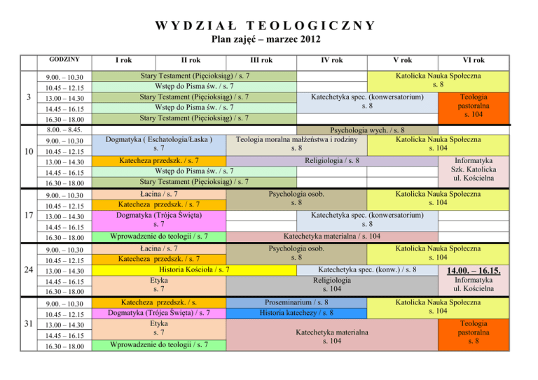 WYDZIAŁ TEOLOGICZNY Plan zajęć – marzec 2012 GODZINY 9.00. – 10.30 10.45 – 12.15 3 13.00 – 14.30 14.45 – 16.15 16.30 – 18.00 8.00. – 8.45. 10 9.00. – 10.30 10.45 – 12.15 13.00 – 14.30 14.45 – 16.15 16.30 – 18.00 9.00. – 10.30 10.45 – 12.15 17 13.00 – 14.30 14.45 – 16.15 16.30 – 18.00 9.00. – 10.30 24 10.45 – 12.15 13.00 – 14.30 14.45 – 16.15 16.30 – 18.00 II rok Dogmatyka ( Eschatologia/Łaska ) s. 7 Łacina / s. 7 Katecheza przedszk. / s. 7 Dogmatyka (Trójca Święta) s. 7 Wprowadzenie do teologii / s. 7 Łacina / s. 7 Katecheza przedszk. / s. 7 Historia Kościoła / s. 7 Etyka s. 7 16.30 – 18.00 Wprowadzenie do teologii / s. 7 IV rok V rok VI rok Katolicka Nauka Społeczna s. 8 Katechetyka spec. (konwersatorium) s. 8 Teologia pastoralna s. 104 Psychologia wych. / s. 8 Teologia moralna małżeństwa i rodziny Katolicka Nauka Społeczna s. 8 s. 104 Katecheza przedszk. / s. 7 Wstęp do Pisma św. / s. 7 Stary Testament (Pięcioksiąg) / s. 7 14.45 – 16.15 10.45 – 12.15 13.00 – 14.30 III rok Stary Testament (Pięcioksiąg) / s. 7 Wstęp do Pisma św. / s. 7 Stary Testament (Pięcioksiąg) / s. 7 Wstęp do Pisma św. / s. 7 Stary Testament (Pięcioksiąg) / s. 7 Katecheza przedszk. / s. Dogmatyka (Trójca Święta) / s. 7 Etyka s. 7 9.00. – 10.30 31 I rok Religiologia / s. 8 Psychologia osob. s. 8 Informatyka Szk. Katolicka ul. Kościelna Katolicka Nauka Społeczna s. 104 Katechetyka spec. (konwersatorium) s. 8 Katechetyka materialna / s. 104 Psychologia osob. s. 8 Katolicka Nauka Społeczna s. 104 Katechetyka spec. (konw.) / s. 8 Religiologia s. 104 Proseminarium / s. 8 Historia katechezy / s. 8 Katechetyka materialna s. 104 14.00. – 16.15. Informatyka ul. Kościelna Katolicka Nauka Społeczna s. 104 Teologia pastoralna s. 8