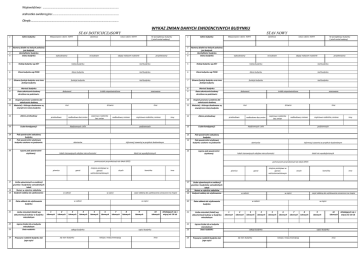 Województwo: ……………………………………………………………………………………….….. Jednostka ewidencyjna:…………………………………………………………………………..…… Obręb:…………………………………………………………………………………………………..…….. WYKAZ ZMIAN DANYCH EWIDENCYJNYCH BUDYNKU STAN DOTYCHCZASOWY 1 Adres budynku: 2 3 4 Numery działek na których położony jest budynek Identyfikator budynku Status budynku 5 Rodzaj budynku wg KŚT rodzaj budynku 6 Klasa budynku wg PKOB 7 Głowna funkcja budynku oraz inne funkcje budynku 8 9 Wartość budynku Data zakończenia budowy określona na podstawie: 10 Stopień pewności ustalenia dat zakończenia budowy Materiał, z którego zbudowane są zewnętrzne ściany budynku 11 12 Zakres przebudowy 13 Liczba kondygnacji: 14 Pole powierzchni zabudowy budynku Pole powierzchni użytkowej budynku ustalone na podstawie: 15 16 Miejscowość i ident. TERYT Dzielnica STAN NOWY 1 Adres budynku: Miejscowość i ident. TERYT Dzielnica Ulica i ident. TERYT Nr porządkowy budynku ( jeżeli został nadany) 2 3 4 Numery działek na których położony jest budynek Identyfikator budynku Status budynku wybudowany w budowie objęty nakazem rozbiórki projektowany kod budynku 5 Rodzaj budynku wg KŚT rodzaj budynku kod budynku klasa budynku kod budynku 6 Klasa budynku wg PKOB klasa budynku kod budynku funkcja budynku kod budynku 7 Głowna funkcja budynku oraz inne funkcje budynku funkcja budynku kod budynku 8 9 Wartość budynku Data zakończenia budowy określona na podstawie: 10 Stopień pewności ustalenia dat zakończenia budowy Materiał, z którego zbudowane są zewnętrzne ściany budynku wybudowany Ulica i ident. TERYT w budowie Nr porządkowy budynku ( jeżeli został nadany) objęty nakazem rozbiórki projektowany dokument źródło niepotwierdzone szacowana mur drewno Inne przebudowa nadbudowa bez zmian częściowa rozbiórka bez zmian nadbudowa, zmiana Nadziemnych LKN 11 częściowa rozbiórka, zmiana inny podziemnych Łączne pole powierzchni użytkowej: informacji zawartej w projekcie budowlanym lokali stanowiących odrębne nieruchomości lokali nie wyodrębnionych źródło niepotwierdzone szacowana mur drewno Inne 12 Zakres przebudowy 13 Liczba kondygnacji: Nadziemnych LKN podziemnych 14 Pole powierzchni zabudowy budynku Pole powierzchni użytkowej budynku ustalone na podstawie: obmiarów informacji zawartej w projekcie budowlanym lokali stanowiących odrębne nieruchomości lokali nie wyodrębnionych 15 obmiarów dokument 16 przebudowa Łączne pole powierzchni użytkowej: nadbudowa bez zmian pomieszczeń przynależnych do lokali (PEP) piwnica 17 18 19 Liczba ujawnionych w ewidencji gruntów i budynków samodzielnych lokali Numer w rejestrze zabytków Budynek oddany do użytkowania: 20 Data oddania do użytkowania budynku 21 Liczba mieszkań (lokali) wg dokumentacji budowy w budynku mieszkalnym 22 Łączna liczba izb w budynku mieszkalnym Data rozbiórki: 23 24 Przyczyna rozbiórki budynku lub jego części garaż miejsce postojowe w garażu wielostanowiskowym strych w części komórka inne część oddaną do użytkowania oznaczono na mapie w całości 1 izbowych 2 izbowych 3 izbowych 4 izbowych w części 5 izbowych 6 izbowych 7 izbowych całego budynku zły stan budynku 8 Izbowych 9 izbowych 10 izbowych części budynku kolizja z nową inwestycją nadbudowa, zmiana częściowa rozbiórka, zmiana inny pomieszczeń przynależnych do lokali (PEP) piwnica 17 w całości częściowa rozbiórka bez zmian składających się z więcej niż 10 izb 18 19 20 Data oddania do użytkowania budynku 21 Liczba mieszkań (lokali) wg dokumentacji budowy w budynku mieszkalnym 22 Łączna liczba izb w budynku mieszkalnym Data rozbiórki: 23 inna Liczba ujawnionych w ewidencji gruntów i budynków samodzielnych lokali Numer w rejestrze zabytków Budynek oddany do użytkowania: 24 Przyczyna rozbiórki budynku lub jego części garaż miejsce postojowe w garażu wielostanowiskowym w całości strych w części 2 izbowych 3 izbowych 4 izbowych w części 5 izbowych 6 izbowych 7 izbowych całego budynku zły stan budynku inne część oddaną do użytkowania oznaczono na mapie w całości 1 izbowych komórka 8 Izbowych 9 izbowych 10 izbowych części budynku kolizja z nową inwestycją inna składających się z więcej niż 10 izb