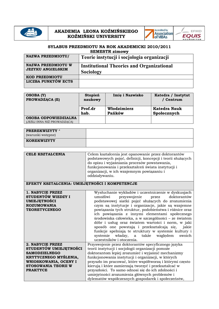 AKADEMIA LEONA KOŹMIŃSKIEGO KOŹMIŃSKI UNIVERSITY SYLABUS PRZEDMIOTU NA ROK AKADEMICKI 2010/2011 SEMESTR zimowy NAZWA PRZEDMIOTU/ Teorie instytucji i socjologia organizacji NAZWA PRZEDMIOTU W JEZYKU ANGIELSKIM Institutional Theories and Organizational Sociology KOD PRZEDMIOTU LICZBA PUNKTÓW ECTS OSOBA (Y) PROWADZĄCA (E) Stopień naukowy Prof.dr hab. Imię i Nazwisko Włodzimierz Pańków Katedra / Instytut / Centrum Katedra Nauk Społecznych OSOBA ODPOWIEDZIALNA (JEŚLI INNA NIŻ PROWADZĄCA) PREREKWIZYTY * (warunki wstępne) KOREKWIZYTY CELE KSZTAŁCENIA Celem kształcenia jest opanowanie przez doktorantów podstawowych pojęć, definicji, koncepcji i teorii służących do opisu i wyjaśniania procesów powstawania, funkcjonowania i przekształceń świata instytucji i organizacji, w ich wzajemnym powiązaniu i oddziaływaniu. EFEKTY KSZTAŁCENIA: UMIEJĘTNOŚCI I KOMPETENCJE 1. NABYCIE PRZEZ STUDENTÓW WIEDZY I UMIEJĘTNOŚCI ROZUMOWANIA TEORETYCZNEGO 2. NABYCIE PRZEZ STUDENTÓW UMIEJĘTNOŚCI SAMODZIELNEGO KRYTYCZNEGO MYŚLENIA, WNIOSKOWANIA, OCENY I STOSOWANIA TEORII W PRAKTYCE Wysłuchanie wykładów i uczestniczenie w dyskusjach umożliwi przyswojenie przez doktorantów podstawowej siatki pojęć służących do zrozumienia czym są instytucje i organizacje, jakie są wzajemne powiązania tych struktur, podobieństwa i różnice oraz ich powiązania z innymi elementami społecznego środowiska człowieka, a w szczególności – ze światem dóbr i usług oraz światem wartości i norm, w jaki sposób one powstają i przekształcają się, jakie funkcje spełniają te struktury w systemie kultury i systemie władzy, a także względem swoich uczestników i otoczenia. Przyswojenie przez doktorantów specyficznego języka teorii instytucji i socjologii organizacji pomoże doktorantom lepiej zrozumieć i wyjaśnić mechanizmy funkcjonowania instytucji i organizacji, w których przyszło im pracować, które współtworzą i którymi często kierują i które zamierzają tworzyć i przekształcać w przyszłości. To samo odnosi się do ich zdolności i umiejętności zrozumienia głównych problemów i dylematów współczesnych gospodarek i społeczeństw, 3. NABYCIE PRZEZ STUDENTÓW UMIEJĘTNOŚCI W ZAKRESIE KOMUNIKACJI, PRACY W ZESPOŁACH, PRZYWÓDZTWA ORGANIZACYJNEGO, WZORÓW ETYCZNYCH, ZACHOWAŃ I POSTAW SPOŁECZNYCH, ŚWIADOMOŚCI TRWAŁEGO ROZWOJU EKOSYSTEMU przeżywających napięcia i kryzysy związane z interakcjami i sprzecznymi oddziaływaniami mechanizmów rynkowych i struktur instytucjonalnych, a w szczególności państwowych. Roczny kurs teorii instytucji i socjologii organizacji będzie uwieńczony esejami, których autorzy, opierając się na przyswojonej wiedzy teoretycznej i wykorzystując praktyczną (empiryczną) znajomość określonych instytucji i organizacji, zaprezentują konkretne przypadki analizy ich funkcjonowania, ze szczególnym naciskiem na problemy i procesy instytucjonalizacji i de-instytucjonalizacji, restrukturyzacji, przeżywanych kryzysów, a nawet destrukcji. Eseje te mają kształtować u doktorantów zdolność krytycznego podejścia, demistyfikacji i demitologizacji w analizie świata instytucji i organizacji. TREŚCI KSZTAŁCENIA LICZBA GODZIN 1. Zasadnicze elementy społecznego środowiska człowieka 2. Dobra i usługi a potrzeby i interesy; typologie dóbr (usług), potrzeb i interesów. 3. Wartości, anty-wartości i normy a dobra społeczne i „cnoty” obywatelskie. 4. Instytucje i organizacje jako „produkty” i elementy kultury. 5. Sens pojęcia „instytucja” i jego główne definicje; typologie instytucji. 6. Metafory i główne koncepcje organizacji; znane typologie organizacji. 7. Realne i formalne związki pomiędzy instytucjami i organizacjami, funkcje gospodarstwa domowego jako ogniwa „pośredniczącego”. 8. Instytucje i organizacje: podobieństwa i różnice. 9. Instytucje i organizacje jako czynniki statyki i dynamiki społecznej. 10. Układy i systemy instytucjonalno-organizacyjne; problemy równowagi instytucjonalnej. 11. Procesy transferów i przekształceń instytucjonalnych. 12. Procesy instytucjonalizacji: podejście „fazowe” i interakcyjne. RAZEM LICZBA GODZIN: 2 2 2 2 2 2 2 2 2 2 2 2 24 SUGEROWANA LICZBA GODZIN PRACY WŁASNEJ STUDENTA *** 50 CAŁKOWITA LICZBA GODZIN PRZEZNACZONA NA STUDIOWANIE PRZEDMIOTU 74 DESCRIPTION OF THE MODULE IN ENGLISH (MAX 300 SYMBOLS Course “Institutional Theories and Organizational Sociology” approaches the mains concepts, definitions and theories describing the institutions and organizations, their reciprocal, formal and “material relations” and inter-connections between them and another dimensions of the social system: the culture, the system of power, the market, the educational system, the household etc. All theses elements present the new approach in the theories of institution and sociology of organizations developed by the course’s Author. UMIĘDZYNARODOWIENIE KSZTAŁCENIA ASPEKTY ODPOWIEDZIALOŚCI SPOŁECZNEJ I ETYCZNEJ LEKTURY OBOWIĄZKOWE DO ZAJĘĆ (zaleca się podawanie do trzech pozycji) LP. 1. 2. 3. AUTOR, TYTUŁ, MIEJSCE I ROK WYDANIA, WYDAWNICTWO, STRONY Barbara Gąciarz, Instytucjonalizacja samorządności. Aktorzy i efekty. Warszawa 2004, Wydawnictwo IFiS PAN, str. 23 – 56. Claus Offe, Projektowanie instytucji w krajach Europy Wschodniej w okresie przemian, w: „Narodziny demokratycznych instytucji”, pod red. Jerzego Hausnera. Kraków 1995r. Wydawnictwo Fundacji „Polska Praca”. Gareth Morgan, Obrazy organizacji. Warszawa 1999, Wydawnictwo Naukowe PWN LEKTURY UZUPEŁNIAJĄCE DO ZAJĘĆ (zaleca się podawanie do pięciu pozycji) LP. AUTOR, TYTUŁ, MIEJSCE I ROK WYDANIA, WYDAWNICTWO, STRONY 1. Beata Radzka, Nowy i stary instytucjonalizm. Spotkanie socjologii i ekonomii. Warszawa, 2009, Wydawnictwa ALK, Master of Business Administration, nr 2 (97), str. 62-74. Piotr Chmielewski, Nowa analiza instytucjonalna. Logika i podstawowe zasady. Wa
