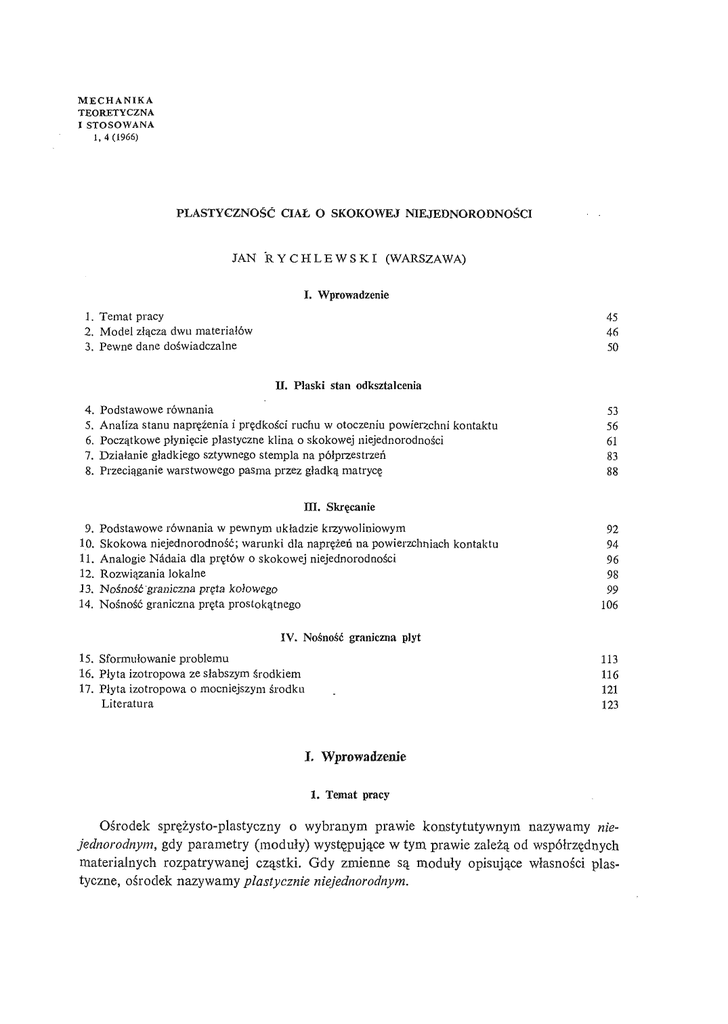 11. J. RYCH LEWSKI, Plane plastic strain for jump non- homogeneity, I n t. J. N on - Lin ear M ech., 1, 1, w druku.