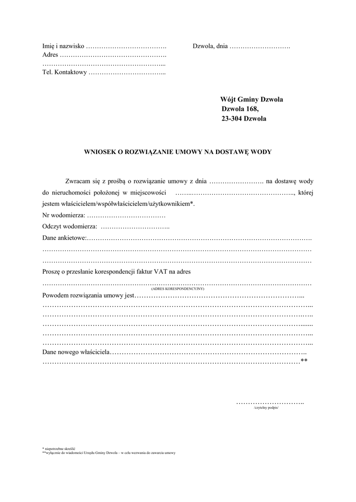 Imię i nazwisko ………………………………. Adres …………………………………………. ………………………………………………... Tel. Kontaktowy ……………………………... Dzwola, dnia ………………………. Wójt Gminy Dzwola Dzwola 168, 23-304 Dzwola WNIOSEK O ROZWIĄZANIE UMOWY NA DOSTAWĘ WODY Zwracam się z prośbą o rozwiązanie umowy z dnia ……………………. na dostawę wody do nieruchomości położonej w miejscowości ……..……………………………………….., której jestem właścicielem/współwłaścicielem/użytkownikiem*. Nr wodomierza: ……………………………… Odczyt wodomierza: ………………………….. Dane ankietowe:…………………………………………………………………………………………. …………………………………………………………………………………………………………… …………………………………………………………………………………………………………… Proszę o przesłanie korespondencji faktur VAT na adres …………………………………………………………………………………………………………… (ADRES KORESPONDENCYJNY) Powodem rozwiązania umowy jest……………………………………………………………... …………………………………………………………………………………………………... ……………………………………………………………………………………………….….. ………………………………………………………………………………………………....... …………………………………………………………………………………………………... …………………………………………………………………………………………………... Dane nowego właściciela……………………………………………………………………….. ………………………………………………………………………………………………** ……………………….. /czytelny podpis/ * niepotrzebne skreślić **wyłącznie do wiadomości Urzędu Gminy Dzwola – w celu wezwania do zawarcia umowy