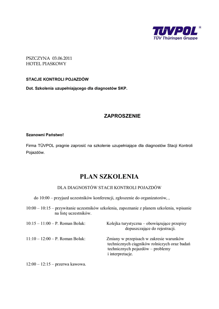 PSZCZYNA 03.06.2011 HOTEL PIASKOWY STACJE KONTROLI POJAZDÓW Dot. Szkolenia uzupełniającego dla diagnostów SKP. ZAPROSZENIE Szanowni Państwo! Firma TÜVPOL pragnie zaprosić na szkolenie uzupełniające dla diagnostów Stacji Kontroli Pojazdów. PLAN SZKOLENIA DLA DIAGNOSTÓW STACJI KONTROLI POJAZDÓW do 10:00 – przyjazd uczestników konferencji, zgłoszenie do organizatorów, , 10:00 – 10:15 – przywitanie uczestników szkolenia, zapoznanie z planem szkolenia, wpisanie na listę uczestników. 10:15 – 11:00 – P. Roman Boluk: Kolejka turystyczna – obowiązujące przepisy dopuszczające do rejestracji. 11:10 – 12:00 – P. Roman Boluk: Zmiany w przepisach w zakresie warunków technicznych ciągników rolniczych oraz badań technicznych pojazdów – problemy i interpretacje. 12:00 – 12:15 – przerwa kawowa. 12:15 – 13:00 – P. Zbigniew Samoraj Założenia projektu ustawy z dnia 23.06.2010r „O dopuszczeniu pojazdów do ruchu drogowego” Quady. 13:45 – 14:30 – P. Michał Kamionowski Prezentacja programu do rozkodowania numeru VIN 14:35 – 15:40 – P. Zbigniew Samoraj: Odbiór SKP przez TDT w celu uzyskania poświadczenia zgodności wyposażenia i warunków lokalowych SKP z wymogami odpowiednio do zakresu przeprowadzanych badań. Uwagi z przeprowadzonych weryfikacji 15:40 – 16:30 – P. Michał Kamionowski Instalacja i wykorzystanie programu „Team Viewer” do przeprowadzania prac serwisowych programów „TUVPOL dla SKP” oraz „CEPIK Instalowanie programu do rejestrowania badań technicznych „TUVPOL dla SKP”, jego aktualizacji zawartych na CD oraz pobieranych drogą elektroniczną krok po kroku. Prezentacja możliwości wersji programu w wersji 8.42. 16:30 – 17:30 – Dyskusja na wcześniej przedstawione tematy – pytania do wykładowców. Każdy z uczestników szkolenia otrzyma certyfikat firmy TUVPOL o ukończeniu szkolenia. Szkolenie odbędzie się w hotelu „Piaskowy” w Pszczynie przy ul. Piechurów 3. Tel. 32 447 44 40 kom.883 327 835 e-mail [email protected] Koszt szkolenia dla diagnostów SKP posiadających autoryzację TÜVPOL-u zgodnie z zawartą umową. Koszt szkolenia dla pozostałych uczestników wynosi 100zł netto TÜVPOL Sp. z o. o. ul. Powstańców Śląskich 5 53-332 Wrocław NIP: 899-15-41-295 SZKOLENIE UZUPEŁNIAJĄCE DLA DIAGNOSTÓW STACJI KONTROLI POJAZDÓW 03.06.2011 STACJA KONTROLI POJAZDÓW: ……………………………………………………….. 1) Zgłaszamy niżej wymienionych diagnostów: Imię i nazwisko L.p. 1. 2. 3. 4. 5. 2) Prosimy o wyjaśnienie następujących tematów: _______________________________________________________________________________ _______________________________________________________________________________ _______________________________________________________________________________ _______________________________________________________________________ Imię i nazwisko zgłaszającego ....................................................................................... telefon: ......................................................... mail: …................................................... …................................................. …...................................... (Miejscowość, data) (Podpis) Przysłanie zgłoszenia równoznaczne jest z rezerwacją miejsca na szkolenie. Należność za szkolenie można wpłacić na konto firmy TÜVPOL w tytule wpisując imię i nazwisko uczestnika/Szkolenie uzupełniające lub w dniu szkolenia. W przypadku nie odbycia się szkolenia z winy organizatora, przedpłata zwracana jest w 100%. Nr konta na które można dokonać wpłaty: BZ WBK S.A.27 o/Wrocław 74 1090 2398 0000 0006 0802 4999 Opłatę będzie można również uiścić na miejscu.