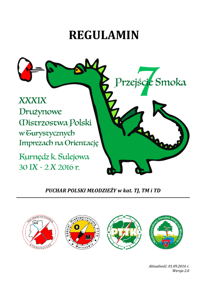 REGULAMIN PUCHAR POLSKI MŁODZIEŻY w kat. TJ, TM i TD Aktualność: 01.09.2016 r. Wersja 2.0 Termin i miejsce 30 września - 2 października 2016 r. (piątek – niedziela), Kurnędz (gm. Sulejów) Baza: Międzynarodowy Ośrodek Integracji Młodzieży „Pilica” ZMCh „Polska YMCA” Organizator Klub Imprez na Orientację STOWARZYSZE przy Oddziale Międzyuczelnianym PTTK w Warszawie stowarzysze.om.pttk.pl Współorganizatorzy Oddział Międzyuczelniany PTTK w Warszawie Zarząd Główny PTTK w Warszawie Międzynarodowy Ośrodek Integracji Młodzieży „Pilica” ZMCh „Polska YMCA” Cele imprezy wyłonienie Drużynowych Mistrzów Polski w Turystycznych InO, popularyzacja turystycznych imprez na orientację jako doskonałej formy wypoczynku, podnoszenie sprawności fizycznej uczestników i promowanie ruchu i zdrowego stylu życia, praktyczne potwierdzenie własnych umiejętności w posługiwaniu się mapą i kompasem, prezentacja walorów krajoznawczych Sulejowa i Lasów Sulejowskich, wymiana doświadczeń pomiędzy uczestnikami zawodów. Komitet organizacyjny Kierownik Imprezy: Barbara Szmyt Sędzia główny: Dariusz Walczyna Budowniczowie tras: Anna Kadłubowska (PInO nr leg. 718) (PInO nr leg. 420) Renata Łaska (PInO nr leg. 717) Tomasz Łaski (PInO nr leg. 716) Zuzanna Malanowska (PInO nr leg. 719) Paweł Rozwadowski (PInO nr leg. 699) Barbara Szmyt (PInO nr leg. 660) Dariusz Walczyna Aleksandra Waśko (OInO 48/2013/9) Sekretariat: Anna Malanowska, Ania Natusiewicz Kierownik Bazy: Tomasz Waśko ...oraz grono Członków i Sympatyków Klubu InO STOWARZYSZE 2 Forma, kategorie/trasy, etapy kat. seniorów TS [trasa dla zaawansowanych TZ] - 2 etapy dzienne i 1 nocny, zespoły 1-2 osobowe, 3x5 pkt. do OInO, kat. juniorów TJ [trasa dla średniozaawansowanych TU] - 2 etapy dzienne i 1 nocny, zespoły 1-2 osobowe, 3x5 pkt. do OInO; trasa zaliczana do PPM kat. TJ (dla osób urodzonych w latach 1996-1999) kat. młodzików TM [trasa dla niezaawansowanych TT] - 2 etapy dzienne i 1 nocny, zespoły 2-3 osobowe, 3x5 pkt. do OInO; trasa zaliczana do PPM kat. TM (dla osób urodzonych w latach 2000-2002) kat. dzieci TD [trasa dla początkujących TP] - 2 etapy dzienne i 1 nocny, zespoły 2-3 osobowe, 3x4 pkt. do OInO; trasa zaliczana do PPM kat. TD (dla osób urodzonych w roku 2003 i młodszych) trasa rowerowa TR - 2 etapy dzienne i 1 nocny, zespoły 1-2 osobowe, 3x5 pkt. do OInO trasa kajakowa TK - 2 etapy dzienne i 1 nocny, zespoły 2 osobowe, 3x5 pkt. do OInO Trasy towarzyszące trasa TO – etap nocny w ramach VII Przejścia Smoka - zespoły 1-3 osobowe, 3 pkt. do OInO trasa turystyczno-rekreacyjna TRInO – 1 pkt. do odznaki InO, MiniInO – 1 pkt. do odznaki InO. Punktacja i klasyfikacja Według Zasad Punktacji i Współzawodnictwa w Turystycznych Imprezach na Orientację KInO ZG PTTK – łącznie z ostatnimi zmianami (ino.pttk.pl/przepisy/przepisy.php). Na trasie TO planuje wprowadzić się odstępstwa od Regulaminów. Klasyfikacja zespołowa Podstawą klasyfikacji zespołowej jest suma punktów przeliczeniowych uzyskanych przez dany zespół w swojej kategorii/trasie podczas wszystkich trzech etapów. Klasyfikacja obejmuje także zespoły nie będące w składzie żadnej z drużyn. Klasyfikacja drużynowa DMP Podstawą klasyfikacji drużynowej DMP jest suma punktów przeliczeniowych uzyskanych przez wszystkie zespoły na wszystkich etapach. Pełny skład drużyny obejmuje: 1 dwuosobowy zespół w kategorii seniorów TS, 1 dwuosobowy zespół w kategorii juniorów TJ, 1 dwuosobowy zespół w kategorii młodzików TM, 1 dwuosobowy zespół na trasie rowerowej TR, 1 dwuosobowy zespół na trasie kajakowej TK, przy czym co najmniej jeden członek zespołu musi być pełnoletni. Uwaga! Każde środowisko może wystawić więcej niż jedną drużynę pod warunkiem pełnego składu każdej z wcześniejszych drużyn. We wszystkich kategoriach startują zespoły dwuosobowe, zaś skład zespołu nie może się zmieniać podczas trwania imprezy. Zgodnie z Regulaminami Turystycznych InO w drużynie może być maksymalnie jeden zespół jednoosobowy. Mapy Mapy czarno-białe lub kolorowe, nietypowe, w różnych skalach, częściowo przekształcone i aktualizowane. Teren Leśny, o różnej rzeźbie, przebieżności i wilgotności; wodny na trasie kajakowej i inny 3 Zgłoszenia i wpisowe Zgłoszenia zawierające imię, nazwisko, kategorię, rok urodzenia, klub i miejscowość, przynależność do PTTK, e-mail, telefon kontaktowy będą przyjmowane za pomocą formularza elektronicznego lub za pomocą karty zgłoszenia przesłanej do kierownika imprezy (na adres: szmytbarbara[a_z_ogonkiem]gmail.com) do 25.09.2016 r. (niedziela) do godz. 23:59. Po terminie wpisowe wzrasta o 10 zł i nie gwarantuje pełnych świadczeń. Wpisowe należy przesłać na konto Oddziału Międzyuczelnianego PTTK w Warszawie: 49 1140 1010 0000 3281 2500 1007 (z dopiskiem w tytule przelewu: “DMP 2016” i podaniem nazwisk) lub przekazać bezpośrednio kierownikowi imprezy (przed imprezą lub w bazie – jedynie po wcześniejszym uzgodnieniu!). Kategorie TD i TM TJ TS [trasy] [TP i TT] [TU] [TZ] Członkowie PTTK 60 zł 65 zł 70 zł 70 zł Niezrzeszeni 65 zł 70 zł 75 zł 75 zł TR i TK Udział tylko w etapach dziennych kat. TP/TD (bez obiadu i noclegu): 10 zł – termin zgłoszeń do 28.09. godz. 12:00 Bezpłatny lub zniżkowy udział mają osoby posiadające odpowiednie bilety (wydane przez KInO ZG lub MKInO) – tylko i wyłącznie pod warunkiem zgłoszenia w terminie. W innym przypadku obowiązuje wpisowe w ww. kwotach. Dodatkowe informacje pod tel.: 501 160 903, e-mail: szmytbarbara[a_z_ogonkiem]gmail.com Informacje bieżące i komunikat techniczny (do 28.09.2016 r.): stowarzysze.om.pttk.pl Ramowy program imprezy Piątek, 30.09.2016 r. od godz. 18:00 - praca sekretariatu; przyjmowanie uczestników w bazie, zakwaterowanie, możliwość startu w TRInO w Sulejowie od 22:00 - Nocny Smok, czyli etap niespodzianka w ramach VII 