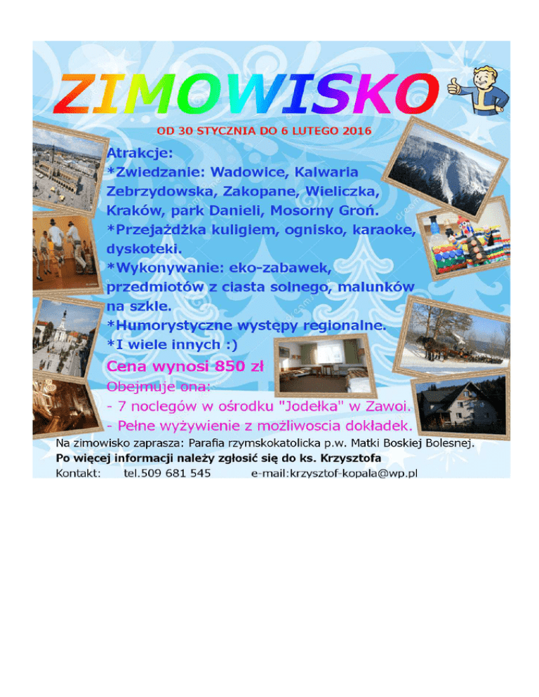 Parafia rzymskokatolicka p.w. Matki Boskiej Bolesnej ks. Krzysztof Kopala ul. Welecka 17, 72-006 Mierzyn tel. 509 681 545 e-mail: [email protected] Zimowisko w D.W. Jodełka w Zawoi pod Babią Górą w terminie 30 stycznia– 6 lutego 2016 (wyjazd 29 stycznia wieczorem) (powrót 7 lutego rano) MIEJSCOWOŚĆ Zawoja jest górską miejscowością wypoczynkową w Beskidzie Wysokim położoną u stóp Babiej Góry – najwyższego szczytu Beskidów. Zima w Zawoi to nie tylko piękne krajobrazy, ośnieżone góry i lasy, ale także wiele atrakcji. Podczas ferii zimowych organizowane są cykliczne imprezy „Zima w Zawoi”, liczne zawody sportowe oraz wyścigi snowmobili. Dom wypoczynkowy „Jodełka” zapewnia oryginalny program pobytu, w czasie którego dzieci przeżywać będą niezliczone atrakcje. OPIS BUDYNKU Kameralny dom wypoczynkowy „Jodełka” położony w malowniczej, górskiej dolinie, w bezpośrednim sąsiedztwie lasu, z dostępem do rzeczki. Przy budynku teren rekreacyjny, miejsce na ognisko, teren ogrodzony. Zapewniamy pokoje 2, 3, 4-ro osobowe. Wszystkie pokoje posiadają własne łazienki. Wyżywienie zapewniamy w jadalni w tym samym budynku. Do dyspozycji dzieci przestronne hole-świetlice, wyposażone w stół do ping-ponga, piłkarzyki, TV. Ośrodek zapewnia opiekę wychowawców i ks. opiekuna – kierownika zimowiska, animatora, który zorganizuje atrakcyjne zabawy oraz zajęcia manualne. WYŻYWIENIE Kuchnia domowa. Wyżywienie obejmuje cztery posiłki dziennie: śniadanie, obiad, podwieczorek (serwowany przy obiedzie) oraz kolację. Posiłki obfite, dokładki bez ograniczeń. Przez całą dobę dostępny „kącik głodomora”. (chleb, dżem, masło, wędlina, ser, miód, pasztet, herbata lub kompot). W przypadku całodniowej wycieczki dzieci jedzą śniadanie otrzymują prowiant na wycieczkę a po powrocie jest obiadokolacja. CENA pobytu Koszt turnusu wynosi 850 zł od osoby. Cena obejmuje: 1. 7 noclegów 2. całodzienne wyżywienie rozpoczęte śniadaniem w dniu pierwszym, zakończone śniadaniem + prowiant w dniu ostatnim. TRANSPORT Pociąg relacji Szczecin – Kraków – Szczecin. (rezerwacja dla grupy tam i z powrotem) a na miejscu w Krakowie odbierze nas autokar. ( duży bagaż jedzie oddzielnie) . Wyjazdy i atrakcje w czasie pobytu na zimowisku: • Wycieczka autokarowa do Wadowic i Kalwarii Zebrzydowskiej. Kalwaria Zebrzydowska jedno z większych centrów pielgrzymkowych w Polsce. Zabytkowy klasztor gdzie dzieci spotykają się z jednym z braci zakonnych, który opowiada o klasztorze i codziennym swoim dniu. Potem krótki spacer po jednej z najsłynniejszej z dróg krzyżowych w Polsce. Wadowice miasto narodzin Papieża Jana Pawła II. Dzieci odwiedzą jego dom gdzie urządzona jest ekspozycja poświęcona jego życiu, fotografie i przedmioty których używał. • Wycieczka autokarowa do Zakopanego. Całodzienna wycieczka autokarowa do Zakopanego. Wyjazd wyciągiem krzesełkowym 5-cio osobowym na grzbiet Gubałówki, zjazd kolejką z Gubałówki, spacer Krupówkami, zwiedzanie cmentarza na Pęksowym Brzysku, Sanktuarium na Krzeptówkach, oraz Wielkiej Krokwi. • Wycieczka autokarowa do Wieliczki - Zwiedzanie Kopalni Soli. Zabytkowa Kopalnia Soli w Wieliczce stanowi jedyny obiekt górniczy na świecie, czynny bez przerwy od średniowiecza do chwili obecnej. Magiczną podróż labiryntem solnych korytarzy rozpoczniemy od kaplicy św. Kingi, następnie wielkie, podziemne sale balowe, bezdenne studnie i wiele innych, niezwykłych miejsc. • Zwiedzanie Krakowa w dniu wyjazdowym – zwiedzanie sanktuarium w Łagiewnikach oraz Starego Miasta w Krakowie. Trasa wycieczki prowadzi trasą królewską od Barbakanu przez Bramę Floriańską do Zamku na wzgórzu wawelskim, obejmuje zwiedzanie Kościoła Mariackiego, Sukiennic, Katedry na Wawelu. • Wycieczki po Zawoi : - Wycieczka do Parku Czarnego Daniela. W parku tym jeleniowate są na wyciągnięcie ręki. W różnych porach dnia i roku można być świadkiem zachowań tych pięknych zwierząt. A ich obserwacja przynosi wiele satysfakcji. Dzieci będą mogły karmić zwierzęta z ręki - Wycieczka do Muzeum Babiogórskiego Parku Narodowego. Jest to Ośrodek przy Babiogórskim Parku Narodowym, który od 1976 roku jest rezerwatem biosfery Unesco. Zgromadzono tam eksponaty dotyczące flory i fauny naszych terenów a także folkloru i ekologii. - Wycieczka na Mosorny Groń. Wyjście szlakiem turystycznym na szczyt Mosornego Gronia – doskonały punkt widokowy na pasmo Babiej Góry. Następnie zjazd kolejką linową do Zawoi Policzne. W ramach pobytu wiele atrakcji m.in.: - pogadanka z rzeźbiarzem, malowanie figurek ptaszków beskidzkich wykonywanie eko-zabawek (zwierzątek) z siana, humorystyczny występ regionalny – gawędziarzy zawojskich, lekcje malowania na szkle w technice konturowej, „beskidzkie anioły”- zajęcia z ciastem solnym zabawę muzyczną karaoke, dyskoteki, kulig- przejażdżka saniami lub wozami konnymi (w zależności od warunków śniegowych), ognisko z pieczeniem kiełbasek. Informacje praktyczne: Odpowiedzialny za zimowisko: ks. Krzysztof Kopala – wikariusz parafii Matki Bożej Bolesnej w Mierzynie. tel. 509 681 545 [email protected] Wychowawcy: Pani Natalia Czurpalewicz tel. ………….(zostanie podany rodzicom na dworcu w dniu wyjazdu) Pani Joanna Kościelniak tel. ………...….(zostanie podany rodzicom na dworcu w dniu wyjazdu) Pani Magdalena Bartnicka tel. ………….(zostanie podany rodzicom na dworcu w dniu wyjazdu) Miejsce zimowiska: GAZDA – TURYSTYKA – PRZYGODA – WYPOCZYNEK Zawoja Mosorne nr 2103 34-223 Zawoja tel. 33 877 56 24 tel. 606 972 192 http://www.gazda.com.pl Dzieci zabierają ze sobą tylko mały plecak, który będzie potrzebny na wycieczki czasie trwania zimowiska. Duży bagaż pojedzie oddzielnie. Informacje o godzinie wyjazdu miejscu zbiórki zakończeniu zimowiska także godzina i miejsce złożenia i odebrania dużego bagażu (zostaną podane po 15 gr
