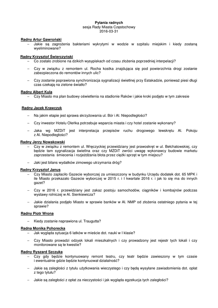 Pytania radnych sesja Rady Miasta Częstochowy 2016-03-31 Radny Artur Gawroński − Jakie są zagrożenia bakteriami wykrytymi w wodzie w szpitalu miejskim i kiedy zostaną wyeliminowane? Radny Krzysztof Świerczyński − Co zostało zrobione na dzikich wysypiskach od czasu złożenia poprzedniej interpelacji? − Czy w związku z remontem ul. Rocha kostka znajdująca się pod powierzchnia drogi zostanie zabezpieczona do remontów innych ulic? − Czy zostanie poprawiona synchronizacja sygnalizacji świetlnej przy Estakadzie, ponieważ piesi długi czas czekają na zielone światło? Radny Albert Kula − Czy Miasto ma plan budowy oświetlenia na stadionie Raków i jakie kroki podjęto w tym zakresie Radny Jacek Krawczyk − Na jakim etapie jest sprawa skrzyżowania ul. Bór i Al. Niepodległości? − Czy inwestor Hotelu Oleńka potrzebuje wsparcia miasta i czy hotel zostanie wykonany? − Jaka wg MZDiT jest z Al. Niepodległości? interpretacja przepisów ruchu drogowego lewskrętu Al. Pokoju Radny Jerzy Nowakowski − Czy w związku z remontem ul. Wręczyckiej przewidziany jest prawoskręt w ul. Bełchatowskiej, czy będzie tam sygnalizacja świetlna oraz czy MZDiT zwróci uwagę wykonawcy budowie marketu zaprzestania śmiecenia i rozjeżdżania błota przez ciężki sprzęt w tym miejscu? − Jaki jest bilans wydatków zimowego utrzymania dróg? Radny Krzysztof Janus − Czy Miasto zapłaciło Gazecie wyborczej za umieszczony w budynku Urzędu dodatek dot. 65 MPK i ile Miasto przekazało Gazecie wyborczej w 2015 r. i I kwartale 2016 r. i jak to się ma do innych gazet? − Czy w 2016 r. przewidziany jest zakaz postoju samochodów, ciągników i kombajnów podczas wystawy rolniczej w Al. Sienkiewicza? − Jakie działania podjęło Miasto w sprawie banków w Al. NMP od złożenia ostatniego pytania w tej sprawie? Radny Piotr Wrona − Kiedy zostanie naprawiona ul. Traugutta? Radna Monika Pohorecka − Jak wygląda sytuacja 6 latków w mieście dot. nauki w I klasie? − Czy Miasto prowadzi odzysk lokali mieszkalnych i czy prowadzony jest rejestr tych lokali i czy monitorowane są te kwestie? Radny Ryszard Szczuka − Czy gdy będzie kontynuowany remont teatru, czy teatr będzie zawieszony w tym czasie i ewentualnie gdzie będzie kontynuował działalność? − Jakie są zaległości z tytułu użytkowania wieczystego i czy będą wysyłane zawiadomienia dot. opłat z tego tytułu? − Jakie są zaległości z opłat za nieczystości i jak wygląda egzekucja tych zaległości? − Czy lodowisko miejskie zostanie zadaszone? − Czy III Aleja NMP będzie częściowo zamknięta? Radny Piotr Strach − Jak wygląda sprawa czyszczenia Al. NMP z plam i zabrudzeń? − Kiedy rozpocznie się remont przejścia podziemnego pod Al. Wyzwolenia i czy będzie współfinansowany ze środków zewnętrznych? − Czy została podjęta decyzja dot. wycinki drzew w Parku Tysiąclecie w związku z planowaną tam inwestycją. Kiedy drzewa zostaną wycięte i jakie? Radny Andrzej Sowa − Jakie placówki zostały wytypowane do prac w związku z uchwałą dot. przystosowania świetlic? − Jaki wpływ ma miasto na stawki dostawy wody i ścieków przez Wodociągi? − Kiedy zostaną utwardzone miejsca parkingowe przy przedszkolu nr 29 przy ul. Osada Młyńska? Radna Barbara Gieroń − Dlaczego nie został dokończony remont ul. Przyjemnej? Radny Łukasz Kot − Jakie środki Miasto przekazało na sport dzieci i młodzieży w latach od 2010 do 2016 i jak wygląda zestawienie środków na kluby piłkarskie w tym zakresie?