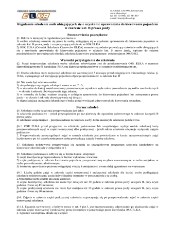 ul. Urszuli 3; 65-001 Zielona Góra www.elka-osk.pl tel. 601 734 968, 607 884 867 e-mail: [email protected] Regulamin szkolenia osób ubiegających się o uzyskanie uprawnienia do kierowania pojazdem w zakresie kat. B prawa jazdy Postanowienia początkowe §1. Ilekroć w niniejszym regulaminie jest mowa o: 1) osobie szkolonej rozumie się przez to osobę, ubiegającą się o uzyskanie uprawnienia do kierowania pojazdem w zakresie kat. B prawa jazdy i rozpoczynającą szkolenie w OSK ELKA 2) OSK ELKA (Ośrodek Szkolenia Kierowców ELKA) rozumie się podmiot prowadzący szkolenie osób ubiegających się o uzyskanie uprawnienia do kierowania pojazdem w zakresie kat. B prawa jazdy, wpisany do rejestru przedsiębiorców prowadzących ośrodek szkolenia kierowców pod numerem ewidencyjnym 00850862. Warunki przystąpienia do szkolenia §2. Przed rozpoczęciem szkolenia osoba szkolona zobowiązana jest do poinformowania OSK ELKA o numerze identyfikującym profil kandydata (PKK) na kierowcę umieszczonym w systemie teleinformatycznym. §3. Osoba szkolona może rozpocząć szkolenie nie wcześniej niż 3 miesiące przed osiągnięciem minimalnego wieku, tj. 18 lat, wymaganego od kierującego pojazdem objętego uprawnieniem w zakresie kat. B §4. Nie może być szkolona osoba: 1) niespełniająca wymagań, o których mowa w art. 2 i 3; 2) w stosunku do której został orzeczony prawomocnym wyrokiem sądu zakaz prowadzenia pojazdów mechanicznych – w okresie i zakresie obowiązywania tego zakazu; 3) w stosunku do której wydano decyzję o cofnięciu uprawnienia do kierowania pojazdami lub zatrzymaniu prawa jazdy – w okresie i zakresie obowiązywania tej decyzji; 4) nieposiadająca orzeczenia lekarskiego o braku przeciwwskazań zdrowotnych do kierowania pojazdem. Formy szkoleń §5. Szkolenie osoby szkolonej przeprowadzane jest jako: 1) szkolenie podstawowe – przed przystąpieniem po raz pierwszy do egzaminu państwowego w zakresie kategorii B prawa jazdy; 2) szkolenie uzupełniające – przeprowadzane na wniosek osoby, która ukończyła szkolenie podstawowe. §6.1. OSK ELKA przed przyjęciem na szkolenie podstawowe lub uzupełniające wydaje osobie szkolonej kartę przeprowadzonych zajęć w części teoretycznej albo praktycznej – jeżeli zakres szkolenia obejmuje wyłącznie zajęcia praktyczne. 2. Przeprowadzenie poszczególnych zajęć w ramach szkolenia jest potwierdzane w karcie przeprowadzonych zajęć każdorazowo po ich zakończeniu przez osobę prowadzącą zajęcia i osobę szkoloną. §7. Szkolenie podstawowe przeprowadza się zgodnie ze szczegółowym programem szkolenia kandydatów na kierowców określonych w załączniku nr 1. §8. Szkolenie podstawowe odbywa się w formie kursu i obejmuje: 1) część teoretyczną przeprowadzaną w formie wykładów i ćwiczeń; 2) część praktyczną w zakresie kierowania pojazdem, przeprowadzaną na placu manewrowym, w ruchu miejskim, w ruchu poza obszarem zabudowanym; 3) kontrolne sprawdzenie poziomu osiągniętej wiedzy i umiejętności, zwane dalej egzaminem wewnętrznym. §9.1. Liczbę godzin zajęć w zakresie części teoretycznej i praktycznej szkolenia dla każdej osoby podlegającej szkoleniu podstawowemu ustala indywidualnie instruktor w porozumieniu z tą osobą. 2.Minimalna liczba godzin dla zajęć zakresie: 1) części teoretycznej szkolenia nie może być mniejsza niż 30 godzin w zakresie prawa jazdy kategorii B, przy czym godzina równa się 45 minutom; 2) części praktycznej szkolenia nie może być mniejsza niż 30 godzin w zakresie prawa jazdy kategorii B, przy czym godzina równa się 60 minutom. §10. Zajęcia w zakresie części praktycznej szkolenia rozpoczynają się po przeprowadzeniu zajęć w zakresie części teoretycznej szkolenia. §11.1. Egzamin wewnętrzny, o którym mowa w art. 8 pkt 3, jest przeprowadzany odpowiednio po ukończeniu zajęć w zakresie części teoretycznej i praktycznej przez instruktora wyznaczonego przez kierownika OSK ELKA. 2. Egzamin wewnętrzny składa się z części: 1) teoretycznej – przeprowadzanej w sali wykładowej przy użyciu testu komputerowego; 2) praktycznej – przeprowadzanej na placu manewrowym i w ruchu drogowym po uzyskaniu przez osobę szkoloną pozytywnego wyniku z części teoretycznej egzaminu. 3. Pozytywny wynik części teoretycznej egzaminu jest ważny przez okres 6 miesięcy od dnia jego uzyskania. 4. Zakres części teoretycznej egzaminu wewnętrznego, liczba pytań egzaminacyjnych, ich tematyka, sposób oceny części teoretycznej egzaminu wewnętrznego oraz czas jego przeprowadzenia są zgodne ze sposobem przeprowadzania części teoretycznej egzaminu państwowego. 5. Zakres części praktycznej egzaminu wewnętrznego, kryteria oceny oraz czas trwania, z zastrzeżeniem ust. 6, są zgodne ze sposobem przeprowadzania części praktycznej egzaminu państwowego. 6.W trakcie przeprowadzania części praktycznej egzaminu wewnętrznego realizuje się wszystkie przewidziane dla egzaminu państwowego zadania egzaminacyjne, bez względu na liczbę popełnionych błędów, z wyjątkiem przypadku, gdy zachowanie osoby szkolonej zagraża bezpośrednio życiu i zdrowiu uczestników ruchu drogowego. 7.W trakcie części praktycznej egzaminu wewnętrznego instruktor wypełnia arkusz przebiegu części praktycznej egzaminu wewnętrznego i wyszczególnia w nim błędy popełnione przez osobę szkoloną. 8.W przypadku zakończenia egzaminu wewnętrznego z wynikiem negatywnym instruktor prowadzący ustala wraz z osobą szkoloną, na podstawie wypełnionego arkusza przebiegu części praktycznej egzaminu wewnętrznego, dalszy zakres szkolenia niezbędny do uzyskania wszystkich umiejętności. 9.Arkusz przebiegu części praktycznej egzaminu wewnętrznego podpisują instruktor przeprowadzający egzamin, instruktor który prowadził szkolenie i osoba szkolona. §12.1. OSK ELKA wydaje osobie szkolonej zaświadczenie o ukończeniu szkolenia, jeżeli osoba ta 1) uczestniczyła