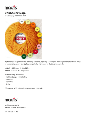 KORDONEK MAJA nr katalogowy: KORDONEK MAJA Wykonany z długowłóknistej bawełny czesanej, opalany i podwójnie merceryzowany kordonek MAJA to kordonek perłowy o wyjątkowym połysku oferowany w dwóch grubościach: MAJA 5 - 120 tex x 2, 50g/210m MAJA 8 - 65 tex x 2, 50g/340m Przeznaczony do technik: - haft hardanger i inne hafty, - mereżka, - szydełko, - druty. Oferowany w 17 kolorach, pakowany po 10 sztuk. ul.Odolanowska 96 63-400 Ostrów Wielkopolski tel. 62 735 41 48 tel. 62 738 05 52 [email protected] [email protected]