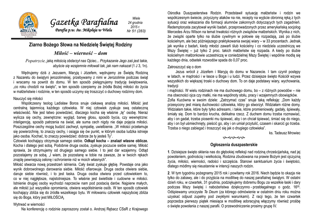 Gazetka Parafialna Parafia p.w. św. Mikołaja w Wielu Wiele 24 grudnia 2015 r. Nr 51 (283) Ziarno Bożego Słowa na Niedzielę Świętej Rodziny Miłość – wierność – dom Popatrzcie, jaką miłością obdarzył nas Ojciec... Przykazanie Jego zaś jest takie, abyście się wzajemnie miłowali tak, jak nam nakazał (1 J 3, 1n). Wędrujemy dziś z Jezusem, Maryją i Józefem, wędrujemy ze Świętą Rodziną z Nazaretu do świątyni jerozolimskiej, przebywamy z nimi w Jerozolimie podczas świąt i wracamy na powrót do domu. W ten sposób pielęgnujemy tradycję świętowania, „co roku chodzili na święto”, w ten sposób czerpiemy ze źródła Bożej miłości do życia w małżeństwie i rodzinie, w ten sposób uczymy się troszczyć o duchowy rodzinny dom. Nauczyć się miłości Współczesny teolog Ladisław Boros snuje ciekawą analizę miłości. Miłość jest centralną tajemnicą każdego człowieka. W niej człowiek zyskuje swą ostateczną właściwość. Nie jest łatwo powiedzieć, dlaczego kocha się właśnie „tę” osobę. Nieraz wylicza się cechy, zewnętrzne: wygląd, barwę głosu, sposób bycia, czy wewnętrzne: inteligencję, sposób patrzenia na świat, ale suma cech nigdy nie daje pojęcia miłości. Poszczególne cechy mogą budzić zachwyt, sympatię, uwielbienie. „W miłości przełamuje się powierzchnię, to znaczy cechy, i osiąga się ów punkt, w którym osoba ludzka istnieje jako osoba. Kochać, to znaczy powiedzieć: dobrze że ty jesteś Ty”. Człowiek kochający otrzymuje samego siebie. Odkąd kocha – znalazł własne oblicze. Kocha i dlatego jest sobą. Podobnie druga osoba, zyskuje poczucie siebie samej. Miłość sprawia, że otrzymujemy od drugiego samego siebie. I to jest dar wzajemny. Odtąd pozostajemy ze sobą. „I wiem, że pozostanę w tobie na zawsze, że w twoich rękach znajdę pewniejszą osłonę i schronienie niż w moich własnych”. Miłość stwarza nową przestrzeń istnienia. Cały świat zyskuje głębię. Powstaje ona jako wynik dobrowolnego darowania siebie. Miłość ofiarowuje. Druga osoba otwiera siebie, daruje siebie również, i to jest łaska. Druga osoba otwiera przed człowiekiem to, co w niej najgłębsze, najistotniejsze. To właśnie jest świetliste i cudowne w miłości. Istnienie drugiej osoby wychodzi naprzeciw nam pod postacią darów. Najpierw małych, ale miłość już wszystkie opromienia, otwiera współistnienie osób. W ten sposób człowiek kochający zbliża się do źródła wszelkiego bytu. W miłowaniu człowiek najszybciej zbliża się do Boga, który jest MIŁOŚCIĄ. Wytrwać w wierności Na konferencję o rodzinie zaproszony został o. Andrzej Rębacz CSsR z Krajowego Ośrodka Duszpasterstwa Rodzin. Przedstawił sytuację małżeństw i rodzin we współczesnym świecie, przyczyny ataków na nie, recepty na wyjście obronną ręką z tych sytuacji oraz wskazania dla formacji alumnów zakonnych dotyczących tych zagadnień. Redemptorysta zacytował wyniki badań, przeprowadzonych przez amerykańską socjolog Mercedes Arzu Wilson na temat trwałości różnych związków małżeńskich. Wynika z nich, że związki oparte tylko na ślubie cywilnym w połowie się rozpadają, zaś po ślubie kościelnym, ale bez późniejszego praktykowania swojej wiary – w 33 procentach. Jednak, jak wynika z badań, kiedy młodzi zawarli ślub kościelny i co niedziela uczestniczą we Mszy Świętej – już tylko 2 proc. takich małżeństw się rozpada. A kiedy po ślubie kościelnym małżonkowie uczestniczą w coniedzielnej Mszy Świętej i wspólnie modlą się każdego dnia, odsetek rozwodów spada do 0,07 proc. Zatroszczyć się o dom Jezus wrócił z Józefem i Maryją do domu w Nazarecie. I tam czynił postępy w latach, w mądrości i w łasce u Boga i u ludzi. Przez dzisiejsze święto Kościół wzywa wszystkich do większej troski o duchowy dom. To on daje podstawy wiary, wychowania, tradycji i mądrości. W wielu rodzinach nie ma duchowego domu, bo – z różnych powodów – nie ma obecności ojca czy matki, nie ma wspólnoty stołu, pracy i wzajemnych obowiązków. Zofia Kucówna w swoim dziele: „Zatrzymać czas” snuje taką refleksję: „Dom każdy przesycony jest miarą duchowości człowieka, który go stworzył. Widziałam różne domy. Widziałam takie, które były tylko adresami, i takie, które promieniowały, gadały, śpiewały, śmiały się. Dom to bardzo krucha, delikatna rzecz. Z duchem domu trzeba rozmawiać, aby i on gadał, trzeba piosenki mu śpiewać, aby i on chciał śpiewać, śmiać się do niego, aby i on był uśmiechnięty, pieścić go, aby i on umiał przytulić, czasem i skarcić go trzeba. Trzeba o niego zabiegać i troszczyć się jak o drugiego człowieka”. ks. Tadeusz Mrowiec Ogłoszenia duszpasterskie 1. Dzisiejsze święto skłania nas do głębokiej refleksji nad rodziną chrześcijańską, nad jej powołaniem, godnością i wielkością. Rodzina zbudowana na prawie Bożym jest ojczyzną życia, miłości, wierności, radości i szczęścia. Stanowi sanktuarium życia i świętości, dlatego módlmy się nieustannie w intencji naszych rodzin. 2. W tym tygodniu pożegnamy 2015 rok i powitamy rok 2016. Niech będzie to okazja nie tylko do zabawy, ale i do przyjścia na modlitwę do naszej parafialnej świątyni. W ostatni dzień roku, w czwartek, 31 grudnia, podziękujemy dobremu Bogu za wszelkie łaski i dary podczas Mszy świętej i nabożeństwa dziękczynno - przebłagalnego o godz. 1600. Odśpiewamy uroczyste Te Deum (za którego odmówienie w ostatnim dniu roku można uzyskać odpust zupełny pod zwykłymi warunkami). Z racji tego, że ten czwartek poprzedza pierwszy piątek miesiąca w modlitwę adoracyjną włączymy również prośbę o święte powołania z naszej parafii. O przewodniczenie prosimy grupę IV. O godzinie 1500 Koronka do Bożego Miłosierdzia. Zachęcamy do udziału. Plan odwiedzin duszpasterskich – czyli kolę