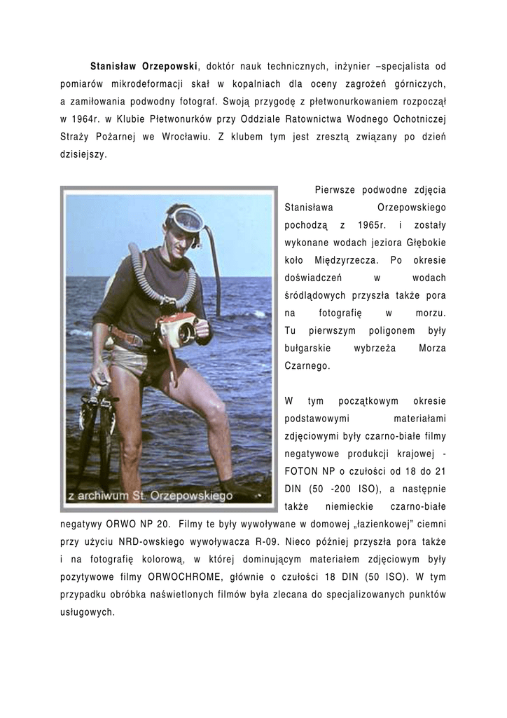 Stanisław Orzepowski, doktór nauk technicznych, inŜynier –specjalista od pomiarów mikrodeformacji skał w kopalniach dla oceny zagroŜeń górniczych, a zamiłowania podwodny fotograf. Swoją przygodę z płetwonurkowaniem rozpoczął w 1964r. w Klubie Płetwonurków przy Oddziale Ratownictwa Wodnego Ochotniczej StraŜy PoŜarnej we Wrocławiu. Z klubem tym jest zresztą związany po dzień dzisiejszy. Pierwsze podwodne zdjęcia Stanisława pochodzą Orzepowskiego z 1965r. i zostały wykonane wodach jeziora Głębokie koło Międzyrzecza. doświadczeń Po w okresie wodach śródlądowych przyszła takŜe pora na fotografię Tu pierwszym bułgarskie w morzu. poligonem były wybrzeŜa Morza początkowym okresie Czarnego. W tym podstawowymi materiałami zdjęciowymi były czarno-białe filmy negatywowe produkcji krajowej FOTON NP o czułości od 18 do 21 DIN (50 -200 ISO), a następnie takŜe niemieckie czarno-białe negatywy ORWO NP 20. Filmy te były wywoływane w domowej „łazienkowej” ciemni przy uŜyciu NRD-owskiego wywoływacza R-09. Nieco później przyszła pora takŜe i na fotografię kolorową, w której dominującym materiałem zdjęciowym były pozytywowe filmy ORWOCHROME, głównie o czułości 18 DIN (50 ISO). W tym przypadku obróbka naświetlonych filmów była zlecana do specjalizowanych punktów usługowych. Na pierwsze wyposaŜenie do fotografii podwodnej składał się aparat fotograficzny (ze spręŜynowym przesuwu UPK Leningrad filmu) typy aparat jak produkcji napędem oraz obudowa sztywnego. Zarówno i ZSRR. obudowa były Zestaw taki, z racji dość duŜej produkcji był jednym z popularniejszych rozwiązań w fotografii podwodnej dostępnym w naszym kraju. Później z obudową stosowany był aparat Zorkij4, równieŜ produkcji radzieckiej. Całość uzupełniła lampa błyskowa własnej konstrukcji o energii błysku rzędu 120J. Sercem tej lampy był Ŝarnik typu IFK-120, wykorzystywany w wielu konstrukcjach radzieckich fotograficznych. lamp błyskowych. MoŜliwość doświetlania zdjęć zewnętrznym źródłem światła błyskowego sprawiła, ze Stanisław Orzepowski zaczął specjalizować się realizacji nocnych przyrodniczych, zdjęć zwłaszcza wykonywanych w zbliŜeniowej. Ta technice forma fotografowania podwodnego stała się z techniką preferowana i większość zachowanych zdjęć wykonanych w naszych wodach to właśnie portrety ryb. Kilka lat doświadczeń w fotografii podwodnej zaowocowało publikacjami fachowymi m.in. : ‘Fotografia w wodzie” ( Fotografia, 1967r. zeszyt 10 str. 229-231), „Technika fotografowania w wodzie” (Wrocław 1969, Rocznik Sekcji Fotografii Naukowej ZPAF, str. 75-87), „Doświadczenia z zakresu fotografowania z elektronową lampą błyskową” (Wrocław 1971, Rocznik Sekcji Fotografii Naukowej ZPAF, str. 9093). Jednak z punktu widzenia krajowego środowiska nurkowego najistotniejszą pozycję przyniósł rok 1975, w którym Wydawnictwa NaukoTechniczne wydały autorstwa ksiąŜkę Stanisława Orzepowskiego zatytułowaną: „Fotografia Podwodna”. Była to pierwsza od ponad piętnastu lat pozycja na naszym wydawniczym, zarówno i rynku poświęcona teoretycznym praktycznym fotografowania tak problemom pod wodą, zwłaszcza w realiach krajowych. W tym miejscu zacytować warto moŜe notkę od fotografowania, sprzęt wydawnictwa: „W ksiąŜce omówiono środowisko i warunki i materiały potrzebne w tej dziedzinie oraz technikę wykonywania fotografii podwodnych przy oświetleniu naturalnym i sztucznym. ….. KsiąŜka jest bogato ilustrowana przykładami zdjęć podwodnych. Jest ona przeznaczona dla płetwonurków foto-amatorów, moŜe być pomocą dla specjalistów tych dziedzin nauki i techniki, gdzie fotografia podwodna jest środkiem dokumentacji naukowej, np. w budownictwie wodnym, rybołówstwie, ratownictwie morski, a takŜe w badaniach z zakresu geologii podwodnej i biologii morskiej.” Pomimo upływu juŜ prawie czterdziestu lat od pojawienia się na rynku, „Fotografia Podwodna” Stanisława Orzepowskiego zawiera w dalszym ciągu treści, które mogą być przydatne podwodnym fotografom w doskonaleniu swojego warsztatu, zwłaszcza, gdy ich celem jest dokument z naszych wód. Przeglądając zarówno pierwsze czarno-białe fotografie Stanisława Orzepowskiego jak i pierwsze zdjęcia kolorowe z okresu „orwowskiego”, warto zapamiętać sobie przesłanie, jakie ich autor kieruje do młodego pokolenia podwodnych fotografów: Z fotografowaniem Ŝeglarstwa, windsurfingu czy z fotografią podwodną jest tak samo. Wszystkie zdjęcia są do siebie podobne, jeŜeli nie wykrzesa się ze zdjęcia czegoś, czego jeszcze nie było. Szukanie właśnie tego "czegoś" to największa frajda, dlatego trzeba duŜo fotografować - czasem Neptun coś podrzuca, szczególnie upartym ...