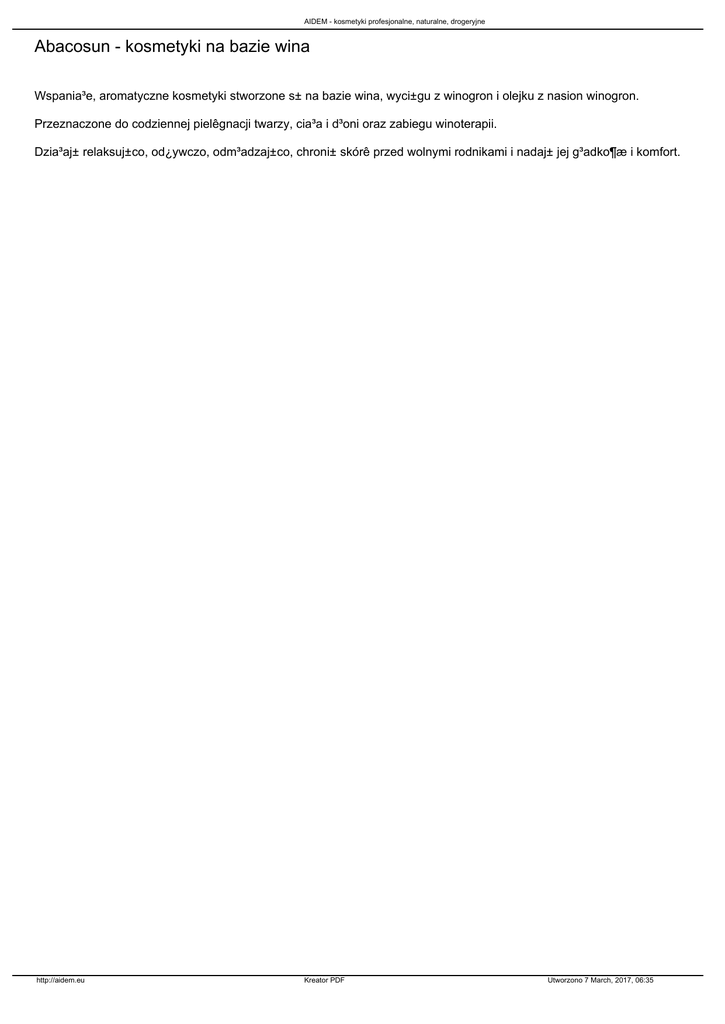 AIDEM - kosmetyki profesjonalne, naturalne, drogeryjne Abacosun - kosmetyki na bazie wina Wspania³e, aromatyczne kosmetyki stworzone s± na bazie wina, wyci±gu z winogron i olejku z nasion winogron. Przeznaczone do codziennej pielêgnacji twarzy, cia³a i d³oni oraz zabiegu winoterapii. Dzia³aj± relaksuj±co, od¿ywczo, odm³adzaj±co, chroni± skórê przed wolnymi rodnikami i nadaj± jej g³adko¶æ i komfort. http://aidem.eu Kreator PDF Utworzono 7 March, 2017, 06:35