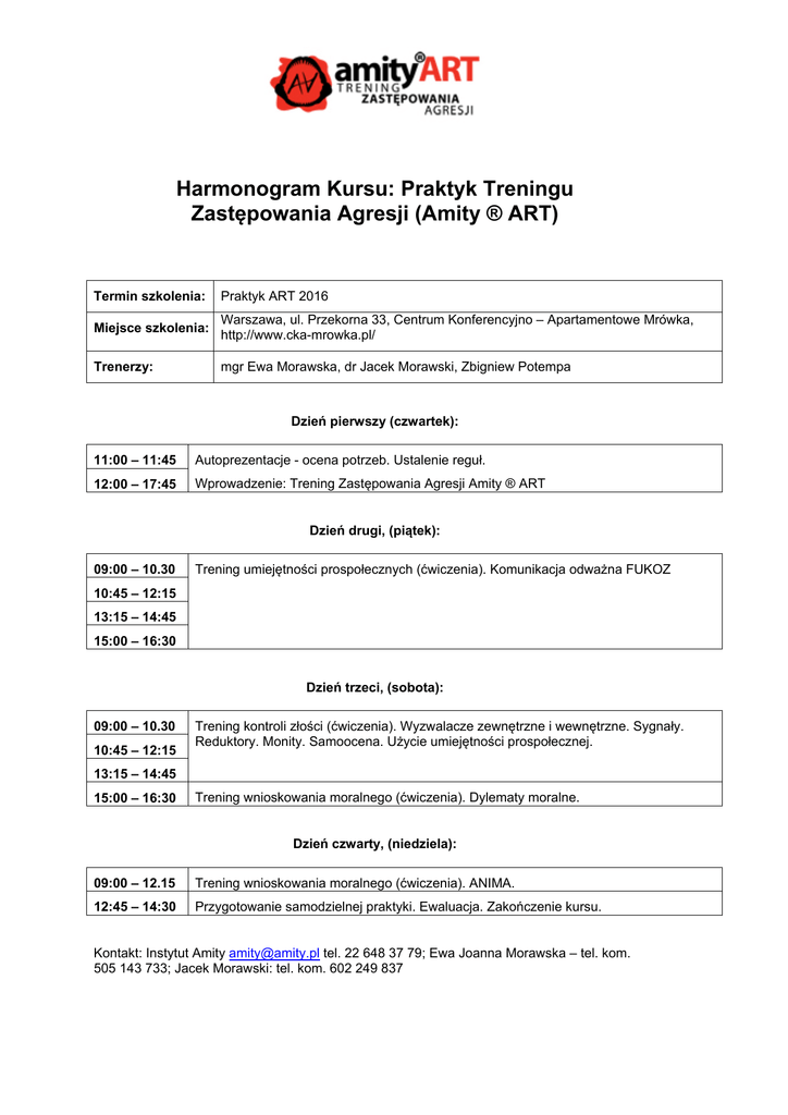 Harmonogram Kursu: Praktyk Treningu Zastępowania Agresji (Amity ® ART) Termin szkolenia: Praktyk ART 2016 Miejsce szkolenia: Warszawa, ul. Przekorna 33, Centrum Konferencyjno – Apartamentowe Mrówka, http://www.cka-mrowka.pl/ Trenerzy: mgr Ewa Morawska, dr Jacek Morawski, Zbigniew Potempa Dzień pierwszy (czwartek): 11:00 – 11:45 Autoprezentacje - ocena potrzeb. Ustalenie reguł. 12:00 – 17:45 Wprowadzenie: Trening Zastępowania Agresji Amity ® ART Dzień drugi, (piątek): 09:00 – 10.30 Trening umiejętności prospołecznych (ćwiczenia). Komunikacja odważna FUKOZ 10:45 – 12:15 13:15 – 14:45 15:00 – 16:30 Dzień trzeci, (sobota): 09:00 – 10.30 10:45 – 12:15 Trening kontroli złości (ćwiczenia). Wyzwalacze zewnętrzne i wewnętrzne. Sygnały. Reduktory. Monity. Samoocena. Użycie umiejętności prospołecznej. 13:15 – 14:45 15:00 – 16:30 Trening wnioskowania moralnego (ćwiczenia). Dylematy moralne. Dzień czwarty, (niedziela): 09:00 – 12.15 Trening wnioskowania moralnego (ćwiczenia). ANIMA. 12:45 – 14:30 Przygotowanie samodzielnej praktyki. Ewaluacja. Zakończenie kursu. Kontakt: Instytut Amity [email protected] tel. 22 648 37 79; Ewa Joanna Morawska – tel. kom. 505 143 733; Jacek Morawski: tel. kom. 602 249 837