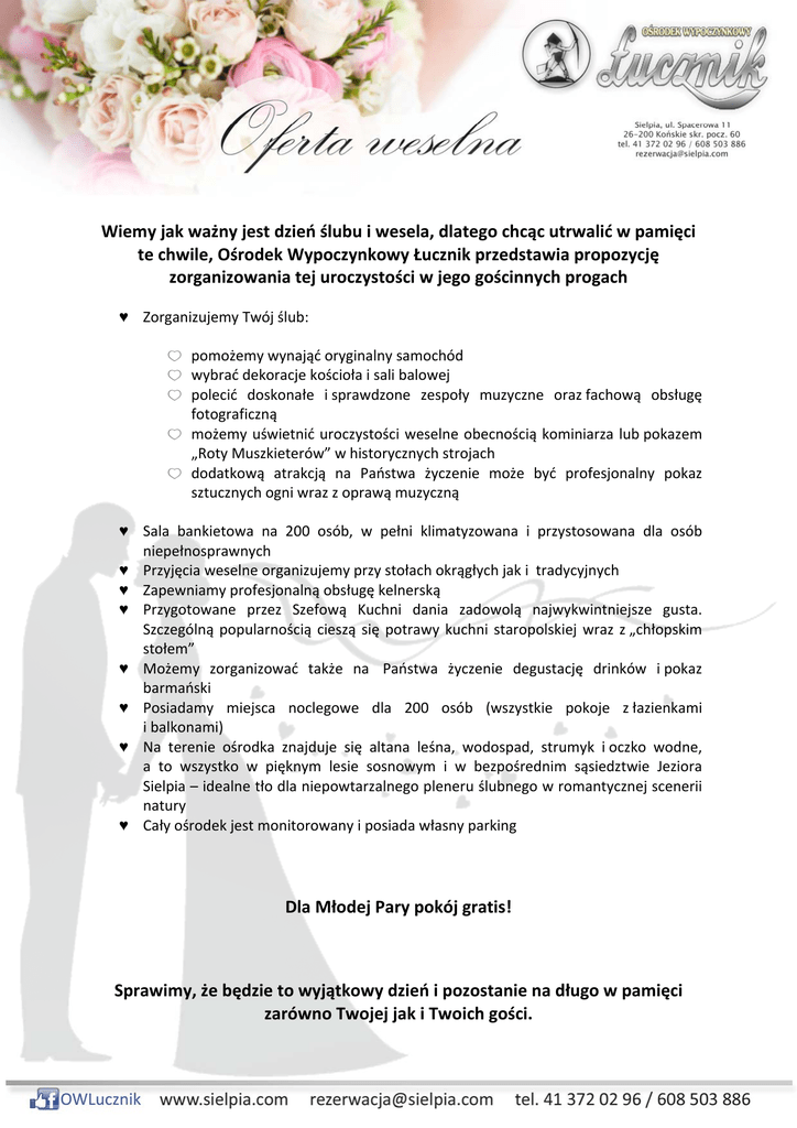 Wiemy jak ważny jest dzień ślubu i wesela, dlatego chcąc utrwalić w pamięci te chwile, Ośrodek Wypoczynkowy Łucznik przedstawia propozycję zorganizowania tej uroczystości w jego gościnnych progach ♥ Zorganizujemy Twój ślub: pomożemy wynająć oryginalny samochód wybrać dekoracje kościoła i sali balowej polecić doskonałe i sprawdzone zespoły muzyczne oraz fachową obsługę fotograficzną możemy uświetnić uroczystości weselne obecnością kominiarza lub pokazem „Roty Muszkieterów” w historycznych strojach dodatkową atrakcją na Państwa życzenie może być profesjonalny pokaz sztucznych ogni wraz z oprawą muzyczną ♥ Sala bankietowa na 200 osób, w pełni klimatyzowana i przystosowana dla osób niepełnosprawnych ♥ Przyjęcia weselne organizujemy przy stołach okrągłych jak i tradycyjnych ♥ Zapewniamy profesjonalną obsługę kelnerską ♥ Przygotowane przez Szefową Kuchni dania zadowolą najwykwintniejsze gusta. Szczególną popularnością cieszą się potrawy kuchni staropolskiej wraz z „chłopskim stołem” ♥ Możemy zorganizować także na Państwa życzenie degustację drinków i pokaz barmański ♥ Posiadamy miejsca noclegowe dla 200 osób (wszystkie pokoje z łazienkami i balkonami) ♥ Na terenie ośrodka znajduje się altana leśna, wodospad, strumyk i oczko wodne, a to wszystko w pięknym lesie sosnowym i w bezpośrednim sąsiedztwie Jeziora Sielpia – idealne tło dla niepowtarzalnego pleneru ślubnego w romantycznej scenerii natury ♥ Cały ośrodek jest monitorowany i posiada własny parking Dla Młodej Pary pokój gratis! Sprawimy, że będzie to wyjątkowy dzień i pozostanie na długo w pamięci zarówno Twojej jak i Twoich gości.