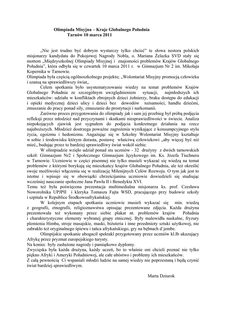 Olimpiada Misyjna – Kraje Globalnego Południa Tarnów 10 marca 2011 „Nie jest trudno być dobrym wystarczy tylko chcieć” te słowa nestora polskich misjonarzy kandydata do Pokojowej Nagrody Nobla, o. Mariana Żelazka SVD stały się mottem „Międzyszkolnej Olimpiady Misyjnej i znajomości problemów Krajów Globalnego Południa”, która odbyła się w czwartek 10 marca 2011 r. w Gimnazjum Nr 2 im. Mikołaja Kopernika w Tarnowie. Olimpiada była częścią ogólnoszkolnego projektu; „Wolontariat Misyjny promocją człowieka i szansą na sprawiedliwszy świat„ Celem spotkania było usystematyzowanie wiedzy na temat problemów Krajów Globalnego Południa ze szczególnym uwzględnieniem sytuacji, najmłodszych ich mieszkańców: udziału w konfliktach zbrojnych dzieci żołnierzy, braku dostępu do edukacji i opieki medycznej dzieci ulicy i dzieci bez dowodów tożsamości, handlu dziećmi, zmuszanie do pracy ponad siły, zmuszanie do prostytucji i narkomanii. Zarówno proces przygotowania do olimpiady jak i sam jej przebieg był próbą podjęcia refleksji przez młodzież nad przyczynami i skutkami niesprawiedliwości w świecie. Analiza niepokojących zjawisk jest sygnałem do podjęcia konkretnego działania na rzecz najuboższych. Młodzież dostrzega poważne zagrożenia wynikające z konsumpcyjnego stylu życia, egoizmu i hedonizmu. Angażując się w Szkolny Wolontariat Misyjny kształtuje w sobie i środowisku którym dorasta, postawę właściwą człowiekowi „aby więcej być niż mieć„ budując przez to bardziej sprawiedliwy świat wokół siebie. W olimpiadzie wzięło udział ponad stu uczniów - 32 drużyny z dwóch tarnowskich szkół: Gimnazjum Nr2 i Społecznego Gimnazjum Językowego im. Ks. Józefa Tischnera w Tarnowie. Uczniowie w części pisemnej nie tylko musieli wykazać się wiedzą na temat problemów z którymi borykają się mieszkańcy krajów Globalnego Południa, ale też określić swoje możliwości włączenia się w realizację Milenijnych Celów Rozwoju. O tym jak jest to istotne i wpisuje się w obowiązki chrześcijanina uczniowie dowiedzieli się studiując wcześniej nauczanie społeczne Jana Pawła II i Benedykta XVI. Temu też była poświęcona prezentacja multimedialna misjonarza ks. prof. Czesława Noworolnika UPJPII i kleryka Tomasza Fajta WSD, pracującego przy budowie szkoły i szpitala w Republice Środkowoafrykańskiej. W kolejnym etapach spotkania uczniowie musieli wykazać się min. wiedzą z geografii, etnografii, religioznawstwa opisując prezentowane zdjęcia. Każda drużyna prezentowała też wykonany przez siebie plakat nt. problemów krajów Południa i charakterystyczne elementy wybranej grupy etnicznej. Były malowidła naskalne, fryzury plemienia Himba, stroje masajskie, maski, biżuteria i inne przedmioty sztuki użytkowej, nie zabrakło też oryginalnego śpiewu i tańca afrykańskiego, gry na bębnach d`jembe. Olimpijskie spotkanie ubogacił spektakl przygotowany przez uczniów kl.Ib ukazujący Afrykę przez pryzmat europejskiego turysty. Na koniec były zasłużone nagrody i pamiątkowe dyplomy. Zwycięska była każda drużyna, każdy uczeń, bo to właśnie oni chcieli poznać nie tylko piękno Afryki i Ameryki Południowej, ale całe ubóstwo i problemy ich mieszkańców. Z całą pewnością Ci wspaniali młodzi ludzie na samej wiedzy nie poprzestaną i będą czynić świat bardziej sprawiedliwym. Marta Dziurok