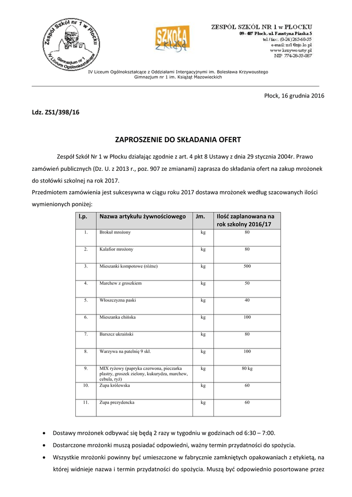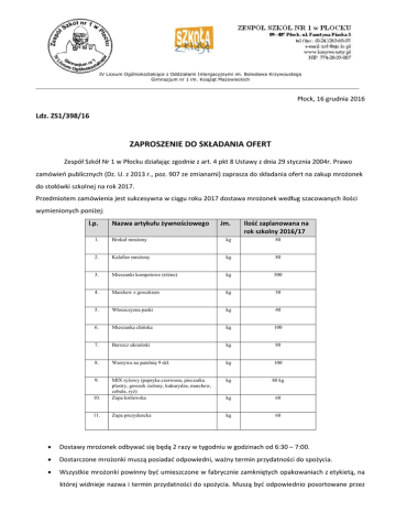 IV Liceum Ogólnokształcące z Oddziałami Intergacyjnymi im. Bolesława Krzywoustego Gimnazjum nr 1 im. Książąt Mazowieckich Płock, 16 grudnia 2016 Ldz. ZS1/398/16 ZAPROSZENIE DO SKŁADANIA OFERT Zespół Szkół Nr 1 w Płocku działając zgodnie z art. 4 pkt 8 Ustawy z dnia 29 stycznia 2004r. Prawo zamówień publicznych (Dz. U. z 2013 r., poz. 907 ze zmianami) zaprasza do składania ofert na zakup mrożonek do stołówki szkolnej na rok 2017. Przedmiotem zamówienia jest sukcesywna w ciągu roku 2017 dostawa mrożonek według szacowanych ilości wymienionych poniżej: l.p. Nazwa artykułu żywnościowego Jm. Ilość zaplanowana na rok szkolny 2016/17 1. Brokuł mrożony kg 80 2. Kalafior mrożony kg 80 3. Mieszanki kompotowe (różne) kg 500 4. Marchew z groszkiem kg 50 5. Włoszczyzna paski kg 40 6. Mieszanka chińska kg 100 7. Barszcz ukraiński kg 80 8. Warzywa na patelnię 9 skł. kg 100 9. kg 80 kg 10. MIX ryżowy (papryka czerwona, pieczarka plastry, groszek zielony, kukurydza, marchew, cebula, ryż) Zupa królewska kg 60 11. Zupa prezydencka kg 60 • Dostawy mrożonek odbywać się będą 2 razy w tygodniu w godzinach od 6:30 – 7:00. • Dostarczone mrożonki muszą posiadać odpowiedni, ważny termin przydatności do spożycia. • Wszystkie mrożonki powinny być umieszczone w fabrycznie zamkniętych opakowaniach z etykietą, na której widnieje nazwa i termin przydatności do spożycia. Muszą być odpowiednio posortowane przez Wykonawcę i muszą być najwyższej jakości, spełniać wymogi sanitarno‐epidemiologiczne oraz zasady systemu HACCP, w tym przede wszystkim muszą odpowiadać wymaganiom jakościowym stosownie do obowiązujących przepisów. • Muszą być odpowiednio posortowane przez Wykonawcę i muszą być najwyższej jakości, spełniać wymogi sanitarno‐epidemiologiczne oraz zasady systemu HACCP w tym przede wszystkim muszą odpowiadać wymaganiom jakościowym stosownie do obowiązujących przepisów. • Dostarczane mrożonki powinny spełniać właściwe standardy jakościowe przyjęte na rynku art. mrożonych, a Dostawca powinien zagwarantować, iż dostarczane produkty spełniają normy związane z warunkami sanitarnymi ich pozyskiwania, produkcji, przetwarzania, składowania, transportu oraz sprzedaży bezpośredniej. Wykonawcy ubiegający się o udzielenie zamówienia muszą posiadać uprawnienia do wykonania określonej działalności lub czynności. Dokumenty wymagane od Wykonawców: ‐ Aktualny odpis z właściwego rejestru lub z centralnej ewidencji i informacji o działalności gospodarczej. ‐ Oświadczenie Wykonawcy o: wpisie do rejestru zakładów podlegających kontroli Państwowej Inspekcji Sanitarnej, wprowadzeniu systemu HACCP, posiadaniu zgody właściwego organu inspekcji sanitarnej na przewóz (transport) mrożonek – zał. nr 2. ‐ Pełnomocnictwo, jeżeli oferta będzie podpisana przez pełnomocnika. ‐ Wypełniony formularz oferty (zał. nr 1) oraz podpisany wzór umowy (zał. nr 3). Oferty należy składać osobiście w sekretariacie szkoły na formularzu stanowiącym załącznik nr 1 do niniejszego zaproszenia do składania ofert w zamkniętej kopercie z dopiskiem „oferta na dostawę mrożonek” oraz nazwą firmy do dnia 27 grudnia 2016r. do godz. 10:00. Formularz powinien zostać podpisany przez osobę upoważnioną. Oferent, który zostanie wybrany będzie zobowiązany do podpisania umowy stanowiącej załącznik nr 3 do niniejszego zaproszenia do składania ofert. Cena oferty musi uwzględnić dostawę mrożonek do siedziby Zamawiającego. O zamówienie mogą ubiegać się dostawcy z terenu do 20 km od granicy miasta Płocka. Przy dokonywaniu wyboru najkorzystniejszej oferty Zamawiający stosować będzie kryterium najniższej ceny.