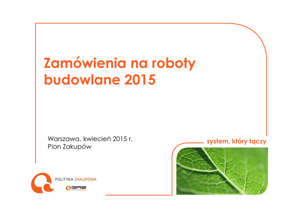 Zamówienia na roboty budowlane 2015 Warszawa, kwiecień 2015 r. Pion Zakupów system, który łączy Agenda 1 1.Kluczowe obszary i wartości zamówień 2.Inwestycje budowlane wg typów obiektów 3.Inwestycje budowlane wg regionów 4.Gazociągi strategiczne i zamówienia pow. 5 mln PLN system, który łączy 2 KLUCZOWE OBSZARY INWESTYCJI BUDOWLANYCH W 2015 ROKU 1.Rozwój 2.Budowa sieci gazociągów nowych oraz remont istniejących węzłów, tłoczni, AKPiA, osuszalni i stacji gazowych 3.Remonty i modernizacje 4.Systemy 5.Inwestycje budynków i ogrodzeń antykorozyjne w nowe przyłącza energetyczne oraz systemy telemetrii i łączności system, który łączy 3 Inwestycje w regionach -> CENTRALA W tym zamówienia: 1. Roboty budowlane Gazociąg DN1000 Lwówek-Odolanów 2. ROB. BUD.GAZOCIĄG odcinek DN 400 Wolbórz-Piotrków Trybunalski 6 ZAMÓWIEŃ NA ŁĄCZNĄ KWOTĘ OK. 521 MLN system, który łączy 4 Inwestycje w regionach -> GDAŃSK W tym zamówienia: 1. Przyłączenie do sieci przesyłowej Elektrowni CCGT Grudziądz 2. Modernizacja budynku warsztatowego GPT ul. Podstoczna 15 34 ZAMÓWIENIA NA ŁĄCZNĄ KWOTĘ OK. 44 MLN system, który łączy Inwestycje w regionach -> REMBELSZCZYZNA 5 46 ZAMÓWIEŃ NA ŁĄCZNĄ KWOTĘ OK. 225 MLN W tym zamówienia: 1. 2. Budowa stacji Meszcze I Przebudowa stacji gazowej w m. Bobrowniki wraz z budową instalacji sprężającej system, który łączy 6 Inwestycje w regionach -> POZNAŃ 52 ZAMÓWIENIA NA ŁĄCZNĄ KWOTĘ OK. 65 MLN W tym zamówienia: 1. Tłocznia Gazu Odolanów – etap 0 (przeniesienie sprężarek) 2. Przebudowa Gazociągu DN500 Odolanów- Tworóg : - włącznie z odgałęzieniem odb.Baranów - włącznie z odgałęzieniem m.Czarny Las system, który łączy Inwestycje w regionach -> ŚWIERKLANY 7 35 ZAMÓWIEŃ NA ŁĄCZNĄ KWOTĘ OK. 569 MLN W tym zamówienia: Budowa gazociągu Zdzieszowice-Wrocław odc. Zdzieszowice-Brzeg 2. Budowa gazociągu DN1000 Tworóg- Kędzierzyn Koźle 3. Budowa gazociągu DN1000 Zdzieszowice-Kędzierzyn Kożle 1. system, który łączy 8 Inwestycje w regionach -> TARNÓW W tym zamówienia: Przebudowa przekroczeń cieków wodnych wraz z przebudową ZZU w okolicach tych przekroczeń na gazociągu DN700 RozwadówKońskowola 2. Etap II - dostosowanie gazociągu DN700 Granica PaństwaJarosław do badań przy pomocy tłoka inteligentnego 1. 159 ZAMÓWIEŃ NA ŁĄCZNĄ KWOTĘ OK. 92 MLN system, który łączy Inwestycje w regionach -> WROCŁAW 9 61 ZAMÓWIEŃ NA ŁĄCZNĄ KWOTĘ OK. 509 MLN W tym zamówienia: 1. Gazociąg CzeszówWierzchowice 2. Gazociąg CzeszówKiełczów system, który łączy Szczególnie ważne Największe zamówienia 2015 -G a z o c i ą g i s t r a t e g i c z n e -Roboty budowlane pow. 5 mln zł system, który łączy Zamówienia 2015 w kategorii Roboty Budowlane na gazociągach strategicznych: 1.Lwówek – Odolanów DN 1000 =>167km 2.Czeszów – Wierzchowice DN 1000 => 14km 3.Czeszów – Kiełczów DN 1000 => 33 km 4.Hermanowice – Strachocina DN 700 => 72 km 5.Zdzieszowice – Kędzierzyn DN 1000 => 19 km 6.Tworóg – Kędzierzyn DN 1000 => 47 km system, który łączy Zamówienia 2015 powyżej 5 MLN PLN system, który łączy CENTRALA – DZIAŁY INWESTYCJI STRATEGICZNYCH Roboty budowlano-montażowe związane z budową gaz. DN1000 Lwówek-Odolanów, Budowa gazociągu DN700 Hermanowice-Strachocina. GDAŃSK Przyłączenie do sieci przesyłowej Elektrowni CCGT Grudziądz - roboty budowlane na podstawie opracowanej dokumentacji, Modernizacja budynku warsztatowego GPT ul. Podstoczna 15 - roboty budowlane, Przyłączenie EDF Toruń - roboty budowlane. POZNAŃ Wykonanie robót budowlanych - Tłocznia Gazu Odolanów – etap 0 (przeniesienie sprężarek), Wykonanie robót budowlanych - remont gaz DN500 OdolanówKomorzno I (Szopienice); remont DN500 Odolanów- Komorzno II (Tworóg) wraz z modernizacja placów i ogrodzeń. system, który łączy REMBELSZCZYZNA Roboty budowlane na gazociągu - gazociąg dn400 Mory - Piotrków Trybunalski na odcinku Wolbórz - Piotrków Trybunalski roboty budowlane na stacji - budowa stacji pomiarowej Meszcze, Roboty budowlane na stacji - przebudowa stacji gazowej w m. Bobrowniki wraz z budową instalacji sprężającej Zaprojektowanie i wykonanie robót budowlanych -przyłączenie do sieci przesyłowej sieci dystrybucyjnej zasilającej odbiorców na obszarze m.st. Warszawa, gm. Ożarów Mazowiecki, gm. Stare Babice, gm. Izabelin, Zaprojektowanie i wykonanie robót budowlanych na stacji Przyłączenie PGNIG TERMIKA – Żerań, Zaprojektowanie i wykonanie robót budowlanych na stacjach przebudowa stacji gazowej w m. Uniszki Zawadzkie. system, który łączy ŚWIERKLANY Budowa gazociągu Zdzieszowice - Wrocław odc. Zdzieszowice Brzeg- wykonanie robót budowlanych, Budowa gazociągu Tworóg- Kędzierzyn-Koźle- wykonanie robót budowlanych, Budowa gazociągu Zdzieszowice - Kędzierzyn-Koźle - wykonanie robót budowlanych. TARNÓW Przebudowa przekroczeń cieków wodnych wraz z przebudową ZZU na gazociągu DN700 Rozwadów-Końskowola - roboty budowlane. WROCŁAW Gazociąg Zdzieszowice- Wrocław -Wykonanie robót, Gazociąg Czeszów- Kiełczów - wykonanie robót, Gazociąg Czeszów- Wrocław- wykonanie robót, Zasilanie Kotliny Kłodzkiej - roboty. system, który łączy Kontrakty zaplanowane na roboty budowlane w 2015 r. 393 postępowania o łącznej wartości 1 896 830 357 PLN system, który łączy ZAPRASZAMY DO WSPÓŁPRACY system, który łączy