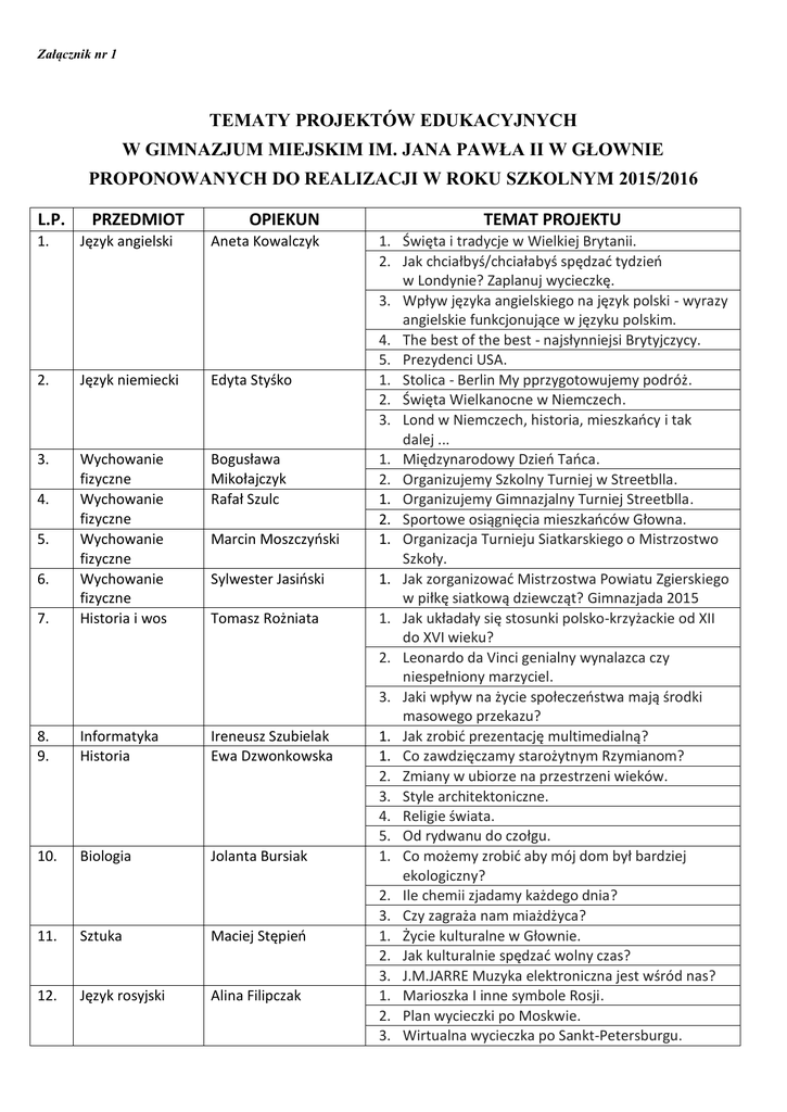 tematy projektów edukacyjnych - Gimnazjum Miejskie im. Jana