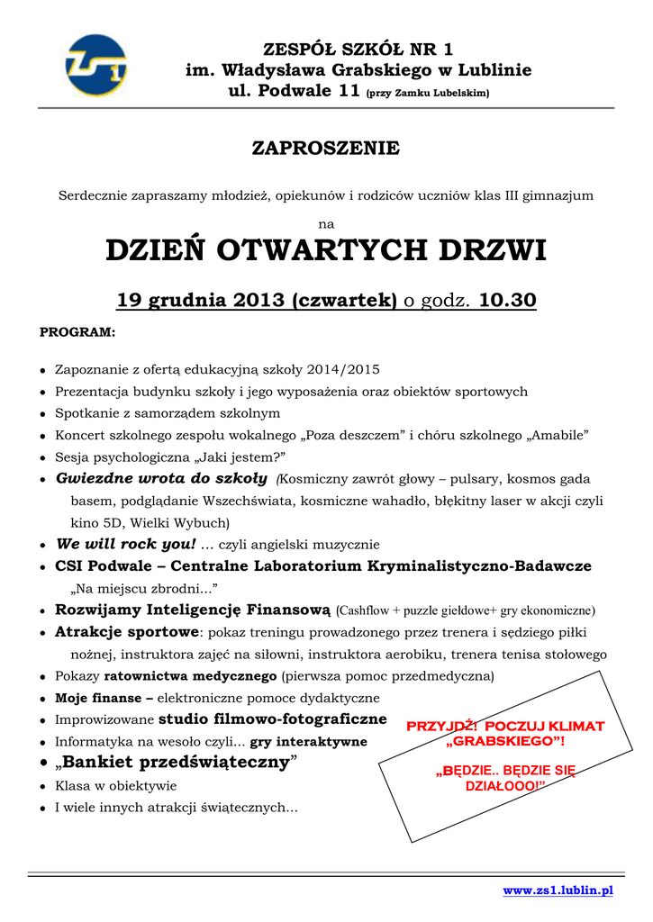ZESPÓŁ SZKÓŁ NR 1 im. Władysława Grabskiego w Lublinie ul. Podwale 11 (przy Zamku Lubelskim) ZAPROSZENIE Serdecznie zapraszamy młodzież, opiekunów i rodziców uczniów klas III gimnazjum na DZIEŃ OTWARTYCH DRZWI 19 grudnia 2013 (czwartek) o godz. 10.30 PROGRAM: Zapoznanie z ofertą edukacyjną szkoły 2014/2015 Prezentacja budynku szkoły i jego wyposażenia oraz obiektów sportowych Spotkanie z samorządem szkolnym Koncert szkolnego zespołu wokalnego „Poza deszczem” i chóru szkolnego „Amabile” Sesja psychologiczna „Jaki jestem?” Gwiezdne wrota do szkoły (Kosmiczny zawrót głowy – pulsary, kosmos gada basem, podglądanie Wszechświata, kosmiczne wahadło, błękitny laser w akcji czyli kino 5D, Wielki Wybuch) We will rock you! ... czyli angielski muzycznie CSI Podwale – Centralne Laboratorium Kryminalistyczno-Badawcze „Na miejscu zbrodni...” Rozwijamy Inteligencję Finansową (Cashflow + puzzle giełdowe+ gry ekonomiczne) Atrakcje sportowe: pokaz treningu prowadzonego przez trenera i sędziego piłki nożnej, instruktora zajęć na siłowni, instruktora aerobiku, trenera tenisa stołowego Pokazy ratownictwa medycznego (pierwsza pomoc przedmedyczna) Moje finanse – elektroniczne pomoce dydaktyczne Improwizowane studio filmowo-fotograficzne Informatyka na wesoło czyli... gry interaktywne „Bankiet przedświąteczny” Klasa w obiektywie PRZYJDŹ! POCZUJ KLIMAT „GRABSKIEGO”! „BĘDZIE.. BĘDZIE SIĘ DZIAŁOOO!” I wiele innych atrakcji świątecznych... www.zs1.lublin.pl