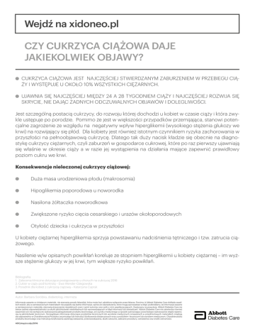 Wejdź na xidoneo.pl CZY CUKRZYCA CIĄŻOWA DAJE JAKIEKOLWIEK OBJAWY? CUKRZYCA CIĄŻOWA JEST NAJCZĘŚCIEJ STWIERDZANYM ZABURZENIEM W PRZEBIEGU CIĄŻY I WYSTĘPUJE U OKOŁO 10% WSZYSTKICH CIĘŻARNYCH. UJAWNIA SIĘ NAJCZĘŚCIEJ MIĘDZY 24 A 28 TYGODNIEM CIĄŻY I NAJCZĘŚCIEJ ROZWIJA SIĘ SKRYCIE, NIE DAJĄC ŻADNYCH ODCZUWALNYCH OBJAWÓW I DOLEGLIWOŚCI. Jest szczególną postacią cukrzycy, do rozwoju której dochodzi u kobiet w czasie ciąży i która zwykle ustępuje po porodzie. Pomimo że jest w większości przypadków przemijająca, stanowi potencjalne zagrożenie ze względu na negatywny wpływ hiperglikemii (wysokiego stężenia glukozy we krwi) na rozwijający się płód. Dla kobiety jest również istotnym czynnikiem ryzyka zachorowania w przyszłości na pełnoobjawową cukrzycę. Dlatego tak duży nacisk kładzie się obecnie na diagnostykę cukrzycy ciężarnych, czyli zaburzeń w gospodarce cukrowej, które po raz pierwszy ujawniają się właśnie w okresie ciąży a w razie jej wystąpienia na działania mające zapewnić prawidłowy poziom cukru we krwi. Konsekwencje nieleczonej cukrzycy ciążowej: Duża masa urodzeniowa płodu (makrosomia) Hipoglikemia poporodowa u noworodka Nasilona żółtaczka noworodkowa Zwiększone ryzyko cięcia cesarskiego i urazów okołoporodowych Otyłość dziecka i cukrzyca w przyszłości U kobiety ciężarnej hiperglikemia sprzyja powstawaniu nadciśnienia tętniczego i tzw. zatrucia ciążowego. Nasilenie w/w opisanych powikłań koreluje ze stopniem hiperglikemii u kobiety ciężarnej – im wyższe stężenie glukozy w jej krwi, tym większe ryzyko powikłań. Bibliografia: 1. Zalecenia kliniczne dotyczące postępowania u chorych na cukrzycę 2016 2. Cukier w ciąży pod kontrolą – Ewa Wender-Ożegowska 3. Poradnik dla kobiet z cukrzycą ciążową – Katarzyna Cypryk Autor: Barbara Soróbka, diabetolog, internista Informacje zawarte w niniejszym materiale nie stanowią porady lekarskiej, która może być udzielona wyłącznie przez lekarza. Pomimo iż Abbott Diabetes Care dokłada wszelkich starań, aby w zamieszczonych materiałach nie pojawiły się żadne informacje, opinie ani oświadczenia, które mogą wprowadzać w błąd, podkreślamy, że informacje zawarte w zamieszczonym materiale, stanowią streszczenie niezależnych ocen i opinii autorów oraz osób z nimi współpracujących. Zważywszy na powyższe, Abbott Diabetes Care nie bierze żadnej odpowiedzialności za skutki jakichkolwiek niedokładnych lub wprowadzających w błąd informacji lub oświadczeń. Abbott Diabetes Care nie zatwierdza również zawartości ani nie zachęca do zastosowania jakiegokolwiek produktu leczniczego, ani wyrobu medycznego w sposób wykraczający poza bieżące zastosowanie objęte rejestracją na jakimkolwiek terytorium. Szczegółowe informacje dotyczące produktów leczniczych lub wyrobów medycznych omawianych w przedmiotowych materiałach znajdują się odpowiednio w Charakterystyce Produktu Leczniczego lub Instrukcji Użytkowania dostarczonych wraz z produktem leczniczym lub wyrobem medycznym. Charakterystyka produktu leczniczego oraz Instrukcja Użytkowania zawierają wskazania, przeciwwskazania, skutki uboczne, zalecane procedury, ostrzeżenia oraz środki ostrożności. ADC/step/cccdjo/2016
