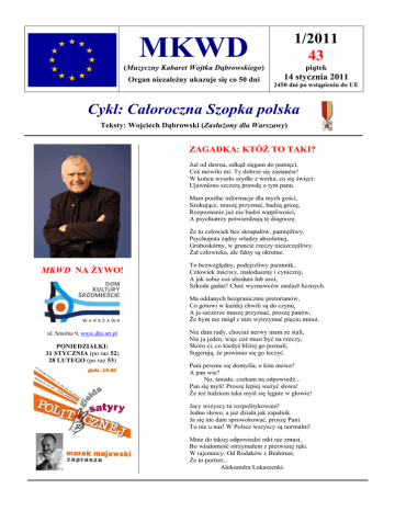 MKWD 1/2011 43 (Muzyczny Kabaret Wojtka Dąbrowskiego) piątek Organ niezależny ukazuje się co 50 dni 14 stycznia 2011 2450 dni po wstąpieniu do UE Cykl: Całoroczna Szopka polska Teksty: Wojciech Dąbrowski (Zasłużony dla Warszawy) ZAGADKA: KTÓŻ TO TAKI? Już od dawna, odkąd sięgam do pamięci, Coś mówiło mi: Ty dobrze się zastanów! W końcu wyszło szydło z worka, co się święci: Ujawniono szczerą prawdę o tym panu. Mam poufne informacje dla mych gości, Szokujące, muszę przyznać, budzą grozę, Rozpoznanie już nie budzi wątpliwości, A psychiatrzy potwierdzają tę diagnozę. Że to człowiek bez skrupułów, pamiętliwy, Psychopata żądny władzy absolutnej, Gruboskórny, w gruncie rzeczy nieszczęśliwy. Żal człowieka, ale fakty są okrutne. MKWD NA ŻYWO! To bezwzględny, podejrzliwy paranoik, Człowiek mściwy, małoduszny i cyniczny, A jak sobie coś ubzdura lub uroi, Szkoda gadać! Choć wyznawców znalazł licznych. Ma oddanych bezgranicznie pretorianów, Co gotowi w każdej chwili są do czynu, A ja szczerze muszę przyznać, proszę panów, Że bym nie mógł z nim wytrzymać pięciu minut. ul. Smolna 9, www.dks.art.pl PONIEDZIAŁKI: 31 STYCZNIA (po raz 52) 28 LUTEGO (po raz 53) Nie dam rady, chociaż nerwy mam ze stali, Nie ja jeden, więc coś musi być na rzeczy, Skoro ci, co kiedyś bliżej go poznali, Sugerują, że powinno się go leczyć. Pani pewnie się domyśla, o kim mowa? A pan wie? No, śmiało, czekam na odpowiedź... Pan się myli! Proszę lepiej ważyć słowa! Że też ludziom taka myśl się lęgnie w głowie! Jacy wszyscy tu rozpolitykowani! Jedno słowo, a już działa jak zapalnik. Ja się nie dam sprowokować, proszę Pani. To nie u nas! W Polsce wszyscy są normalni! Mnie do takiej odpowiedzi nikt nie zmusi, Bo wiadomość otrzymałem z pierwszej ręki. W tajemnicy. Od Rodaków z Białorusi, Że to portret... Aleksandra Łukaszenki. str. 2 MKWD, nr 1 (43) /2011, Warszawa, piątek, 14 stycznia 2011 roku (2450 dni po wstąpieniu do UE) nr 39 (120), 17 grudnia 2010 roku nr 38 (119), 3 grudnia 2010 roku LIST OD PRZYJACIÓŁ z okazji 100. odcinka z cyklu Listy do przyjaciela autorstwa Miry Kużel. Droga Miro! Tak się składa, Że euforia się udziela, Bo ukazał się w Sąsiadach Setny List do przyjaciela. Z tej okazji przyjmij róże, A my, czując wielką tremę, Ogłaszamy: Mira Kużel To po prostu ewenement! Kto dziś umie pisać listy (Poza mailem, esemesem)? Fakt to dla nas oczywisty: List co tydzień jest sukcesem. Dziękujemy! I na łamach Powtarzamy: Nasza Mira Zasłużyła sobie sama Na uznanie i dytyramb! Sąsiada spod trójki przestałem od pewnego czasu widywać. Zaniepokoiłem się trochę, bo przedtem spotykałem go co najmniej raz w tygodniu. A ostatnio przepadł, po prostu kamień w wodę. Dopiero dobrze poinformowane sąsiadki wyjawiły mi tajemnicę, którą cały blok pasjonował się od dawna. – To pan nic nie wie? – nie kryły swojego zdziwienia. – Sąsiad spod trójki został przez żonę wyrzucony za drzwi – wyszeptała konfidencjonalnie jedna z nich. – Nie wyrzucony, tylko wykluczony – sprostowała druga. – Podobno żona już od sierpnia podejrzewała, że mąż spotyka się potajemnie z sąsiadką z naprzeciwka. Paula miała na imię. S-PiS-kował za jej plecami, zaczął wszędzie rozgłaszać, że Paula jest najważniejsza. Mówią nawet, że sam sprowokował to wykluczenie, bo miał dosyć autorytatywnych rządów swojej żony. Trzeba przyznać, że baba trzyma całą rodzinę twardą ręką i nie znosi sprzeciwu. Przez jakiś czas złagodniała, grała aniołka, udawała kogoś innego, ale szybko wylazło szydło z worka i powróciła do wojennej retoryki. Nic dziwnego, że facet miał tego dość. Skorzystał z przykładu kolegi, który też dobrowolnie uwolnił się od swej PO-łowicy i skupił wokół siebie spory ruch poparcia, zakładając własne stowarzyszenie. Sąsiadka jest zadowolona, bo za jednym zamachem zyskała piętnastu nowych członków. Żona takiej zniewagi nie mogła, rzecz jasna, znieść. Najchętniej ukarałaby męża i utarła mu nosa, odcinając się od niego definitywnie. Pojawił się jednak problem dalszego finansowania działalności. Postulat całkowitej rezygnacji z dofinansowania lub choćby czasowego ograniczenia dotacji z budżetu męża okazał się nie do przyjęcia. Więc w gruncie rzeczy wszystko pozostało po staremu. W dodatku sąsiad spod trójki doświadczył na własnej skórze, że Paula to taka żona-bis, właściwie nie różni się niczym, może tylko jest mniej agresywna. Ostatecznie sąsiad powrócił na łono rodziny, godząc się ugodowo na hasło: Żona jest najważniejsza. Wieczorem żona sąsiada spod trójki poinformowała męża, że mamusia właśnie zdecydowała się przyjechać na święta. Sąsiad ma nowy kłopot, ale na wszelki wypadek postanowił wywiesić w przedpokoju nieco zmodyfikone hasło: Teściowa jest najważniejsza. Treść ta sama, ale ktoś może znowu się nabierze. KSIĄŻKI NA NOWY ROK NA PŁYTACH CD czyta Wojciech Dąbrowski, wydawca: Qes Agency Na twe listy każdy czeka, Bo potrzeba tak niewiele, Żeby człowiek dla człowieka Był serdecznym przyjacielem. Umiesz jednać, czasem wzruszyć, Wszyscy mówią: Dzięki Mirze Aż się robi lżej na duszy, Jakoś nam do siebie bliżej. Ileż w twoich listach sznytu, Ile ciepła dać potrafisz! Nadajemy ci więc tytuł: Mistrza epistolografii. Urzeczeni setnym listem, Przyjaciele toast wznoszą: Pijąc zdrowie setką czystej, O następną setkę proszą! Roland Topor Karol May Cztery róże dla Lucienne Skarb w srebrnym jeziorze 42 opowiadania mistrza czarnego humoru powieść przygodowa z Dzikiego Zachodu © MKWD (Muzyczny Kabaret Wojtka Dąbrowskiego) Warszawa, tel / fax (22) 641 64 40, 0-600 630 952 www.spotkaniazpiosenka.org, www.tygodnik-sasiedzi.pl Następny numer ukaże się 5 marca 2011 roku (2500 dni po wstąpieniu do UE)