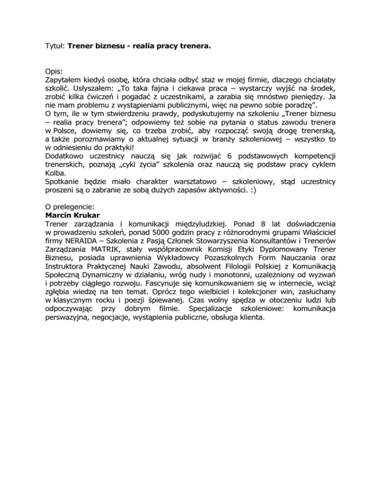 Tytuł: Trener biznesu - realia pracy trenera. Opis: Zapytałem kiedyś osobę, która chciała odbyć staż w mojej firmie, dlaczego chciałaby szkolić. Usłyszałem: „To taka fajna i ciekawa praca – wystarczy wyjść na środek, zrobić kilka ćwiczeń i pogadać z uczestnikami, a zarabia się mnóstwo pieniędzy. Ja nie mam problemu z wystąpieniami publicznymi, więc na pewno sobie poradzę”. O tym, ile w tym stwierdzeniu prawdy, podyskutujemy na szkoleniu „Trener biznesu – realia pracy trenera”; odpowiemy też sobie na pytania o status zawodu trenera w Polsce, dowiemy się, co trzeba zrobić, aby rozpocząć swoją drogę trenerską, a także porozmawiamy o aktualnej sytuacji w branży szkoleniowej – wszystko to w odniesieniu do praktyki! Dodatkowo uczestnicy nauczą się jak rozwijać 6 podstawowych kompetencji trenerskich, poznają „cykl życia” szkolenia oraz nauczą się podstaw pracy cyklem Kolba. Spotkanie będzie miało charakter warsztatowo – szkoleniowy, stąd uczestnicy proszeni są o zabranie ze sobą dużych zapasów aktywności. :) O prelegencie: Marcin Krukar Trener zarządzania i komunikacji międzyludzkiej. Ponad 8 lat doświadczenia w prowadzeniu szkoleń, ponad 5000 godzin pracy z różnorodnymi grupami Właściciel firmy NERAIDA – Szkolenia z Pasją Członek Stowarzyszenia Konsultantów i Trenerów Zarządzania MATRIK, stały współpracownik Komisji Etyki Dyplomowany Trener Biznesu, posiada uprawnienia Wykładowcy Pozaszkolnych Form Nauczania oraz Instruktora Praktycznej Nauki Zawodu, absolwent Filologii Polskiej z Komunikacją Społeczną Dynamiczny w działaniu, wróg nudy i monotonni, uzależniony od wyzwań i potrzeby ciągłego rozwoju. Fascynuje się komunikowaniem się w internecie, wciąż zgłębia wiedzę na ten temat. Oprócz tego wielbiciel i kolekcjoner win, zasłuchany w klasycznym rocku i poezji śpiewanej. Czas wolny spędza w otoczeniu ludzi lub odpoczywając przy dobrym filmie. Specjalizacje szkoleniowe: komunikacja perswazyjna, negocjacje, wystąpienia publiczne, obsługa klienta.