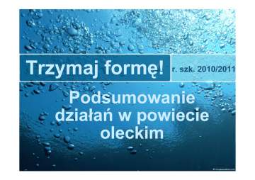 Trzymaj formę! r. szk. 2010/2011 Podsumowanie działań w powiecie oleckim W roku szkolnym 2010/2011 w powiecie oleckim w programie wzięło udział 5 szkół gimnazjalnych: Zespół Szkół w Olecku Gimnazjum w Świętajnie Zespół Szkół w Babkach Oleckich Publiczne Gimnazjum im. Jana Pawła II w Wieliczkach Gimnazjum Nr 2 im. Mikołaja Kopernika w Olecku * wszystkie dane występujące w podsumowaniu pochodzą ze sprawozdania zbiorczego z realizacji programu w r. szk. 2010/2011 w powiecie oleckim Koordynatorami programu w szkołach byli: nauczyciel wychowania fizycznego – 2 os. pedagog – 1 os. nauczyciel chemii – 1 os. nauczyciel matematyki – 1 os. Program w szkołach realizowano podczas: zajęć obowiązkowych (w czasie trwania zajęć lekcyjnych) - 1 zajęć pozalekcyjnych - 1 podczas zajęć obowiązkowych i pozalekcyjnych - 3 Średnia liczba godzin lekcyjnych przeznaczonych na realizację programu w jednej klasie do 3 – 3 szkoły 3 – 5 – 1 szkoła 10 – 20 – 1 szkoła Własne projekty edukacyjne zawierające temat, cele, zadania, osoby odpowiedzialne, terminy realizacji, sposób i kryteria oceny efektów opracowało Publiczne Gimnazjum im. Jana Pawła II w Wieliczkach. „10 kroków zdrowego żywienia”; cel: podniesienie poziomu wiedzy uczniów nt. prawidłowego odżywiania się „Bulimia”; cel: podniesienie poziomu wiedzy uczniów nt. skutków niekontrolowanego odchudzania się „Spędzanie wolnego czasu”; cel: zachęcenie uczniów do aktywnego spędzania czasu wolnego „Oznakowania produktów”; cel: Dostarczenie uczniom wiedzy i umiejętności korzystania z informacji zamieszczonych na opakowaniach produktów spożywczych. W ramach programu odbywały się następujące formy zajęć: 1. Przyrządzanie potraw: sałatek, surówek, kanapek itp. - 1 2. Układanie jadłospisów zgodnie z zasadami zbilansowanej diety - 2 3. Obliczanie BMI - 5 4. Ocena własnej aktywności fizycznej i stylu życia - 4 5. Pomiar tętna lub ciśnienia - 5 6. Zapoznanie z zaburzeniami stanu odżywiania oraz chorobami z tym związanymi (anoreksja, bulimia, otyłość) - 5 7. Ćwiczenia gimnastyczne dodatkowe – poza lekcjami w – f (np. ćwiczenia rozciągające, relaksacyjne) - 2 8. Zajęcia taneczne, aerobiku, fitness itp. - 2 9. Rajdy rowerowe lub piesze - 1 10. Zawody i turnieje sportowe - 2 W ramach programu odbywały się następujące formy zajęć c.d.: 11. Wykonywanie prac plastycznych - 3 12. Wykonywanie prezentacji multimedialnych - 1 13. Odczytywanie i rozumienie etykiet produktów spożywczych – 3 14. Współdziałanie i praca w grupie - 4 15. Konkursy (np. plastyczne, wiedzy, inne niż konkursy sprawnościowe/ zawody sportowe) - 2 Liczba klas gimnazjalnych uczestniczących w programie: 30 (47,62 % w stosunku do ogólnej liczby oddziałów klas I-III w gimnazjach w powiecie oleckim) Liczba uczniów biorących udział w programie: 422 (32,49 % w stosunku do ogólnej liczby uczniów w gimnazjach w powiecie) Liczba uczniów uczestniczących sporadycznie w działaniach realizowanych w ramach programu, uczących się w klasach nie realizujących w całości programu 287 Liczba rodziców uczestniczących w spotkaniach, dla których przedstawiono założenia lub treści programu 183 Pozytywne zmiany w stołówce szkolnej/ cateringu, sklepiku/ kiosku spożywczym funkcjonującym na terenie szkoły w związku z realizacją programu „Trzymaj Formę!” Stołówka szkolna/catering Sklepik szkolny/ kiosk spożywczy prowadzony przez ajenta Tak, umiarkowane – 2 Tak, umiarkowane – 2 Nie nastąpiły – 1 Nie nastąpiły – 1 Brak stołówki szkolnej/ cateringu - 2 Brak sklepiku szkolnego/ kiosku spożywczego – 2 O jakie produkty żywnościowe zalecane dzieciom został wzbogacany asortyment stołówki szkolnej/ cateringu, sklepiku szkolnego/ kiosku spożywczego Stołówka szkolna/ catering Sklepik szkolny/ kiosk spożywczy prowadzony przez ajenta świeże owoce i/lub warzywa - 2 świeże owoce i/lub warzywa suszone owoce i/lub warzywa suszone owoce i/lub warzywa - 2 produkty mleczne (serki, jogurty, napoje mleczne itp.) - 1 produkty mleczne (serki, jogurty, napoje mleczne itp.) - 1 soki (owocowe, warzywne) soki (owocowe, warzywne) - 1 woda mineralna woda mineralna - 1 Czy wystąpiły jakieś trudności w realizacji programu? Tak – 3 W jakim zakresie? Trudności finansowe, brak środków - 2 Za mała ilość materiałów edukacyjnych – 1 Brak czasu na realizację programu – 1 Małe zainteresowanie rodziców - 1 Opinie realizatorów, rodziców i młodzieży o programie OPINIE UCZESTNICY PROGRAMU Osoby prowadzące zajęcia z młodzieżą Bardzo pozytywne Raczej pozytywne 4 1 Rodzice młodzieży uczestniczącej w programie Młodzież uczestnicząca w programie 5 1 4 Jak Pan/ Pani ocenia pomoce dydaktyczne przygotowane do realizacji programu? Bardzo OCENA Dobry(a) dobry(a) RODZAJ POMOCY 1. Poradnik dla realizatora programu 2. Broszura dla ucznia 4 1 4 1 3. Plakat 5 4. Strona www.trzymajforme.pl 4 1 5. Ulotka dla rodziców 3 2 Niektóre działania szkół powiatu oleckiego podjęte w roku szkolnym 2010/2011 Gimnazjum w Świętajnie Aktywność ruchowa w czasie ferii zimowych – gra w unihokeja. Gimnazjum w Świętajnie Szkolny turniej piłki nożnej. Gimnazjum w Świętajnie Dzień aktywności ruchowej. Gimnazjum nr 2 im. M. Kopernika w Olecku Liderka programu, uczennica A. Piotrowska na zebraniu ogólnoszkolnym opowiedziała rodzicom o działaniach związanych z programem i o oczekiwanych efektach pracy. Gimnazjum nr 2 im. M. Kopernika w Olecku „Jabłko prosto z sadu” – w październiku 2010 r. uczennice stojąc przy sklepiku szkolnym proponowały młodzieży owoc zamiast kalorycznej żywności. Uczniowie chętnie wybierali owoc. Gimnazjum nr 2 im. M. Kopernika w Olecku Uczniowie wszystkich klas wykonywali plakaty witaminowe i układali wierszyki o owocach i warzywach. Gimnazjum nr 2 im. M. Kopernika w Olecku Klasa III b wykonała najlepszy plakat witaminowy, a