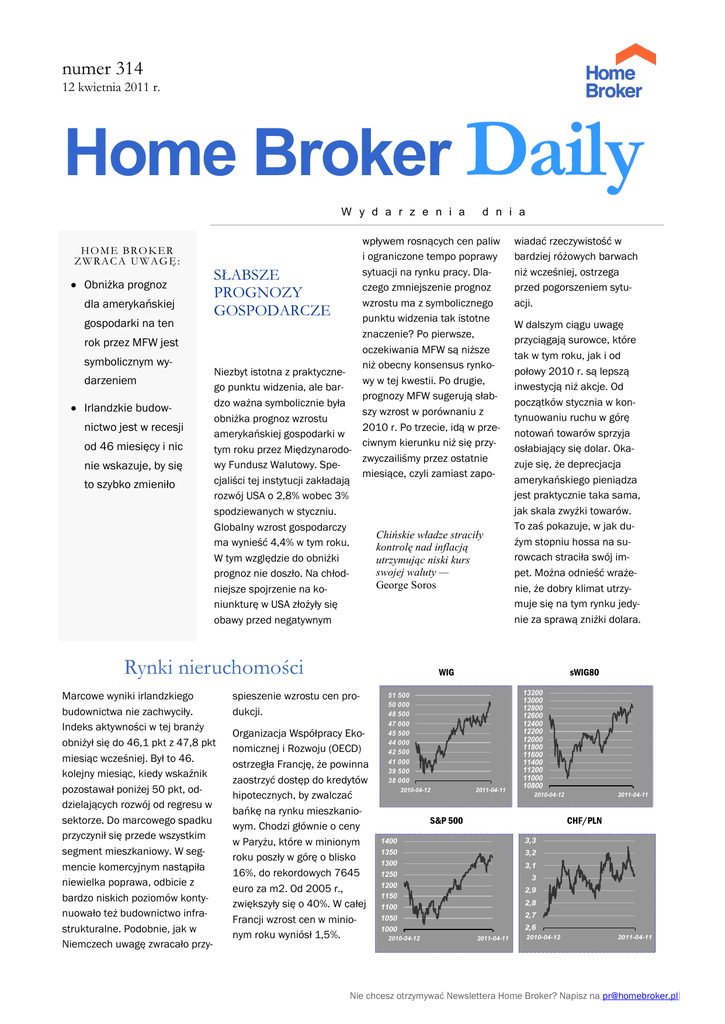 numer 314 12 kwietnia 2011 r. Home Broker Daily W y d a r z e n i a HOME BROKER ZWRACA UWAGĘ: Obniżka prognoz dla amerykańskiej gospodarki na ten rok przez MFW jest symbolicznym wydarzeniem Irlandzkie budownictwo jest w recesji od 46 miesięcy i nic nie wskazuje, by się to szybko zmieniło d n i a wpływem rosnących cen paliw i ograniczone tempo poprawy sytuacji na rynku pracy. DlaSŁABSZE czego zmniejszenie prognoz PROGNOZY wzrostu ma z symbolicznego GOSPODARCZE punktu widzenia tak istotne znaczenie? Po pierwsze, oczekiwania MFW są niższe niż obecny konsensus rynkoNiezbyt istotna z praktycznewy w tej kwestii. Po drugie, go punktu widzenia, ale barprognozy MFW sugerują słabdzo ważna symbolicznie była szy wzrost w porównaniu z obniżka prognoz wzrostu 2010 r. Po trzecie, idą w przeamerykańskiej gospodarki w ciwnym kierunku niż się przytym roku przez Międzynarodozwyczailiśmy przez ostatnie wy Fundusz Walutowy. Spemiesiące, czyli zamiast zapocjaliści tej instytucji zakładają rozwój USA o 2,8% wobec 3% spodziewanych w styczniu. Globalny wzrost gospodarczy Chińskie władze straciły ma wynieść 4,4% w tym roku. kontrolę nad inflacją W tym względzie do obniżki utrzymując niski kurs swojej waluty — prognoz nie doszło. Na chłodGeorge Soros niejsze spojrzenie na koniunkturę w USA złożyły się obawy przed negatywnym Rynki nieruchomości Marcowe wyniki irlandzkiego budownictwa nie zachwyciły. Indeks aktywności w tej branży obniżył się do 46,1 pkt z 47,8 pkt miesiąc wcześniej. Był to 46. kolejny miesiąc, kiedy wskaźnik pozostawał poniżej 50 pkt, oddzielających rozwój od regresu w sektorze. Do marcowego spadku przyczynił się przede wszystkim segment mieszkaniowy. W segmencie komercyjnym nastąpiła niewielka poprawa, odbicie z bardzo niskich poziomów kontynuowało też budownictwo infrastrukturalne. Podobnie, jak w Niemczech uwagę zwracało przy- wiadać rzeczywistość w bardziej różowych barwach niż wcześniej, ostrzega przed pogorszeniem sytuacji. W dalszym ciągu uwagę przyciągają surowce, które tak w tym roku, jak i od połowy 2010 r. są lepszą inwestycją niż akcje. Od początków stycznia w kontynuowaniu ruchu w górę notowań towarów sprzyja osłabiający się dolar. Okazuje się, że deprecjacja amerykańskiego pieniądza jest praktycznie taka sama, jak skala zwyżki towarów. To zaś pokazuje, w jak dużym stopniu hossa na surowcach straciła swój impet. Można odnieść wrażenie, że dobry klimat utrzymuje się na tym rynku jedynie za sprawą zniżki dolara. WIG spieszenie wzrostu cen produkcji. Organizacja Współpracy Ekonomicznej i Rozwoju (OECD) ostrzegła Francję, że powinna zaostrzyć dostęp do kredytów hipotecznych, by zwalczać bańkę na rynku mieszkaniowym. Chodzi głównie o ceny w Paryżu, które w minionym roku poszły w górę o blisko 16%, do rekordowych 7645 euro za m2. Od 2005 r., zwiększyły się o 40%. W całej Francji wzrost cen w minionym roku wyniósł 1,5%. 51 50 48 47 45 44 42 41 39 38 sWIG80 500 000 500 000 500 000 500 000 500 000 2010-04-12 2011-04-11 13200 13000 12800 12600 12400 12200 12000 11800 11600 11400 11200 11000 10800 2010-04-12 S&P 500 CHF/PLN 3,3 1400 1350 1300 1250 1200 1150 1100 1050 1000 2010-04-12 2011-04-11 3,2 3,1 3 2,9 2,8 2,7 2,6 2011-04-11 2010-04-12 2011-04-11 Nie chcesz otrzymywać Newslettera Home Broker? Napisz na [email protected]