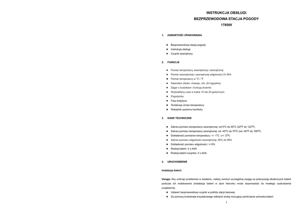 INSTRUKCJA OBSŁUGI BEZPRZEWODOWA STACJA POGODY 178509 1. 2. 3. 4. ZAWARTOŚC OPAKOWANIA Bezprzewodowa stacja pogody Instrukcja obsługi Czujnik zewnętrzny FUNKCJE Pomiar temperatury wewnętrznej i zewnętrznej Pomiar wewnętrznej i zewnętrznej wilgotności (% RH) Pomiar temperatury w C i F Kalendarz (dzień, miesiąc, rok, dni tygodnia) Zegar z budzikiem i funkcją drzemki Wyświetlany czas w trybie 12 lub 24 godzinnym. Pogodynka Fazy księżyca Tendencje zmian temperatury Wskaźnik poziomu komfortu o o DANE TECHNICZNE o o o o Zakres pomiaru temperatury wewnętrznej: od 0 C do 50 C (32 F do 122 F) Zakres pomiaru temperatury zewnętrznej: od -40 C do 70 C (od -40 F do 158 F) Dokładność pomiarów temperatury: +/- 1 C (+/- 2 F) Zakres pomiaru wilgotności wewnętrznej: 20% do 99% Dokładność pomiaru wilgotności: +/-5% Rodzaj baterii: 2 x AAA Rodzaj baterii czujnika: 2 x AAA o o o o o o URUCHOMIENIE Instalacja baterii Uwaga: Aby uniknąć problemów w działaniu, należy zwrócić szczególną uwagę na polaryzację alkalicznych baterii podczas ich instalowania (instalacja baterii w złym kierunku może doprowadzić do trwałego uszkodzenia urządzenia). Ustawić bezprzewodowy czujnik w pobliżu stacji bazowej Za pomocą śrubokręta krzyżakowego odkręcić śrubę mocującą zamknięcie schowka baterii 1 Bezprzewodowy czujnik ustawiony jest fabrycznie na kanale pierwszym, (w celu zmiany kanału należy przestawić przełącznik na pozycję 2 lub 3) Włożyć dwie baterie AAA (LR03) do bezprzewodowego czujnika. Nacisnąć przycisk C/F w celu zmiany jednostki wyświetlania temperatury Nacisnąć przycisk CH aby ustalić kanał czujnika 1,2 lub 3. Otworzyć pokrywę baterii znajdującą się na tylnej części stacji bazowej Włożyć dwie baterie AAA do stacji pogody. Po włożeniu baterii do stacji pogody słychać będzie krótki dźwięk i zapalą się na 3 s wszystkie segmenty wyświetlacza LCD. Stacja rozpocznie synchronizację z bezprzewodowym czujnikiem. Zamknąć pokrywę baterii Stacja bazowa będzie poszukiwać sygnału radiowego wysyłanego z czujnika zewnętrznego Poczekać do 3 minut aż pojawią się na wyświetlaczu odczyty temperatur z zewnętrznego czujnika bezprzewodowego UWAGA: Nie naciskać żadnych przycisków przed pojawieniem się zewnętrznych wskazań. Zamknąć pokrywę baterii w czujniku bezprzewodowym. Aby odczytywać zewnętrzną temperaturę należy umieścić czujnik na zewnątrz pomieszczenia. Czujnik będzie mierzył i wysyłał zarejestrowane wartości z miejsca, w którym jest zamontowany. Każdorazowo, gdy w czujniku zewnętrznym będą wymieniane baterie, wysyłany jest do stacji losowy kod ochronny. Następuje synchronizacja obu urządzeń. Zatem, jeśli nastąpi wymiana baterii w czujniku, stacja pogody również musi być zrestartowana przez chwilowe wyjęcie baterii, aby odzyskać kontakt z czujnikiem. Uwaga: NIE NACISKAĆ ŻADNEGO PRZYCISKU przez pierwsze 3 minuty po włożeniu baterii. Po pojawieniu się na wyświetlaczu wszystkich (wew. i zew.) mierzonych wartości, można umieścić bezprzewodowy czujnik na zewnątrz, a stację w wybranym miejscu. Jeśli na stacji pogody nie pokażą się zewnętrzne pomiary, upewnij się czy czujnik jest w zasięgu stacji lub powtórz procedurę instalacji baterii. Jeśli został naciśnięty jakiś klawisz przed pojawieniem się wszystkich odczytów na wyświetlaczu stacji, należy ponownie przeprowadzić procedurę instalacji baterii. Przed ponownym zainstalowaniem baterii prosimy poczekać minimum 10 s, aby mieć pewność, że zarówno stacja jak i czujnik zresetują się poprawnie. Uwaga: Kiedy konieczna będzie wymiana baterii w stacji, pojawi się na wyświetlaczu symbol sygnalizujący rozładowanie baterii. Prosimy chronić środowisko i oddawać zużyte baterie i akumulatorki w oznakowanych punktach. Nigdy nie wkładać baterii do ognia. Może to spowodować eksplozję, zagrożenie pożarem lub niebezpieczny wyciek chemiczny i dym. Nie należy: Umieszczać w stacji pogody jednocześnie zużytych baterii z nowymi Umieszczać jednocześnie baterii standardowych z alkalicznymi bądź z akumulatorami 2 WARUNKI GWARANCJI 1. Niniejsza gwarancja jest udzielana przez firmę BIOWIN z siedzibą przy ul. Pryncypalnej 129/141; 93-373 Łódź, nazywaną w dalszej części gwarancji Gwarantem. 2. Niniejsza gwarancja dotyczy wyłącznie sprzętu używanego na terytorium Polski. 3. Okres gwarancji wynosi 12 miesięcy od daty zakupu sprzętu. 4. W przypadku wad uniemożliwiających korzystanie ze sprzętu okres gwarancji ulega przedłużeniu o czas od dnia zgłoszenia wady do dnia wykonania naprawy. 5. Gwarancja uprawnia do bezpłatnych napraw nabytego sprzętu, polegających na usunięciu wad fizycznych, które ujawniły się w okresie gwarancyjnym, z zastrzeżeniem punktu 9. 6. Zgłoszenie wady sprzętu powinno zawierać: • dowód zakupu towaru; • nazwę i model towaru; • datę sprzedaży (bez skreśleń i poprawek); • podpis i pieczątkę sprzedawcy. 7. Gwarant w terminie 14 dni roboczych od daty zgłoszenia wady ustosunkuje się do zgłoszonej reklamacji. Jeżeli do dokonania naprawy wystąpi konieczność sprowadzenia części zamiennych z zagranicy termin naprawy może ulec przedłużeniu do czasu sprowadzenia niezbędnej elementów, lecz maksymalnie do 30 dni roboczych od daty otrzymania towaru do naprawy. 8. Reklamujący powinien dostarczyć towar odpowiednio zabezpieczony przed uszkodzeniem w czasie transportu. 9. Gwarancja nie obejmuje: • uszkodzeń mechanicznych, chemicznych, termicznych i korozji; • uszkodzeń spowodowanych działaniem czynników zewnętrznych, niezależnych od producenta, a w szczególności wynikających z użytkowania niezgodnego z Instrukcją Obsługi; • usterek powstałych w wyniku niewłaściwego montażu sprzętu • samowolnych, dokonywanych przez użytkownika lub inne nieupoważnione osoby napraw, przeróbek lub zmian konstrukcyjnych. 10. Niniejsza gwarancja ni