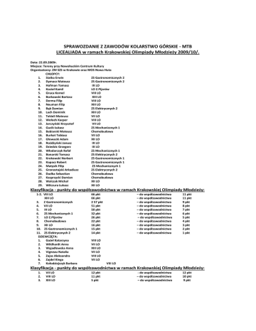 SPRAWOZDANIE Z ZAWODÓW KOLARSTWO GÓRSKIE - MTB LICEALIADA w ramach Krakowskiej Olimpiady Młodzieży 2009/10/. Data: 22.09.2009r. Miejsce: Tereny przy Nowohuckim Centrum Kultury Organizatorzy: ZM SZS w Krakowie oraz MOS Nowa Huta CHŁOPCY: 1. Siatka Erwin ZS Gastronomicznych 2 2. Dymacz Mateusz ZS Gastronomicznych 2 3. Hofman Tomasz IX LO 4. Kozioł Kamil LO Z.Pijarów 5. Gruca Kornel VIII LO 6. Borkowski Bartosz XIII LO 7. Derma Filip VIII LO 8. Neuman Filip XIII LO 9. Bąk Damian ZS Elektrycznych 2 10. Lach Dominik XIII LO 11. Tekieli Mateusz VII LO 12. Wołoch Kacper VIII LO 13. Jarczyoski Krzysztof VII LO 14. Guzik Łukasz ZS Mechanicznych 1 15. Babiarski Mateusz Chemobudowa 16. Burkot Tobiasz VII LO 17. Głowacki Adam XII LO 18. Rożdżyoski Janusz IX LO 19. Dziedzic Grzegorz IX LO 20. Włodarczyk Rafał ZS Mechanicznych 1 21. Bonarski Tomasz ZS Elektrycznych 2 22. Krokowski Norbert ZS Gastronomicznych 1 23. Kopacz Robert ZS Gastronomicznych 1 24. Matysik Filip ZS Mechanicznych 1 25. Gronostajski Arkadiusz ZS Elektrycznych 2 26. Dudka Sebastian Chemobudowa 27. Kasprzycki Damian Chemobudowa 28. Walczak Michał XII LO 29. Wilczura Łukasz XII LO Klasyfikacja - punkty do współzawodnictwa w ramach Krakowskiej Olimpiady Młodzieży: 1-2. VIII LO XIII LO 3. Z Gastronomicznych 4. VII LO 5. IX LO 6. ZS Mechanicznych 1 7. LO Z.Pijarów 8. Chemobudowa 9. XII LO 10. ZS Gastronomicznych 1 11. ZS Elektrycznych 2 DZIEWCZĘTA: 1. Gażeł Katarzyna 2. Wildhardt Anna 3. Wyjadłowska Anna 4. Vigneau Natalia 5. Zajas Aleksandra 6. Zajdel Kinga 7. Kołodziejczyk Barbara 66 pkt 66 pkt 2 57 pkt 51 pkt 50 pkt 32 pkt 26 pkt 22 pkt 16 pkt 15 pkt 14 pkt – do współzawodnictwa – do współzawodnictwa – do współzawodnictwa – do współzawodnictwa – do współzawodnictwa – do współzawodnictwa – do współzawodnictwa – do współzawodnictwa – do współzawodnictwa – do współzawodnictwa – do współzawodnictwa 11 pkt 11 pkt 9 pkt 8 pkt 7 pkt 6 pkt 5 pkt 4 pkt 3 pkt 2 pkt 1 pkt VIII LO VII LO XIII LO VII LO VIII LO VII LO VIII LO Klasyfikacja - punkty do współzawodnictwa w ramach Krakowskiej Olimpiady Młodzieży: 1. 2. 3. VII LO VIII LO XIII LO 12 pkt 11 pkt 5 pkt - do współzawodnictwa – do współzawodnictwa – do współzawodnictwa 12 pkt 10 pkt 9 pkt