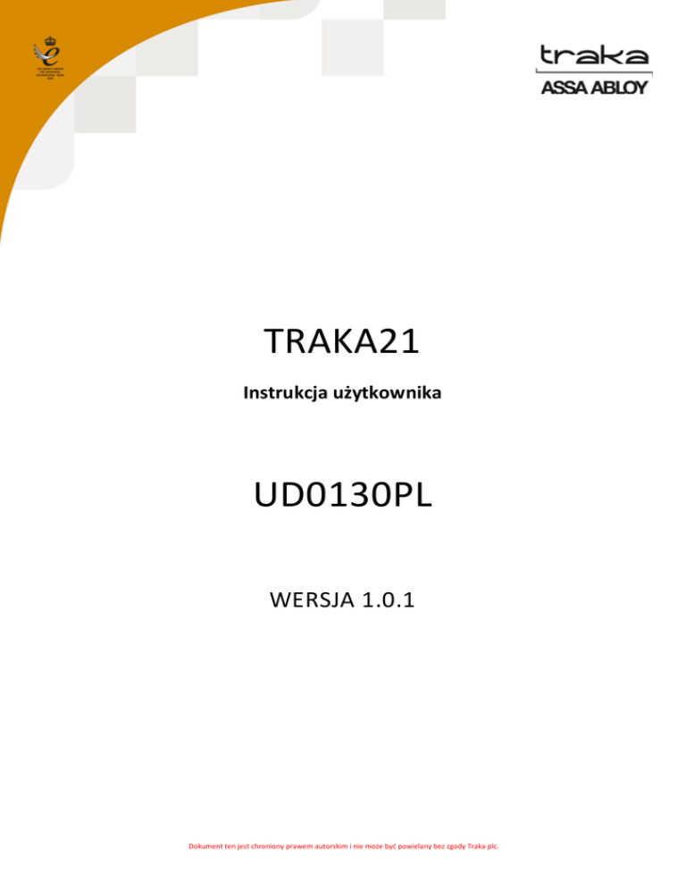 TRAKA21 Instrukcja użytkownika UD0130PL WERSJA 1.0.1 Dokument ten jest chroniony prawem autorskim i nie może być powielany bez zgody Traka plc. HISTORIA ZMIAN WERSJI Wersja 1.0 (1.3E) 1.0.1 Data 06/02/15 29/10/15 Kto MS MS V1.0.1PL 29/10/15 UD0130PL Opis zmian Tłumaczenie wersji angielskiej Poprawki tekstu, dodanie aktualizacji systemu, najcz. błędów Strona 2 z 73 Zatwierdzono SPIS TREŚCI Historia zmian wersji .......................................................................................................................................................... 2 Spis treści ............................................................................................................................................................................ 3 1. 2. Wprowadzenie ............................................................................................................................................................ 6 1.1 o Traka21 ........................................................................................................................................................... 6 1.2 Przegląd ............................................................................................................................................................. 6 Traka21 - Ogólnie ........................................................................................................................................................ 7 2.1 2.1.1 Wygaszacz ekranu ......................................................................................................................................... 7 2.1.2 Opcje dotykowe ............................................................................................................................................ 7 2.2 3. 4. Identyfikacja ...................................................................................................................................................... 7 Zaczynamy .................................................................................................................................................................. 8 3.1 Instalacja oraz montaż systemu ........................................................................................................................ 8 3.2 Kreator konfiguracji ........................................................................................................................................... 8 Korzystanie z systemu ............................................................................................................................................... 11 4.1 Logowanie do systemu .................................................................................................................................... 11 4.2 Pobranie i zwrot kluczy ................................................................................................................................... 12 4.2.1 Pobranie kluczy ........................................................................................................................................... 12 4.2.2 Zwrot kluczy ................................................................................................................................................ 13 4.3 iFob w nieprawidłowym gnieździe .................................................................................................................. 14 4.4 Ikony statusu iFobów ...................................................................................................................................... 15 4.4.1 5. Ekran dotykowy ................................................................................................................................................. 7 Pomoc ......................................................................................................................................................... 15 4.5 Podgląd iFobów ............................................................................................................................................... 16 4.6 Zmiana kodu PIN ............................................................................................................................................. 17 4.7 Klawiatura ....................................................................................................................................................... 18 Menu administracyjne .............................................................................................................................................. 19 5.1 Klucze .............................................................................................................................................................. 19 5.1.1 Dodawanie i usuwanie kluczy ..................................................................................................................... 19 5.1.2 Zamiana pozycji iFoba ................................................................................................................................. 22 V1.0.1PL 29/10/15 UD0130PL Strona 3 z 73 5.2 Użytkownicy .................................................................................................................................................... 24 5.2.1 Dodawanie standardowego użytkownika ................................................................................................... 24 5.2.2 Dodawanie użytkownika administracyjnego .............................................................................................. 26 5.2.3 Edycja użytkowników .................................................................................................................................. 28 5.2.4 Usuwanie użytkowników ............................................................................................................................ 30 5.3 Uprawnienia ..................................................