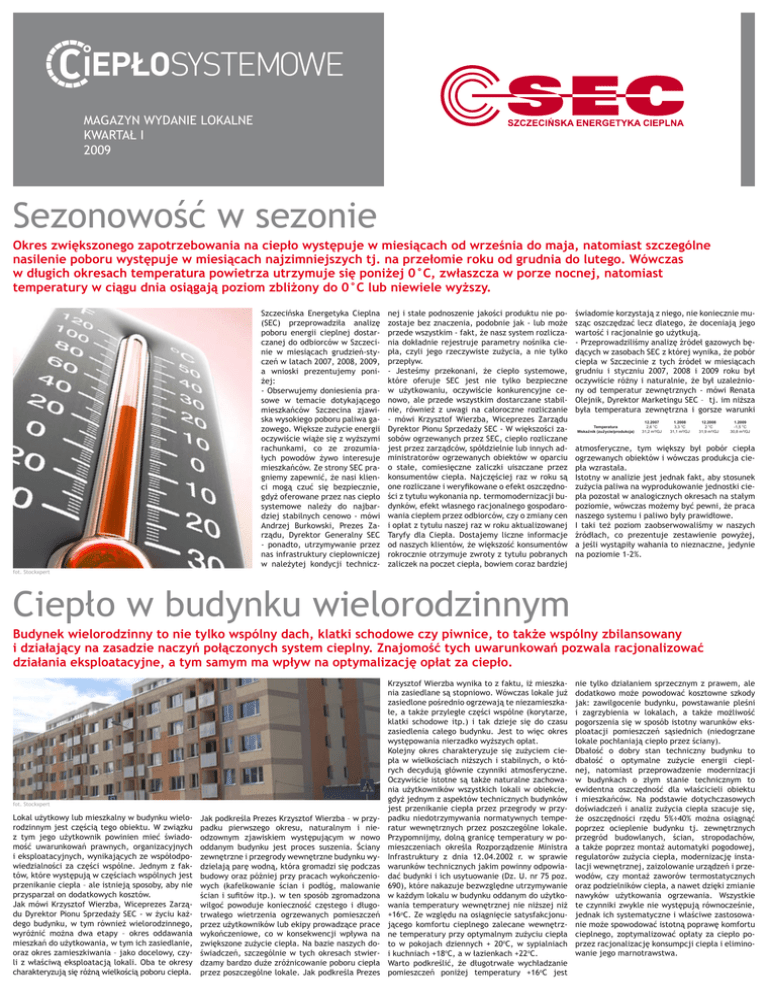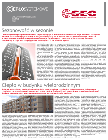 MAGAZYN WYDANIE LOKALNE KWARTAŁ I 2009 Sezonowość w sezonie Okres zwiększonego zapotrzebowania na ciepło występuje w miesiącach od września do maja, natomiast szczególne nasilenie poboru występuje w miesiącach najzimniejszych tj. na przełomie roku od grudnia do lutego. Wówczas w długich okresach temperatura powietrza utrzymuje się poniżej 0°C, zwłaszcza w porze nocnej, natomiast temperatury w ciągu dnia osiągają poziom zbliżony do 0°C lub niewiele wyższy. Szczecińska Energetyka Cieplna (SEC) przeprowadziła analizę poboru energii cieplnej dostarczanej do odbiorców w Szczecinie w miesiącach grudzień-styczeń w latach 2007, 2008, 2009, a wnioski prezentujemy poniżej: - Obserwujemy doniesienia prasowe w temacie dotykającego mieszkańców Szczecina zjawiska wysokiego poboru paliwa gazowego. Większe zużycie energii oczywiście wiąże się z wyższymi rachunkami, co ze zrozumiałych powodów żywo interesuje mieszkańców. Ze strony SEC pragniemy zapewnić, że nasi klienci mogą czuć się bezpiecznie, gdyż oferowane przez nas ciepło systemowe należy do najbardziej stabilnych cenowo - mówi Andrzej Burkowski, Prezes Zarządu, Dyrektor Generalny SEC - ponadto, utrzymywanie przez nas infrastruktury ciepłowniczej w należytej kondycji technicz- nej i stałe podnoszenie jakości produktu nie pozostaje bez znaczenia, podobnie jak - lub może przede wszystkim - fakt, że nasz system rozliczania dokładnie rejestruje parametry nośnika ciepła, czyli jego rzeczywiste zużycia, a nie tylko przepływ. - Jesteśmy przekonani, że ciepło systemowe, które oferuje SEC jest nie tylko bezpieczne w użytkowaniu, oczywiście konkurencyjne cenowo, ale przede wszystkim dostarczane stabilnie, również z uwagi na całoroczne rozliczanie - mówi Krzysztof Wierzba, Wiceprezes Zarządu Dyrektor Pionu Sprzedaży SEC - W większości zasobów ogrzewanych przez SEC, ciepło rozliczane jest przez zarządców, spółdzielnie lub innych administratorów ogrzewanych obiektów w oparciu o stałe, comiesięczne zaliczki uiszczane przez konsumentów ciepła. Najczęściej raz w roku są one rozliczane i weryfikowane o efekt oszczędności z tytułu wykonania np. termomodernizacji budynków, efekt własnego racjonalnego gospodarowania ciepłem przez odbiorców, czy o zmiany cen i opłat z tytułu naszej raz w roku aktualizowanej Taryfy dla Ciepła. Dostajemy liczne informacje od naszych klientów, że większość konsumentów rokrocznie otrzymuje zwroty z tytułu pobranych zaliczek na poczet ciepła, bowiem coraz bardziej świadomie korzystają z niego, nie koniecznie musząc oszczędzać lecz dlatego, że doceniają jego wartość i racjonalnie go użytkują. - Przeprowadziliśmy analizę źródeł gazowych będących w zasobach SEC z której wynika, że pobór ciepła w Szczecinie z tych źródeł w miesiącach grudniu i styczniu 2007, 2008 i 2009 roku był oczywiście różny i naturalnie, że był uzależniony od temperatur zewnętrznych - mówi Renata Olejnik, Dyrektor Marketingu SEC – tj. im niższa była temperatura zewnętrzna i gorsze warunki Temperatura Wskaźnik (zużycie/produkcja) 12.2007 2,6 °C 31,2 m³/GJ 1.2008 3,3 °C 31,1 m³/GJ 12.2008 2 °C 31,9 m³/GJ 1.2009 -1,5 °C 30,8 m³/GJ atmosferyczne, tym większy był pobór ciepła ogrzewanych obiektów i wówczas produkcja ciepła wzrastała. Istotny w analizie jest jednak fakt, aby stosunek zużycia paliwa na wyprodukowanie jednostki ciepła pozostał w analogicznych okresach na stałym poziomie, wówczas możemy być pewni, że praca naszego systemu i paliwo były prawidłowe. I taki też poziom zaobserwowaliśmy w naszych źródłach, co prezentuje zestawienie powyżej, a jeśli wystąpiły wahania to nieznaczne, jedynie na poziomie 1-2%. fot. Stockxpert Ciepło w budynku wielorodzinnym Budynek wielorodzinny to nie tylko wspólny dach, klatki schodowe czy piwnice, to także wspólny zbilansowany i działający na zasadzie naczyń połączonych system cieplny. Znajomość tych uwarunkowań pozwala racjonalizować działania eksploatacyjne, a tym samym ma wpływ na optymalizację opłat za ciepło. fot. Stockxpert Lokal użytkowy lub mieszkalny w budynku wielorodzinnym jest częścią tego obiektu. W związku z tym jego użytkownik powinien mieć świadomość uwarunkowań prawnych, organizacyjnych i eksploatacyjnych, wynikających ze współodpowiedzialności za części wspólne. Jednym z faktów, które występują w częściach wspólnych jest przenikanie ciepła – ale istnieją sposoby, aby nie przysparzał on dodatkowych kosztów. Jak mówi Krzysztof Wierzba, Wiceprezes Zarządu Dyrektor Pionu Sprzedaży SEC - w życiu każdego budynku, w tym również wielorodzinnego, wyróżnić można dwa etapy – okres oddawania mieszkań do użytkowania, w tym ich zasiedlanie, oraz okres zamieszkiwania – jako docelowy, czyli z właściwą eksploatacją lokali. Oba te okresy charakteryzują się różną wielkością poboru ciepła. Jak podkreśla Prezes Krzysztof Wierzba – w przypadku pierwszego okresu, naturalnym i nieodzownym zjawiskiem występującym w nowo oddanym budynku jest proces suszenia. Ściany zewnętrzne i przegrody wewnętrzne budynku wydzielają parę wodną, która gromadzi się podczas budowy oraz później przy pracach wykończeniowych (kafelkowanie ścian i podłóg, malowanie ścian i sufitów itp.). w ten sposób zgromadzona wilgoć powoduje konieczność częstego i długotrwałego wietrzenia ogrzewanych pomieszczeń przez użytkowników lub ekipy prowadzące prace wykończeniowe, co w konsekwencji wpływa na zwiększone zużycie ciepła. Na bazie naszych doświadczeń, szczególnie w tych okresach stwierdzamy bardzo duże zróżnicowanie poboru ciepła przez poszczególne lokale. Jak podkreśla Prezes Krzysztof Wierzba wynika to z faktu, iż mieszkania zasiedlane są stopniowo. Wówczas lokale już zasiedlone pośrednio ogrzewają te niezamieszkałe, a także przyległe części wspólne (kor