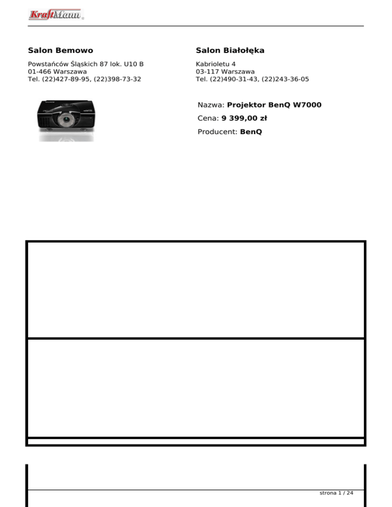 Salon Bemowo Salon Białołęka Powstańców Śląskich 87 lok. U10 B 01-466 Warszawa Tel. (22)427-89-95, (22)398-73-32 Kabrioletu 4 03-117 Warszawa Tel. (22)490-31-43, (22)243-36-05 Nazwa: Projektor BenQ W7000 Cena: 9 399,00 zł Producent: BenQ strona 1 / 24 Doskonała Jakość Wyświetlanego Obrazu Perfekcja 3D Full HD W7000+ to pierwszy projektor na świecie z strona 2 / 24 Certyfikatem akredytowanym przez TUV Rheinland 3D Full HD. Zaprojektowany, abyzaoferować najlepsze wrażenia 3D kina w domu,projektor jest zasilany przez DLP Link ™ izapewnia płynne odtwarzanie 1080p Full HD dla obu oczu. Okulary 3D, które pochodzą z dodatkowym nadajnikiem, sprawiają, że oglądanie kina strona 3 / 24 domowego jest znacznie prostsze.W7000+ jest kompatybilny z najnowszym standardem HDMI - ver. 1.4a, co oznacza, że jest w stanie odtwarzać filmy 3D zpłyt Blu-ray DVD, na żywo programy sportowe za pośrednictwem telewizji kablowej lub satelitarneji gry 3D wideo na PS3 bezpośrednio bezdodatkowej konfiguracji.. strona 4 / 24 strona 5 / 24 Full HD Optymalny System Optyczny W7000+ posiada własny, zaprojektowany przez BenQ - Full HD zoptymalizowany układ optyczny, tak aby zapewnić maksymalną czystość i ostrość w każdym wyświetlanym obrazie Full HD. Z zastosowanym systemem, wyświetlanych jest większa ilość szczegółów obrazu oraz osiągana jest lepsza strona 6 / 24 wydajność jasności.. strona 7 / 24 50000:1 Ultra Wysoki Współczynnik Kontrastu Połączone doświadczenie w proketowaniu strona 8 / 24 projektorów specjalistów BenQ oraz technologieTexas Instruments DynamicBlack ™ oraz PhilipsVidi ™, dostarczają zdumiewający współczynnik kontrastu 50,000:1 plus 2,000 AL jasności gwarantuje dobrze wyświetlony obraz nawet wnajciemniejszych scenach i każdym oświetelniu otoczenia wyświetlanej projekcji.. strona 9 / 24 Rec. 709 Gama Kolorów Dla optymalnej precyzji koloru, W7000+ jest tak zbudowany, aby dopasować jeden z najwyższychstandardów wysokiej rozdzielczości wideo widziany wprofesjonalnej jakości projektorach domowych: strona 10 / 24 NativeREC. 709 gamę kolorów. Dzięki temu projektor możedostarczyć kolory tak realne, że odzwierciedlają dokładnie to, co postrzega ludzkie oko.. strona 11 / 24 Przydatne Funkcje Zarządzanie Ustwieniami Kolorów Unikalny system zarządzania kolorami BenQ, daje dużą swobodę, tak aby dokładnie ustawić barwy, kontrast, jasność, temperaturę kolorów, gammę i poziom białych odcieni i jak najlepiej dopasować je do strona 12 / 24 Twoich indywidualnych preferencji. . Niezależna Kontrola 3D Kolorów dla 6 Podstawowych Barw To narzędzie zarządzania kolorami pozwala na indywidualne dostrojenie, wzmocnienie nasycenia odcieniasześciu podstawowych kolorów (R / G / B / C strona 13 / 24 / M / Y). Zaprogramowane Tryby i Regulacja Trybu Użytkownika strona 14 / 24 Ustaw trzy zaprogramowane tryby oraz tryb użytkownika, tak aby pasowały do Twoich indywidulanych preferencji wizualnych 2D i 3D. BenQ daje Ci dodatkową elastyczność niezbędną do personalizowania kinowej niezależności. strona 15 / 24 strona 16 / 24 Filmy na Pełnym Ekranie Obiektyw Panamorph™,pozwala wyświelać format obrazu 2,35:1wideo - takich jak filmy studyjne - w ichoryginalnym formacie panoramicznymoraz w maksymalnej rozdzielczości bez zniekształceń obrazu lub letterboxingu.. strona 17 / 24 Certyfikat ISFccc Dobierz idealnie dostosowanie jakości obrazu do fizycznego ustawienia swojego pokoju, wraz z dwoma zoptymalizowanymi trybami - ISF Day & Night dzieki kalibracji ISFccc . strona 18 / 24 strona 19 / 24 Etykiety ecoFACTS Label EcoFACTY powiedzą Ci, jak przyjazne dla środowiska są produkty BenQ! Ciągły rozwój produktów ekologicznych sprawia, że BenQ nie chce być wyłącznie zgodny z eko przepisami, ale także aktywnie chce rozwijać produkty przyjazne dla środowiska! EcoFACTY deklarują największy wysiłek BenQ w sprawie, zastąpienia strona 20 / 24 substancji niebezpiecznych, doboru materiałów, projektowania opakowań oraz projektowania energooszczędnych produktów. strona 21 / 24 Arsenic-free optical glass strona 22 / 24 BFR/PVC-free casing plastics PVC-free plastic packaging strona 23 / 24 strona 24 / 24 Powered by TCPDF (www.tcpdf.org)