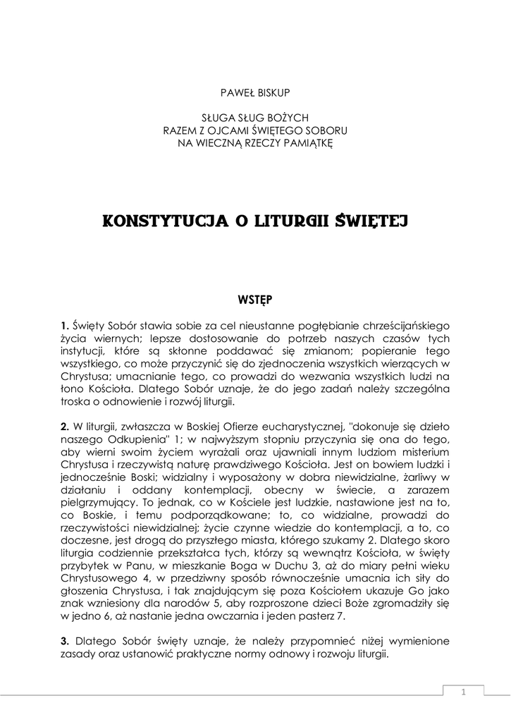 PAWEŁ BISKUP SŁUGA SŁUG BOŻYCH RAZEM Z OJCAMI ŚWIĘTEGO SOBORU NA WIECZNĄ RZECZY PAMIĄTKĘ KONSTYTUCJA O LITURGII ŚWIĘTEJ WSTĘP 1. Święty Sobór stawia sobie za cel nieustanne pogłębianie chrześcijańskiego życia wiernych; lepsze dostosowanie do potrzeb naszych czasów tych instytucji, które są skłonne poddawać się zmianom; popieranie tego wszystkiego, co może przyczynić się do zjednoczenia wszystkich wierzących w Chrystusa; umacnianie tego, co prowadzi do wezwania wszystkich ludzi na łono Kościoła. Dlatego Sobór uznaje, że do jego zadań należy szczególna troska o odnowienie i rozwój liturgii. 2. W liturgii, zwłaszcza w Boskiej Ofierze eucharystycznej, "dokonuje się dzieło naszego Odkupienia" 1; w najwyższym stopniu przyczynia się ona do tego, aby wierni swoim życiem wyrażali oraz ujawniali innym ludziom misterium Chrystusa i rzeczywistą naturę prawdziwego Kościoła. Jest on bowiem ludzki i jednocześnie Boski; widzialny i wyposażony w dobra niewidzialne, żarliwy w działaniu i oddany kontemplacji, obecny w świecie, a zarazem pielgrzymujący. To jednak, co w Kościele jest ludzkie, nastawione jest na to, co Boskie, i temu podporządkowane; to, co widzialne, prowadzi do rzeczywistości niewidzialnej; życie czynne wiedzie do kontemplacji, a to, co doczesne, jest drogą do przyszłego miasta, którego szukamy 2. Dlatego skoro liturgia codziennie przekształca tych, którzy są wewnątrz Kościoła, w święty przybytek w Panu, w mieszkanie Boga w Duchu 3, aż do miary pełni wieku Chrystusowego 4, w przedziwny sposób równocześnie umacnia ich siły do głoszenia Chrystusa, i tak znajdującym się poza Kościołem ukazuje Go jako znak wzniesiony dla narodów 5, aby rozproszone dzieci Boże zgromadziły się w jedno 6, aż nastanie jedna owczarnia i jeden pasterz 7. 3. Dlatego Sobór święty uznaje, że należy przypomnieć niżej wymienione zasady oraz ustanowić praktyczne normy odnowy i rozwoju liturgii. 1 Niektóre spośród tych zasad i norm można i trzeba odnieść zarówno do obrządku rzymskiego, jak i do wszystkich innych obrządków. Natomiast niżej podane normy praktyczne należy uważać za obowiązujące tylko dla obrządku rzymskiego, chyba że chodzi o takie sprawy, które z natury rzeczy odnoszą się także do innych obrządków. 4. Trzymając się wiernie Tradycji, Sobór święty oświadcza, że Matka Kościół uważa za równe w prawach i godności wszystkie prawnie uznane obrządki, chce je na przyszłość zachować i zapewnić im wszechstronny rozwój. Pragnie też, aby w miarę potrzeby zostały one roztropnie i gruntownie zmienione w duchu zdrowej tradycji oraz aby im nadano nową żywotność, stosownie do współczesnych warunków i potrzeb. Rozdział I OGÓLNE ZASADY ODNOWY I ROZWOJU LITURGII I. NATURA LITURGII ŚWIĘTEJ I JEJ ZNACZENIE W ŻYCIU KOŚCIOŁA 5. Bóg, który "pragnie, by wszyscy ludzie zostali zbawieni i doszli do poznania prawdy" (1 Tm 2,4), "wielokrotnie i na różne sposoby przemawiał niegdyś do naszych ojców przez proroków" (Hbr 1,1), gdy zaś nadeszła pełnia czasu, zesłał swego Syna, wcielone Słowo namaszczone Duchem Świętym, jako "lekarza ciał i dusz" 8 oraz pośrednika między Bogiem i ludźmi 9, aby głosił Ewangelię ubogim i opatrywał rany serc złamanych 10. Jego bowiem człowieczeństwo zjednoczone z osobą Słowa było narzędziem naszego zbawienia. Dlatego w Chrystusie "dokonało się nasze całkowite pojednanie z przebłaganym Bogiem i otrzymaliśmy pełnię kultu Bożego" 11. Tego zaś dzieła odkupienia ludzi i uwielbienia Boga, które zapowiadały kierowane przez Boga wielkie wydarzenia w życiu ludu Starego Testamentu, dokonał Chrystus Pan, szczególnie przez paschalne misterium swojej błogosławionej męki, zmartwychwstania i chwalebnego wniebowstąpienia; "przez swoją śmierć zniweczył śmierć naszą i zmartwychwstając, przywrócił nam życie" 12. Albowiem z boku Chrystusa umierającego na krzyżu zrodził się przedziwny sakrament całego Kościoła 13. 6. Jak Ojciec posłał Chrystusa, tak On posłał Apostołów, których napełnił Duchem Świętym, nie tylko po to, aby głosząc Ewangelię wszelkiemu stworzeniu 14, zwiastowali, że Syn Boży przez swoją śmierć i zmartwychwstanie uwolnił nas spod władzy szatana 15 i śmierci oraz przeniósł do królestwa Ojca, 2 lecz również po to, aby to dzieło zbawienia, które głosili, również sprawowali przez Ofiarę i sakramenty, wokół których skupia się całe życie liturgiczne. I tak przez chrzest ludzie zostają wszczepieni w paschalne misterium Chrystusa: z Nim współumarli, współpogrzebani i współzmartwychwstali 16, otrzymują ducha przybrania za synów, "w którym możemy wołać: <Abba, Ojcze!> (Rz 8,15), stając się prawdziwymi czcicielami, jakich Ojciec szuka 17. Podobnie ilekroć spożywają Wieczerzę Pańską, śmierć Pana głoszą, aż On przyjdzie 18. W sam dzień Pięćdziesiątnicy, kiedy Kościół ukazał się światu, "ci (...), którzy przyjęli naukę" Piotra, "zostali ochrzczeni". "Trwali oni w nauce Apostołów i we wspólnocie, w łamaniu chleba i w modlitwach (...). Wielbili Boga, a cały lud odnosił się do nich życzliwie" (Dz 2,41n. 47). Od tego czasu Kościół nigdy nie przestawał zbierać się na sprawowanie paschalnego misterium: czytając to, "co we wszystkich Pismach odnosiło się do Niego" (Łk 24,27), sprawując Eucharystię, w której "uobecnia się zwycięstwo i triumf Jego śmierci" 19, i równocześnie składając "dzięki Bogu za Jego dar niewypowiedziany" (2 Kor 9,15) w Chrystusie Jezusie, "ku chwale Jego majestatu" (Ef 1,12), przez moc Ducha Świętego. 7. Aby urzeczywistnić tak wielkie dzieło, Chrystus jest obecny zawsze w swoim Kościele, zwłaszcza w czynnościach liturgicznych. Jest obecny w ofierze Mszy świętej tak w osobie celebrującego, gdyż "Ten sam, który kiedyś ofiarował siebie na krzyżu, obecnie ofiaruje się przez posługę 