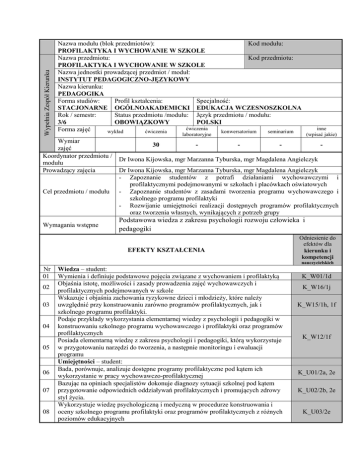 Wypełnia Zespół Kierunku Nazwa modułu (blok przedmiotów): Kod modułu: PROFILAKTYKA I WYCHOWANIE W SZKOLE Nazwa przedmiotu: Kod przedmiotu: PROFILAKTYKA I WYCHOWANIE W SZKOLE Nazwa jednostki prowadzącej przedmiot / moduł: INSTYTUT PEDAGOGICZNO-JĘZYKOWY Nazwa kierunku: PEDAGOGIKA Forma studiów: Profil kształcenia: Specjalność: STACJONARNE OGÓLNOAKADEMICKI EDUKACJA WCZESNOSZKOLNA Rok / semestr: Status przedmiotu /modułu: Język przedmiotu / modułu: 3/6 OBOWIĄZKOWY POLSKI ćwiczenia Forma zajęć wykład ćwiczenia konwersatorium seminarium inne (wpisać jakie) laboratoryjne Wymiar zajęć Koordynator przedmiotu / modułu Prowadzący zajęcia 30 - - - - Dr Iwona Kijowska, mgr Marzanna Tyburska, mgr Magdalena Angielczyk Cel przedmiotu / modułu Dr Iwona Kijowska, mgr Marzanna Tyburska, mgr Magdalena Angielczyk - Zapoznanie studentów z potrafi działaniami wychowawczymi i profilaktycznymi podejmowanymi w szkołach i placówkach oświatowych - Zapoznanie studentów z zasadami tworzenia programu wychowawczego i szkolnego programu profilaktyki - Rozwijanie umiejętności realizacji dostępnych programów profilaktycznych oraz tworzenia własnych, wynikających z potrzeb grupy Wymagania wstępne Podstawowa wiedza z zakresu psychologii rozwoju człowieka i pedagogiki EFEKTY KSZTAŁCENIA Odniesienie do efektów dla kierunku i kompetencji nauczycielskich Nr 01 02 03 04 05 06 07 08 Wiedza – student: Wymienia i definiuje podstawowe pojęcia związane z wychowaniem i profilaktyką Objaśnia istotę, możliwości i zasady prowadzenia zajęć wychowawczych i profilaktycznych podejmowanych w szkole Wskazuje i objaśnia zachowania ryzykowne dzieci i młodzieży, które należy uwzględnić przy konstruowaniu zarówno programów profilaktycznych, jak i szkolnego programu profilaktyki. Podaje przykłady wykorzystania elementarnej wiedzy z psychologii i pedagogiki w konstruowaniu szkolnego programu wychowawczego i profilaktyki oraz programów profilaktycznych Posiada elementarną wiedzę z zakresu psychologii i pedagogiki, którą wykorzystuje w przygotowaniu narzędzi do tworzenia, a następnie monitoringu i ewaluacji programu Umiejętności – student: Bada, porównuje, analizuje dostępne programy profilaktyczne pod kątem ich wykorzystanie w pracy wychowawczo-profilaktycznej Bazując na opiniach specjalistów dokonuje diagnozy sytuacji szkolnej pod kątem przygotowanie odpowiednich oddziaływań profilaktycznych i promujących zdrowy styl życia. Wykorzystuje wiedzę psychologiczną i medyczną w procedurze konstruowania i oceny szkolnego programu profilaktyki oraz programów profilaktycznych z różnych poziomów edukacyjnych K_W01/1d K_W16/1j K_W15/1h, 1f K_W12/1f K_U01/2a, 2e K_U02/2b, 2e K_U03/2e Podejmuje dyskusje w trakcie pracy zespołowej przy tworzeniu szkolnego programu profilaktyki i elementów programów profilaktycznych, na temat realizacji celów i 09 zadań wynikających ze szkolnego programu wychowawczego i profilaktyki oraz programów profilaktycznych Kompetencje społeczne – student: Wyraża opinie o sensie, wartościach i konieczności podejmowania działań 10 wychowawczych i profilaktycznych w szkole TREŚCI PROGRAMOWE Forma zajęć – WYKŁAD K_U13/2i, 2m K_K03/3b Forma zajęć – ĆWICZENIA Działania wychowawcze i profilaktyczne w świetle aktów prawnych Podstawowe pojęcia związane z wychowaniem i profilaktyką w szkole Szkolny program wychowawczy, profilaktyki a programy profilaktyczne Profilaktyka w szkole - istota, możliwości i zasady prowadzenia zajęć profilaktycznych Procedura konstruowania szkolnego programu profilaktyki Szkolny program profilaktyki na różnych poziomach edukacyjnychIdentyfikacja potrzeb i problemów uczniów – zachowania ryzykowne dzieci i młodzieży Diagnoza sytuacji szkolnej Konceptualizacja szkolnego programu profilaktyki - określenie celu programu i listy zadań szkoły realizowanych w ramach profilaktyki Monitoring i ewaluacja programu Szkolny program profilaktyki na poszczególnych etapach edukacyjnych Przegląd wybranych programów profilaktycznych Filmy, wykład z prezentacją multimedialną, objaśnieniami oraz metody oparte na praktycznej działalności uczniów, ćwiczenia przedmiotowe (w formie pracy w Metody kształcenia zespołach zadaniowych, pracy parach) Metody weryfikacji efektów kształcenia Nr efektu kształcenia z sylabusa 9,10 Indywidualne i grupowe rozwiązywanie zadań w ramach ćwiczeń i zadań domowych 5, 6, 7,8 Projekt programu profilaktycznego lub scenariusz zajęć profilaktycznych – do wyboru 1-4, 7,9,10 Test wyboru oraz z 3 pytaniami otwartymi – problemami lub esej EGZAMIN Forma i warunki - sprawdzenie znajomości treści przedmiotu (50%) zaliczenia - opracowanie projektu programu profilaktycznego lub scenariusza zajęć profilaktycznych (50%) Literatura podstawowa 1. J. Szymańska, Programy profilaktyczne. Podstawy profesjonalnej psychoprofilaktyki, ORE, Warszawa 2012 2. Z. B. Gaś, Szkolny program profilaktyki: istota, konstruowanie, ewaluacja, Funadacja „Zasz Szansę”, Lublin 2004 3. J. Elliott, M. Place, Dzieci i młodzież w kłopocie. Poradnik nie tylko dla psychologów, WSiP, Warszawa 2000 4. M. Lakomski, Dlaczego integralny program profilaktyczny w szkole?, Impuls 2004 5. M. Deptuła (red.) Diagnostyka pedagogiczna i profilaktyka w szkole i środowisku lokalnym, Wydawnictwo Akademii Bydgoskiej, Bydgoszcz 2004 6. B. Woynarowska (red.) Organizacja i realizacja edukacji zdrowotnej w szkole. Poradnik dla dyrektorów szkół i nauczycieli, ORE, Warszawa 2012 Literatura uzupełniająca 1. B. Skałabania, Poradnictwo pedagogiczne. Przegląd wybranych zagadnień, Impuls Kraków 2009 2. M. Prajsner, Młodzież z grup ryzyka, PARPA, Warszawa 2003 3. Wojtczak A.: Zdrowie publiczne wyzwaniem dla systemów zdrowia XXI wieku, Warszawa, PZWL, 2009 4. M. Simm, W. Węgrzyn-Jonek, Budowanie szkolnego programu profilaktyki, Rubikon, Kraków 2002 NAKŁAD PRACY STUDENTA: Liczba godzin Udział w 