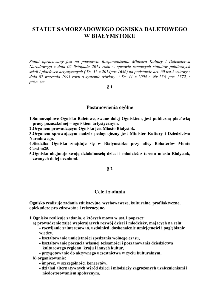 STATUT SAMORZADOWEGO OGNISKA BALETOWEGO W BIAŁYMSTOKU Statut opracowany jest na podstawie Rozporządzenia Ministra Kultury i Dziedzictwa Narodowego z dnia 05 listopada 2014 roku w sprawie ramowych statutów publicznych szkół i placówek artystycznych ( Dz. U. z 2014poz.1646),na podstawie art. 60 ust.2 ustawy z dnia 07 września 1991 roku o systemie oświaty ( Dz. U. z 2004 r. Nr 256, poz. 2572, z późn. zm. §1 Postanowienia ogólne 1.Samorządowe Ognisko Baletowe, zwane dalej Ogniskiem, jest publiczną placówką pracy pozaszkolnej – ogniskiem artystycznym. 2.Organem prowadzącym Ognisko jest Miasto Białystok. 3.Organem sprawującym nadzór pedagogiczny jest Minister Kultury i Dziedzictwa Narodowego. 4.Siedziba Ogniska znajduje się w Białymstoku przy ulicy Bohaterów Monte Cassino25. 5.Ognisko obejmuje swoją działalnością dzieci i młodzież z terenu miasta Białystok, zwanych dalej uczniami. §2 Cele i zadania Ognisko realizuje zadania edukacyjne, wychowawcze, kulturalne, profilaktyczne, opiekuńcze pro zdrowotne i rekreacyjne. 1.Ognisko realizuje zadania, o których mowa w ust.1 poprzez: a) prowadzenie zajęć wspierających rozwój dzieci i młodzieży, mających na celu: - rozwijanie zainteresowań, uzdolnień, doskonalenie umiejętności i pogłębianie wiedzy, - kształtowanie umiejętności spędzania wolnego czasu, - kształtowanie poczucia własnej tożsamości i poszanowania dziedzictwa kulturowego regionu, kraju i innych kultur, - przygotowanie do aktywnego uczestnictwa w życiu kulturalnym, b) organizowanie: - imprez, w szczególności koncertów, - działań alternatywnych wśród dzieci i młodzieży zagrożonych uzależnieniami i niedostosowaniem społecznym, c ) realizowanie programów edukacyjnych i profilaktyczno – wychowawczych. 2.Ognisko wykonuje swoje zadania z uwzględnieniem potrzeb środowiska lokalnego. 3.Ognisko może realizować zadania także poza swoją siedzibą, o której mowa w §1 ust.4. 4.Ognisko może nawiązywać współpracę z innymi placówkami, organizacjami i instytucjami o podobnym profilu i zakresie działania w kraju i za granicą oraz rodzinami uczniów i środowiskiem lokalnym poprzez: a) wspólne organizowanie imprez, b) pozyskiwanie dodatkowych źródeł finansowania działalności Ogniska. c)organizowanie spotkań z rodzicami uczniów oraz przedstawicielami środowiska lokalnego mających na celu wspierania procesu wychowania i działań Ogniska na rzecz podnoszenia jakości pracy placówki. §3 Organy Ogniska 1.Organami Ogniska są: a) Dyrektor Ogniska, b) Rada Pedagogiczna, c) Rada Rodziców 2.Organy o których mowa w ust.1 działają zgodnie z regulaminami swojej działalności, które nie mogą być sprzeczne ze Statutem Ogniska. 3. Każdy z organów Ogniska ma możliwość swobodnego działania i podejmowania decyzji w ramach swoich kompetencji . 4.Zasady współdziałania organów, o których mowa w ust.1 a) między organami Ogniska powinna następować wymiana informacji o podejmowanych decyzjach i planach działania, b) dyrektor Ogniska i przedstawiciele innych organów są zobowiązani do udzielenia wyczerpującej odpowiedzi na pytania postawione przez inne organy w ciągu 14 dni. c) sprawy sporne pomiędzy pozostałymi organami rozstrzyga Dyrektor Ogniska, d) w sprawach spornych pomiędzy dyrektorem a pozostałymi organami Ogniska, strony mogą odwołać się do organu prowadzącego lub sprawującego nadzór pedagogiczny. §4 Dyrektor Ogniska 1.Dyrektor Ogniska kieruje działalnością placówki i reprezentuje ją na zewnątrz. 2.Dyrektor sprawuje nadzór pedagogiczny na zasadach określonych odrębnymi przepisami. 3.Dyrektor sprawuje opiekę nad wychowankami oraz stwarza warunki do pełnego rozwoju dzieci i młodzieży. 4.Dyrektor realizuje uchwały Rady Pedagogicznej i Rady Rodziców. 5.Dyrektor dysponuje środkami określonymi w planie finansowym Ogniska, ponosi odpowiedzialność za ich prawidłowe wykorzystanie oraz przedstawia projekt planu do zaopiniowania Radzie Pedagogicznej. 6.Dyrektor jest kierownikiem zakładu pracy dla zatrudnionych w Ognisku nauczycieli pracowników, nie będących nauczycielami: a) zatrudnia i zwalnia nauczycieli oraz innych pracowników Ogniska, b) przyznaje nagrody oraz w razie potrzeby wymierza kary nauczycielom oraz innym pracownikom Ogniska, c) występuje z wnioskami, po zasięgnięciu opinii Rady Pedagogicznej w sprawach odznaczeń, nagród i innych wyróżnień dla nauczycieli oraz pozostałych pracowników Ogniska, 4) ustala szczegółowy zakres obowiązków dla nauczycieli i pozostałych pracowników Ogniska. 7.Dyrektor Ogniska, w wykonaniu swoich zadań, współpracuje z Radą Pedagogiczną, i z Radą Rodziców. 8.Dyrektor Ogniska kształtuje twórczą atmosferę pracy, właściwe warunki pracy i stosunki pracownicze. 9.Dyrektor Ogniska zapewnia odpowiedni stan bezpieczeństwa i higieny pracy, zgodnie z odrębnymi przepisami. 10.Dyrektor Ogniska wykonuje inne zadania wynikające z przepisów szczegółowych. §5 Rada Pedagogiczna 1.W skład Rady Pedagogicznej wchodzą wszyscy nauczyciele zatrudnieni w Ognisku. 2.Przwodniczącym Rady Pedagogicznej jest Dyrektor Ogniska. 3.Zebrania Rady Pedagogicznej są organizowane nie rzadziej niż trzy razy w roku szkolnym oraz w miarę bieżących potrzeb. 4.Zebrania mogą być organizowane z inicjatywy przewodniczącego oraz na wniosek: a) organu sprawującego nadzór pedagogiczny, b) organu prowadzącego placówkę, c) co najmniej 1/3 członków Rady Pedagogicznej. 5.Do kompetencji stanowiących Rady Pedagogicznej należy: a) zatwierdzanie planów pracy Ogniska, b) podejmowanie uchwał w sprawie innowacji i eksperymentów pedagogicznych w Ognisku, c) podejmowanie uchwał w sprawie skreślenia z listy uczestników. 6.Rada Pedagogiczna opiniuje w szczególności : a) organizację pracy Ogniska, w tym zwłaszcza tygodniowy rozkład zajęć, b) projekt planu finansowego, c) wnioski Dyrektora o przyznanie nauczycielom odznaczeń, nagród i