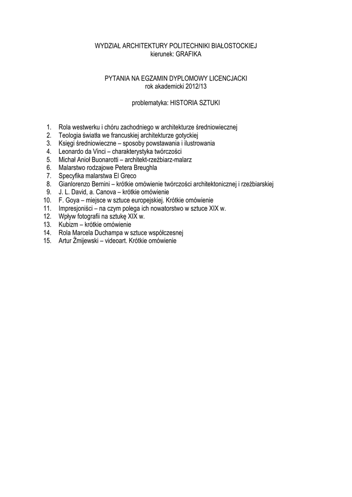 WYDZIAŁ ARCHITEKTURY POLITECHNIKI BIAŁOSTOCKIEJ kierunek: GRAFIKA PYTANIA NA EGZAMIN DYPLOMOWY LICENCJACKI rok akademicki 2012/13 problematyka: HISTORIA SZTUKI 1. 2. 3. 4. 5. 6. 7. 8. 9. 10. 11. 12. 13. 14. 15. Rola westwerku i chóru zachodniego w architekturze średniowiecznej Teologia światła we francuskiej architekturze gotyckiej Księgi średniowieczne – sposoby powstawania i ilustrowania Leonardo da Vinci – charakterystyka twórczości Michał Anioł Buonarotti – architekt-rzeźbiarz-malarz Malarstwo rodzajowe Petera Breughla Specyfika malarstwa El Greco Gianlorenzo Bernini – krótkie omówienie twórczości architektonicznej i rzeźbiarskiej J. L. David, a. Canova – krótkie omówienie F. Goya – miejsce w sztuce europejskiej. Krótkie omówienie Impresjoniści – na czym polega ich nowatorstwo w sztuce XIX w. Wpływ fotografii na sztukę XIX w. Kubizm – krótkie omówienie Rola Marcela Duchampa w sztuce współczesnej Artur śmijewski – videoart. Krótkie omówienie