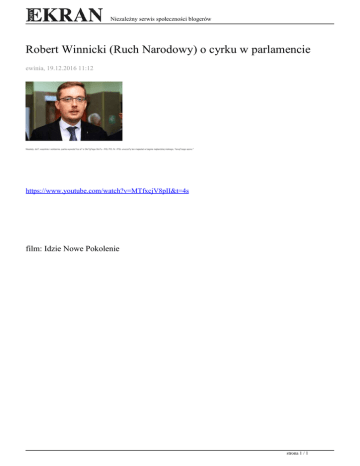 Niezależny serwis społeczności blogerów Robert Winnicki (Ruch Narodowy) o cyrku w parlamencie ewinia, 19.12.2016 11:12 Niestety, dzi?, wspólnie i solidarnie, partie wywodz?ce si? z Okr?g?ego Sto?u - PiS, PO, N. i PSL unurza?y ten majestat w bagnie najbardziej niskiego, ?enuj?cego sporu." https://www.youtube.com/watch?v=MTfxcjV8pII&t=4s film: Idzie Nowe Pokolenie strona 1 / 1 Powered by TCPDF (www.tcpdf.org)