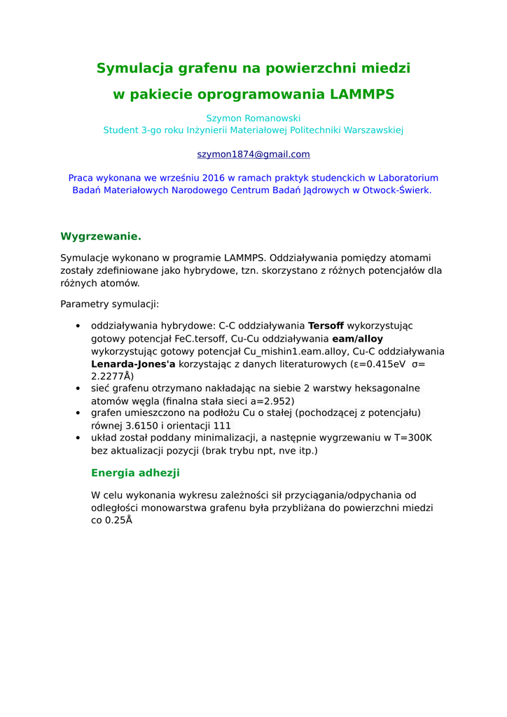 Symulacja grafenu na powierzchni miedzi w pakiecie oprogramowania LAMMPS Szymon Romanowski Student 3-go roku Inżynierii Materiałowej Politechniki Warszawskiej [email protected] Praca wykonana we wrześniu 2016 w ramach praktyk studenckich w Laboratorium Badań Materiałowych Narodowego Centrum Badań Jądrowych w Otwock-Świerk. Wygrzewanie. Symulacje wykonano w programie LAMMPS. Oddziaływania pomiędzy atomami zostały zdefiniowane jako hybrydowe, tzn. skorzystano z różnych potencjałów dla różnych atomów. Parametry symulacji: oddziaływania hybrydowe: C-C oddziaływania Tersof wykorzystując gotowy potencjał FeC.tersoff, Cu-Cu oddziaływania eam/alloy wykorzystując gotowy potencjał Cu_mishin1.eam.alloy, Cu-C oddziaływania Lenarda-Jones'a korzystając z danych literaturowych (ε=0.415eV σ= 2.2277Å) sieć grafenu otrzymano nakładając na siebie 2 warstwy heksagonalne atomów węgla (finalna stała sieci a=2.952) grafen umieszczono na podłożu Cu o stałej (pochodzącej z potencjału) równej 3.6150 i orientacji 111 układ został poddany minimalizacji, a następnie wygrzewaniu w T=300K bez aktualizacji pozycji (brak trybu npt, nve itp.) Energia adhezji W celu wykonania wykresu zależności sił przyciągania/odpychania od odległości monowarstwa grafenu była przybliżana do powierzchni miedzi co 0.25Å Wyniki: Energia układu [eV/Å2] 8 6 4 2 0 -2 0 0.5 1 1.5 2 2.5 3 3.5 4 4.5 5 5.5 6 6.5 7 7.5 8 -4 -6 odległość [Å] Energia układu [eV/Å2] W tej formie wykresu widać jedynie wzrost energii przy zbliżaniu. Jednak jeśli pominiemy wartości, które różnią się o więcej niż 1 to możemy zaobserwować minimum funkcji w odległości 1.5Å -3.4 -3.450.5 1 1.5 2 2.5 3 3.5 4 4.5 5 5.5 6 6.5 7 7.5 8 -3.5 -3.55 -3.6 -3.65 -3.7 -3.75 -3.8 -3.85 odległość [Å] Energia adhezji grafenu na podłożu miedzianym wynikająca z wykresu wynosi -0,10839 eV/Å2. Wygrzewanie Przed bombardowaniem każdy układ został wygrzany przez 100 tyś. kroków i zapisany w formie pliku restart. Wygrzane zostały 4 układy: A. grafen na podłożu miedzianym zawierający 3598 atomów w tym 900 atomów grafenu B. grafen na podłożu miedzianym zawierający 10800 atomów w tym 2700 atomów grafenu C. grafen zawierający 2700 atomów D. grafen zawierający 2345 atomów pozbawiony periodyczności w każdym kierunku Powyższe rysunki przedstawiają strukturę wejściową. Oznaczenia: żółty- atomy grafenu, czerwony - 1 warstwa atomów miedzi, fioletowy - 2 warstwa atomów miedzi, niebieski - 3 i dalsze warstwy atomów miedzi. Z literatury wynika, że ułożenie atomów grafenu najkorzystniejsze jest w przypadku, gdy znajdują się one nad 1 i 3 warstwą, a w drugiej kolejności ułożenie nad 1 i 2 warstwą miedzi. W naszym przypadku najkorzystniejsza okazała się struktura, w której grafen znajduje się nad 1 i 2 warstwą. A) Opis symulacji symulacja w 3 wymiarach, układ periodyczny w osi y i z sieć grafenu otrzymano nakładając na siebie 2 warstwy heksagonalne atomów węgla o stałej sieci 3.6150 ⁄ √ 2 grafen umieszczono na podłożu Cu o stałej (pochodzącej z potencjału) równej 3.6150 i orientacji 111 oddziaływania hybrydowe: C-C oddziaływania Tersof wykorzystując gotowy potencjał FeC.tersoff, Cu-Cu oddziaływania eam/alloy wykorzystując gotowy potencjał Cu_mishin1.eam.alloy, Cu-C oddziaływania Lenarda-Jones'a korzystając z danych literaturowych (ε=0.415eV σ= 2.2277Å) oraz odcięcie 7 Å masy Cu=63.55 g/mol i C=12.01g/mol układ został poddany wygrzewaniu w T=300K w trybie nvt z Tdump=0.1 przez 100 tyś kroków wyniki symulacji zostały zapisane w formie pliku restart B. Opis symulacji Układ różni się od układu A jedynie rozmiarem obszaru symulacji. Zawiera ok. 3 razy więcej atomów. symulacja w 3 wymiarach, układ periodyczny w osi y i z sieć grafenu otrzymano nakładając na siebie 2 warstwy heksagonalne atomów węgla o stałej sieci 3.6150 ⁄ √ 2 grafen umieszczono na podłożu Cu o stałej (pochodzącej z potencjału) równej 3.6150 i orientacji 111 oddziaływania hybrydowe: C-C oddziaływania Tersof wykorzystując gotowy potencjał FeC.tersoff, Cu-Cu oddziaływania eam/alloy wykorzystując gotowy potencjał Cu_mishin1.eam.alloy, Cu-C oddziaływania Lenarda-Jones'a korzystając z danych literaturowych (ε=0.415eV σ= 2.2277Å) oraz odcięcie 7 Å masy Cu=63.55 g/mol i C=12.01g/mol układ został poddany wygrzewaniu w T=300K w trybie nvt z Tdump=0.1 przez 100 tyś kroków wyniki symulacji zostały zapisane w formie pliku restart Powyższe rysunki przedstawiają strukturę po wygrzaniu. C. Opis symulacji Układ różni się od układu B tym, że nie zostało zastosowane podłoże miedziane. Grafen trzyma się ze względu na warunki brzegowe (periodyczność sieci grafenu w osi y i z ) symulacja w 3 wymiarach, układ periodyczny w osi y i z sieć grafenu otrzymano nakładając na siebie 2 warstwy heksagonalne atomów węgla o stałej sieci 3.6150 ⁄ √ 2 oddziaływania hybrydowe: C-C oddziaływania Tersof wykorzystując gotowy potencjał FeC.tersoff, Cu-Cu oddziaływania eam/alloy wykorzystując gotowy potencjał Cu_mishin1.eam.alloy, Cu-C oddziaływania Lenarda-Jones'a korzystając z danych literaturowych (ε=0.415eV σ= 2.2277Å) oraz odcięcie 7 Å masy Cu=63.55 g/mol i C=12.01g/mol układ został poddany wygrzewaniu w T=300K w trybie nvt z Tdump=0.1 przez 100 tyś kroków wyniki symulacji zostały zapisane w formie pliku restart Powyższe rysunki przedstawiają strukturę po wygrzaniu. D. Opis symulacji Układ różni się od układu C tym, że grafen został pozbawiony periodyczności oraz nie dotyka ścianek obszaru symulacji. symulacja w 3 wymiarach, układ nie periodyczny sieć grafenu otrzymano nakładając na siebie 2 warstwy heksagonalne atomów węgla o stałej sieci 3.6150 ⁄ √ 2 oddziaływania hybrydowe: C-C oddziaływania Tersof wykorzystując gotowy potencjał FeC.tersoff, Cu-Cu oddziaływania eam/alloy wykorzystując gotowy potencj