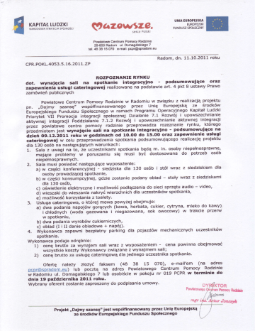 UiIIAEURO?FJsKA EUROPEJSKI SPOTECZNY FUNDUSZ ()azowlza, LUDZKI KAPITAI. SPOJNOSCI NARODOWA5TRATECIA CentrumPomocyRodzinie Pow¡atowe 7 26€00 Radom ul. Domagalskiego tel.48 38 15070 e-mail:[email protected] Radom.dn. 11.10.2011roku .5.16.20lr.zP cPR.POKL.4053 ROZPOZNANIERYNKU - podsumowuiEce oraz dot. wynaiQc¡a sal¡ na spotkan¡e integracyino podstawie art.4 pkt 8 ustawy Prawo iapewníeniá-uslugi cater¡ngowei realizowanena zamówieñpublicznych PowiatoweCentrum PomocyRodziniew Radomiuw zwiAzkuz realizacjAprojektu nego pftez Un¡Q EuropejskE ze érodków pn. ,,Dajmy szansq" wspólfinánsowa Erropéjtt¡"éo Funduizu spólecznegow ramach Programuoperacyjnego Kap¡tal,Ludzki pr¡orytét VI-I promoc¡a ¡ntegracji épolecznej.Dzialan¡e7.1 Rozwój i upowszechnianie aktywne¡ integracji poddziaianie7 'L.2 Rozwój i upowszechnianieaktywnej integracji rozeznanie rynku, którego przéz pówiatñe centra pomocy rodzinie przepror,rradza - podsumowuiqce na ¡ntegracyino jest na spotkan¡e sali wynaiQcie iri"amiot"m 'dzieít Og.t2.2O11 ioku w godz¡nach od 1O,OOdo 15,OO oraz zapewnienie uslugi projektu cateringowej w celu przepówadzen¡aspotkania podsumowujEcegorealizacie warunkach: dla 130 osób na nastQpujacych 1. Sala z uwagi na to, Ze uczestnikamispotkania bqdq m, in. osoby niepelnosprawne' majEce problemy w poruszaniu sie mus¡ byC áostosowana do Potrzeb osób n¡epelnosprawnYch. 2. Sala musi posiadaénastQpujqcewyposazenie: - s¡edl¡ska dla 130 osób i stól wraz z siedziskiemdla á) * czeéii t<onferency¡ñL¡ osoby ProwadzqcejsPotkanie' ¡) w czéSc¡konsumpiyjne¡, gdzie zostanie podany obiad stoly wraz z s¡edziskami dla 130 osób, c) oéwietlen¡eeiektrycznei mo2liwoéépodlEczeniado sieci sprzetuaudio video' dl wieszakido wieszanianakryéwierzchn¡chdla uczestnikówspotkania' e) mo2liwoéókorzystan¡az toalety. 3. Uslugacateringowa,o której mowa powy2ejobejmuje: ul áúi po¿unÉ naóojów gorqcych (kawa, herbata, cukier, cytryna, mleko do kawv) ichtodnych (woda gazowana i niegazowana,sok owocowy) w trakc¡e przerw w spotkaniu, b) dwa podaniawyrobów cukierniczych, c) obiad (I i II danie obiadowe+ napój). 4.WykonawcazapewnibezplatnypartingotapojazdówmechanicznychuczestnikóW sDotkania. Wykonawcapodaje odrQbnie: 1)' cenq brutto za wynajem sali wraz z wyposazeniem cena powinna obejmowaé wszystkiekoszty Wykonawcyzwiezanez wynajmem sal¡; 2) cenq brutto za uslugQcateringowadla jednego uczestn¡kaspotkania' OfertQ nale2y zto2yé faksem (48 38 15 O7O)' e-mail'em (na adres eu) iub poiztE na adres Powiatowego Centrum Pomocy Rodzinie ocpr@soradom, * R"do-" ul. Domagalskiego7 lub osobiéciew pokoju nr 019 PCPRw terminie do dnia 19 paÍdziernika 2011 roku. Wybrany oferent zostanie zaptoszonYdo podpisan¡aumowy. IJ OR Powiatowegl Pomocy fodrib nw Projekt,,Dajmy€zanse"jest wspólfinansowanypnzezUnie Europe¡skq ze érodków EuropejskiegoFunduszuSpolecznego JoneSh