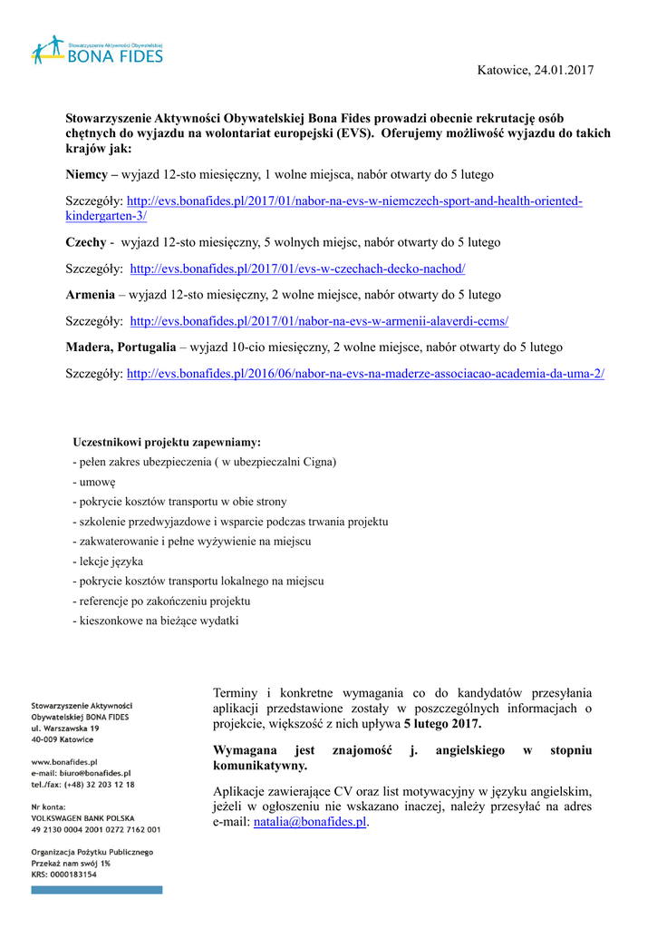 Katowice, 24.01.2017 Stowarzyszenie Aktywności Obywatelskiej Bona Fides prowadzi obecnie rekrutację osób chętnych do wyjazdu na wolontariat europejski (EVS). Oferujemy możliwość wyjazdu do takich krajów jak: Niemcy – wyjazd 12-sto miesięczny, 1 wolne miejsca, nabór otwarty do 5 lutego Szczegóły: http://evs.bonafides.pl/2017/01/nabor-na-evs-w-niemczech-sport-and-health-orientedkindergarten-3/ Czechy - wyjazd 12-sto miesięczny, 5 wolnych miejsc, nabór otwarty do 5 lutego Szczegóły: http://evs.bonafides.pl/2017/01/evs-w-czechach-decko-nachod/ Armenia – wyjazd 12-sto miesięczny, 2 wolne miejsce, nabór otwarty do 5 lutego Szczegóły: http://evs.bonafides.pl/2017/01/nabor-na-evs-w-armenii-alaverdi-ccms/ Madera, Portugalia – wyjazd 10-cio miesięczny, 2 wolne miejsce, nabór otwarty do 5 lutego Szczegóły: http://evs.bonafides.pl/2016/06/nabor-na-evs-na-maderze-associacao-academia-da-uma-2/ Uczestnikowi projektu zapewniamy: - pełen zakres ubezpieczenia ( w ubezpieczalni Cigna) - umowę - pokrycie kosztów transportu w obie strony - szkolenie przedwyjazdowe i wsparcie podczas trwania projektu - zakwaterowanie i pełne wyżywienie na miejscu - lekcje języka - pokrycie kosztów transportu lokalnego na miejscu - referencje po zakończeniu projektu - kieszonkowe na bieżące wydatki Terminy konkretne wymagania co do kandydatów przesyłania Aplikacje zawierające CV oraz i list motywacyjny w języku aplikacji przedstawione poszczególnych informacjach o angielskim, jeżeli w ogłoszeniu nie wskazano zostały inaczej,w należy projekcie, większość z nich upływa 5 lutego 2017. przesyłać na adres e-mai: [email protected]. Wymagana jest znajomość j. angielskiego w stopniu komunikatywny. Terminy przesyłania aplikacji przedstawione zostały w Aplikacje zawierające CV orazinformacjach list motywacyjny w języku angielskim, poszczególnych w ogłoszeniu nie wskazano inaczej, należy przesyłać na adres o projekcie, większość z jeżeli nich upływa już w marcu lub początkiem e-mail: [email protected]. kwietnia. Aplikacje zawierające CV oraz list motywacyjny w języku angielskim, jeżeli w ogłoszeniu nie wskazano inaczej, należy przesyłać na adres e-mai: [email protected]. Aplikacje zawierające CV oraz list motywacyjny w języku angielskim, jeżeli w ogłoszeniu nie wskazano inaczej, należy przesyłać na adres e-